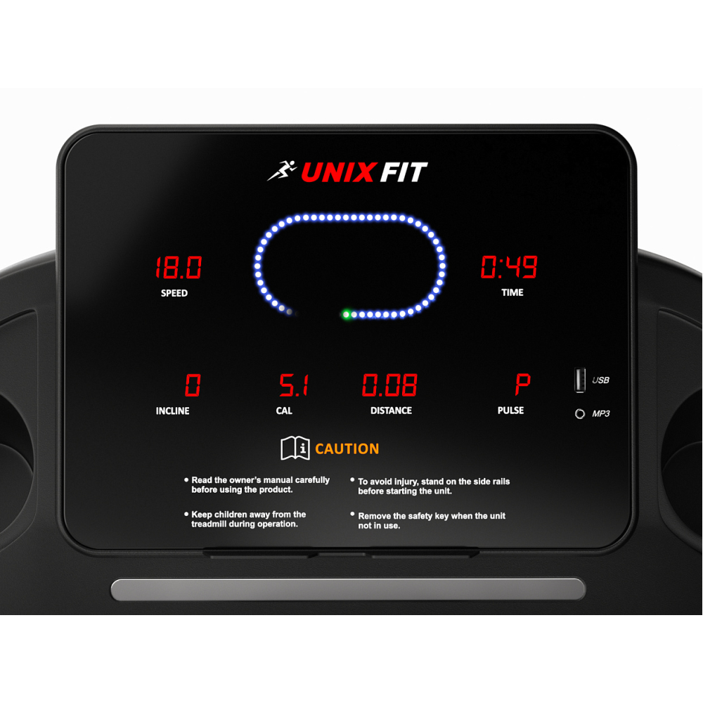 Беговые дорожки торговой марки UNIX Fit™ серии ST – это надежность и компактность. Они сочетают в себе все основные функции, необходимые для успешной тренировки. Модель UNIX Fit ST-630R отличает стильный дизайн и информативная панель управления. Модель представлена в двух цветах - белом и черном. Все необходимые для тренировки показатели отображают 6 (шесть) LED дисплеев. Двухслойное беговое полотно толщиной 1,6 мм. Длина зоны для бега составляет 122 сантиметра, а ширина - 42,5 сантиметра. Максимальная скорость бега на данной модели составляет 14 км/ч. Так же, модель оборудована двумя динамиками суммарной мощностью 4 кВ в возможностью подключения внешних устройств с помощью входов USB и AUX. *Для данной модели подходит коврик UNIX Fit 190x75 см.