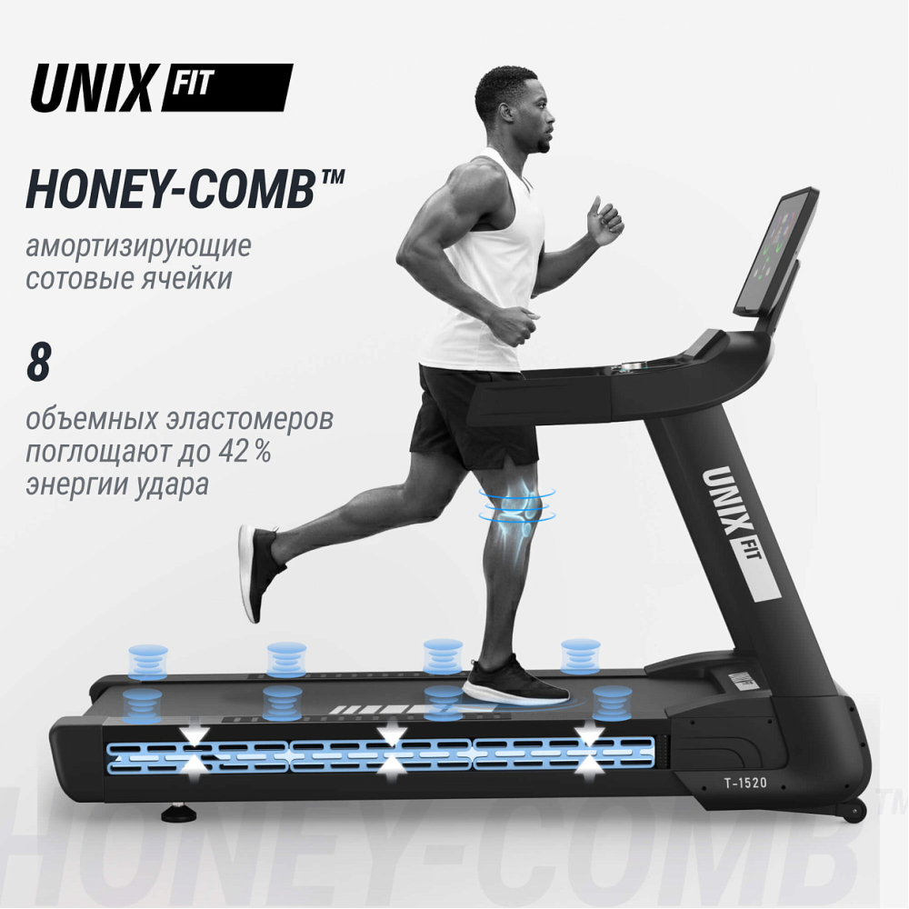 Профессиональная беговая дорожка UNIX Fit T-1520 PRO (LED) с нагрузкой до 220 кг - идеальное решение для профессиональных занятий спортом в коммерческих спортивных клубах с высокой нагрузкой и дома. Эта мощный и надежный тренажёр обеспечит вам комфорт и безопасность на каждом этапе занятия. Электрическая дорожка обладает всеми необходимыми функциями, которые помогут вам достичь своих целей и улучшить свою физическую форму. Усиленная конструкция несущих элементов позволила увеличить гарантийный срок на все элементы беговой дорожки до 2-х лет, на раму тренажера до 5-ти лет. Беговая дорожка идеально подойдет для начинающих спортсменов и профессионалов. . Преимущества - Мощный двигатель. Профессиональный двигатель АС переменного тока Shlümdenger Electric с воздушным охлаждением и системой шумоподавления Smartex с пиковой мощностью 8 л.с., обеспечивает плавное и бесшумное движение кардио тренажера, без рывков при смене режима тренировки и разгоняет дорожку до внушительных 24 км/ч. - Автоматическая регулировка угла наклона. Регулировка наклона беговой дорожки может увеличить сложность тренировки, имитируя реальные условия и тем самым делая вашу тренировку похожей на бег на свежем воздухе, а не на "бег на беговой дорожке". Автоматическая регулировка бегового полотна с углом наклона до 25 уровней позволит задействовать не только мышцы ягодиц и укрепить спину. Максимальный вес пользователя составляет 220 кг. - Широкое беговое полотно. Впечатляющие габариты беговой дорожки и размер бегового полотна 162х61 см позволят пользователям любой комплекции чувствовать себя комфортно, испытывая все возможности данной модели. Коммерческое антискользящее полотно поможет снизить нагрузку на позвоночник и суставы, а также обеспечивает надежное сцепление с полотном, предотвращая травмы. - Амортизация. Беговое полотно оборудовано современной системой амортизации Hоnеy-СОМВ™ с 8-ю объемными эластомерами. Амортизация выполнена по принципу сотовых ячеек, что более эффективно гасит ударную нагрузку. Ребристая поверхность бегового полотна улучшает сцепление с кроссовками и делает тренировку более безопасной, если вы используете функцию наклона бегового полотна. - Встроенные программы. Беговая дорожка имеет 28 предустановленные программы тренировок, которые помогут вам разнообразить тренировочный процесс и сделать его более эффективным. Вы сможете выбрать программу, которая соответствует вашим целям - от похудения и укрепления сердечно-сосудистой системы до повышения выносливости и улучшения общей физической формы. Программы рассчитаны таким образом, чтобы вы могли достигать различных целей и проводить активные тренировки, развивая выносливость. - Наклонный дисплей. LED дисплей отображает такие параметры как скорость, пульс, дистанция бега, калории, время тренировки, угол наклона. Это поможет вам оценить свои результаты и увидеть, насколько вы продвигаетесь к своей цели. Беговая дорожка оснащена передовой технологией беспроводной зарядки гаджетов. Умная кнопка-диммер. Интеллектуальная кнопка диммера позволяет легко управлять беговой дорожкой. Небольшой дисплей отображает такие параметры как скорость, пульс, дистанция бега, калории, время тренировки. С помощью кнопки - диммера можно управлять громкостью динамиков и скоростью тренажера. Также модель оснащена 