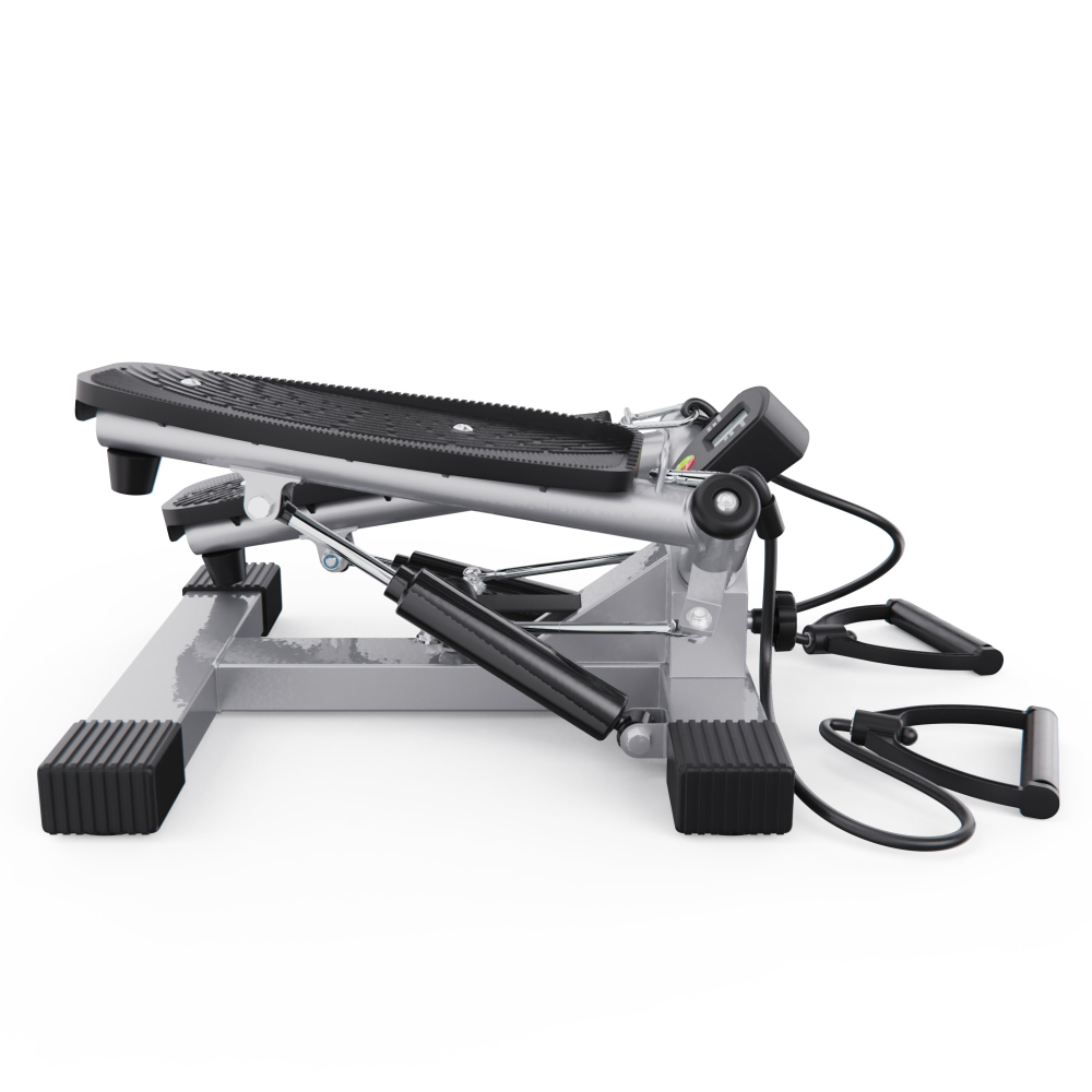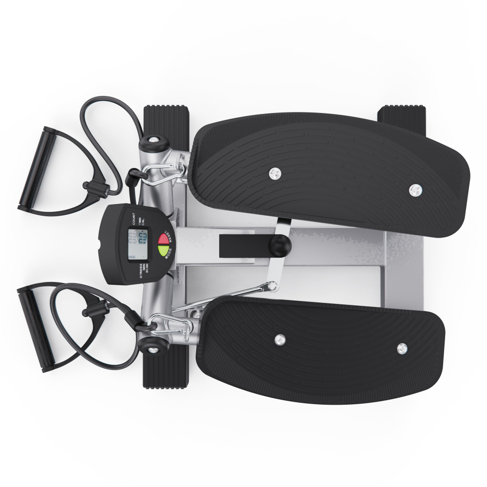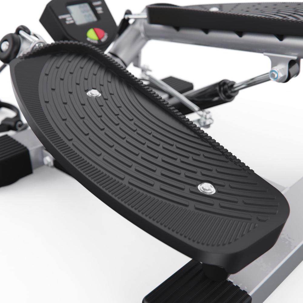 Большой поворотный степпер DFC X-STEPPER — идеальный выбор для домашних тренировок. Это компактный, но функциональный тренажёр, оснащенный двумя эспандерами для дополнительной нагрузки на руки и плечи, развивает выносливость и координацию движений. Министеппер поворотный способен выдержать пользователя весом до 120 кг. Поворотный степпер оснащён гидравлической системой нагрузки, которая обеспечивает плавный и тихий ход педалей. Вы можете механически регулировать уровень нагрузки, подстраивая интенсивность тренировки под свои цели и физическую подготовку. Педали степпера имеют размеры 36 х 15 см, а благодаря ручке на раме тренажёра вы можете регулировать высоту их подъёма, выбирая оптимальный уровень нагрузки. Чем выше поднимаются педали, тем больше усилий вам нужно прилагать, и наоборот. Поворотный степпер отличается от обычного тем, что при каждом шаге пользователь поворачивает корпус, что позволяет дополнительно тренировать мышцы кора и спины. Это делает упражнения на поворотном степпере более эффективными и разнообразными. В комплекте со степпером идут съёмные эспандеры, смазка и батарейка типа “АА” (1,5В). Монохромный LCD дисплей степпера отображает такие данные, как время тренировки, сожженные калории, количество сделанных шагов в минуту и режим сканирования, делая ваши тренировки универсальными. Министеппер поворотный DFC X-STEPPER не требует подключения к сети, легко помещается под кровать или в шкаф и готов к тренировке в любое время. Компактные размеры в рабочем виде делают этот тренажёр идеальным выбором для занятий в квартире или офисе. Гарантия на детали подверженные естественному износу в процессе эксплуатации — до 6 месяцев с момента установки тренажера при условии регулярного планового ТО. Важно: гарантия не распространяется на преждевременный износ из-за чрезмерной эксплуатации тренажера.