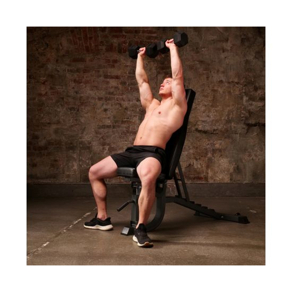 Универсальная силовая скамья DFC D100834 с прочной рамой и нетипичными сиденьем и спинкой. Толщина - целых 70 мм, что делает их долговечнее и комфортнее для тренировок.Рама скамьи изготовлена из стального профиля размерами 50х70х1,5 мм. Сиденье и спинка сделаны из прочного водостойкого материала. На задней опоре есть транспортировочные ролики: скамью удобно перемещать, взявшись за ручку в передней части. Максимально допустимая нагрузка — 300 килограмм.Особенности тренажёраСпинку можно зафиксировать в 6-ти положениях — от 90 до 180 градусов. Фиксируется она при помощи упора на обратной стороне. Поменять положение легко, приподняв спинку и установив упор в нужном месте. Сиденье фиксируется в 5-ти положениях - от 158 до 180°. Благодаря конструкции с узкими передними ножками, упражнения наподобие жима гантелей выполнять ещё удобнее.