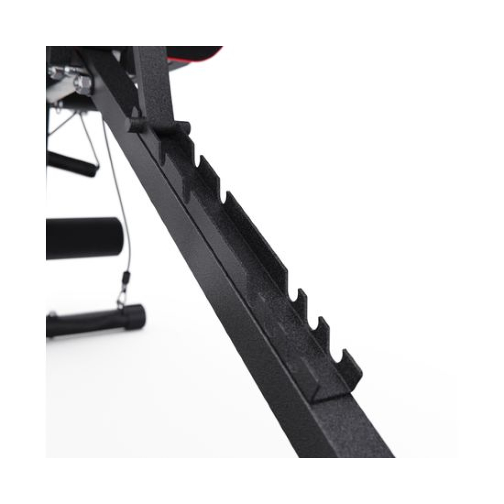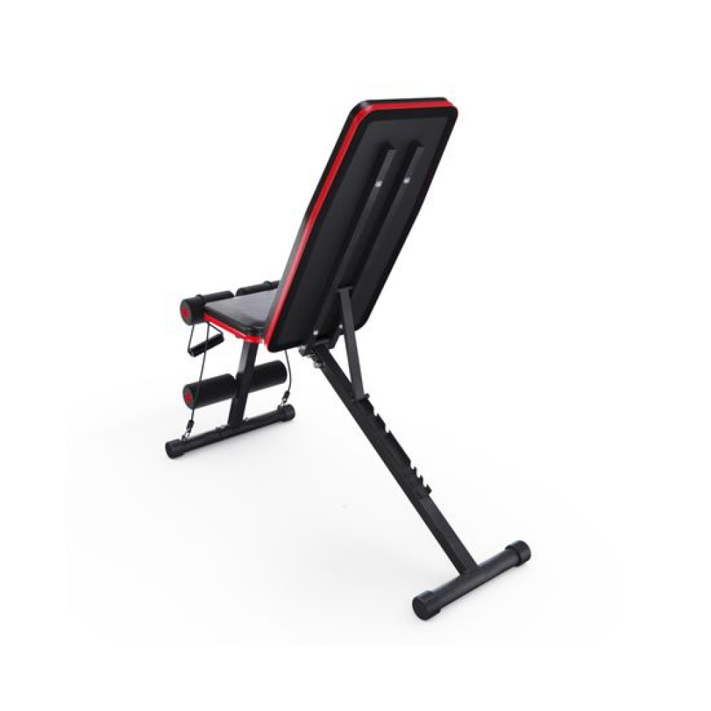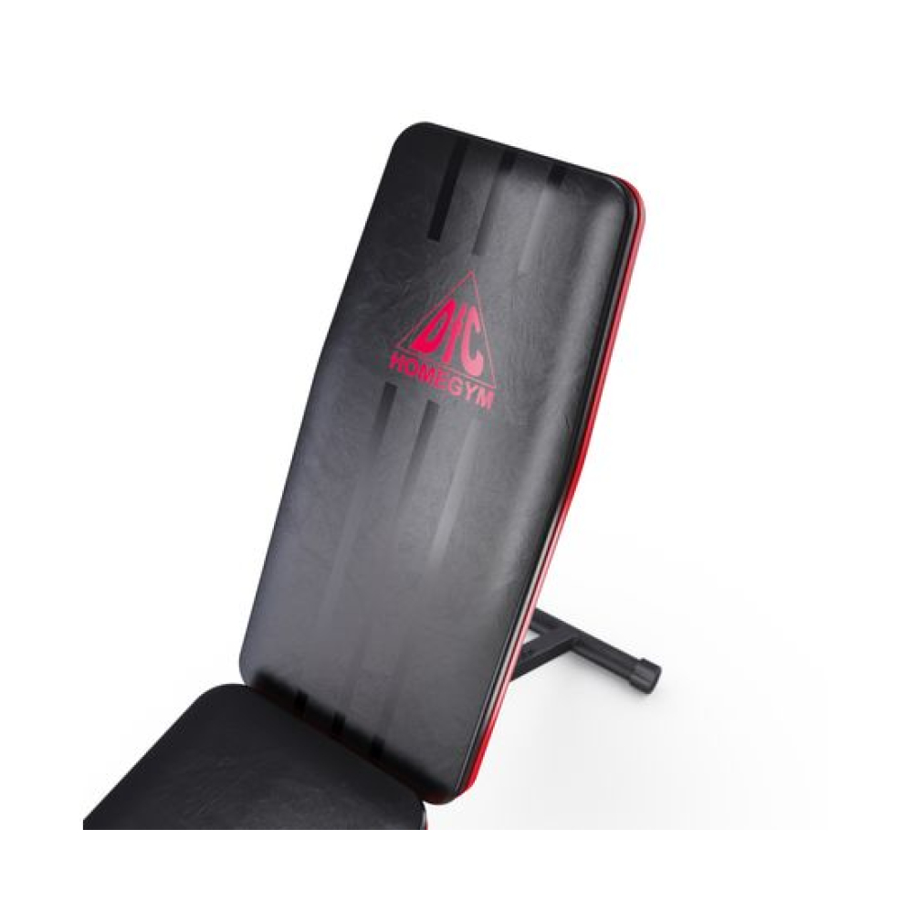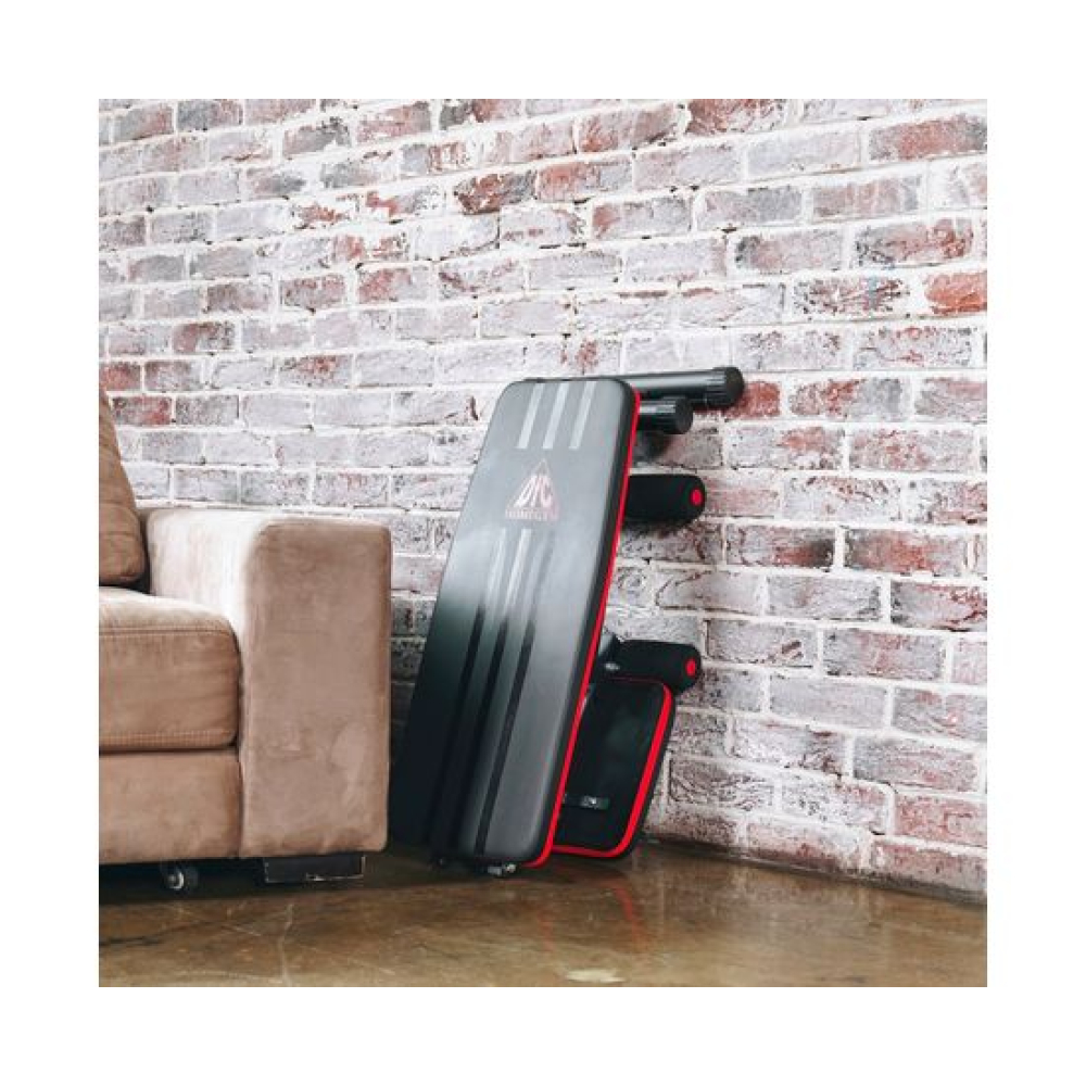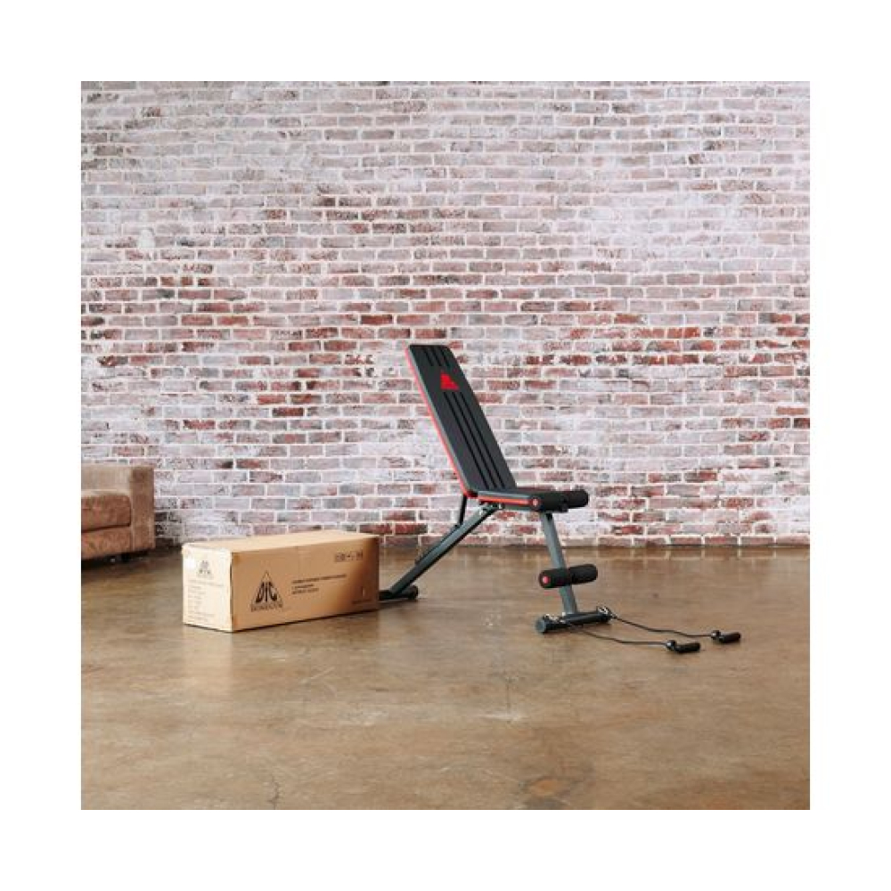 Универсальная скамья DFC DCH310 предназначена для домашних тренировок на различные группы мышц: во время занятий можно использовать собственный вес и дополнительные отягощения, гантели. Имеет стильный дизайн: обивка и каркас чёрного цвета, с яркими красными декоративными элементами.Особенности тренажёраРегулировка скамьиСиловая скамья имеет регулируемую спинку в 8 положениях: 15-40-55-73-90-116 см от пола. Для установки нужного положения необходимо приподнять спинку и установить опору в соответствующий паз.Мощная основаРама скамьи изготовлена из стали и выдерживает до 140 килограмм нагрузки.Складная конструкцияСкамья DFC DCH310 легко складывается и занимает минимум пространства, что удобно для хранения дома.ЭспандерыВ комплектацию входят эспандеры для тренировки рук. Подходят для упражнений на бицепс, плечи, спину: разведение рук, сгибание к себе и т. д. Длина эспандеров 69 см.