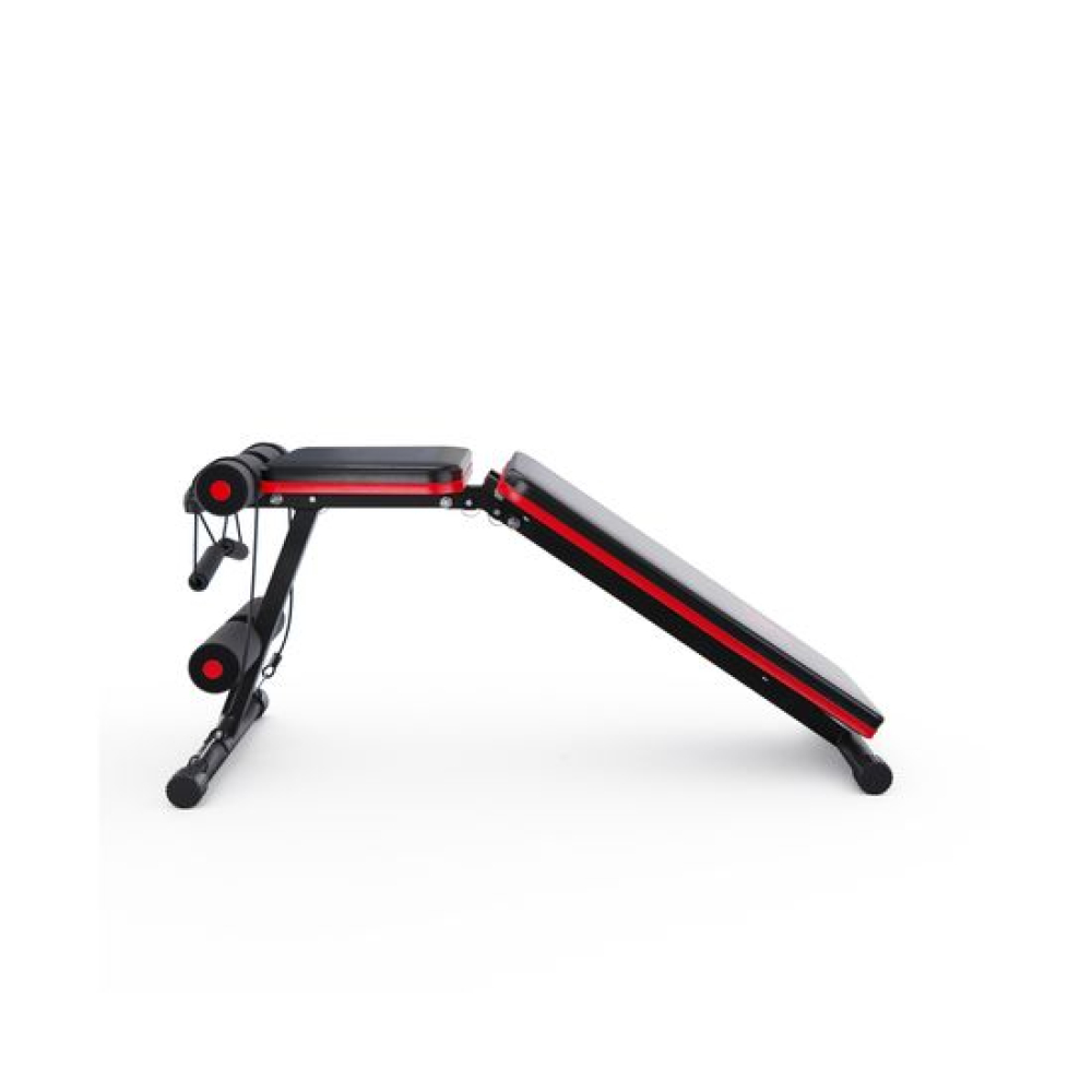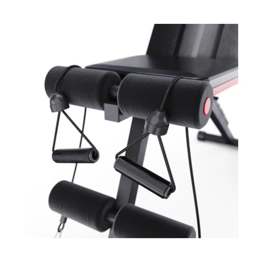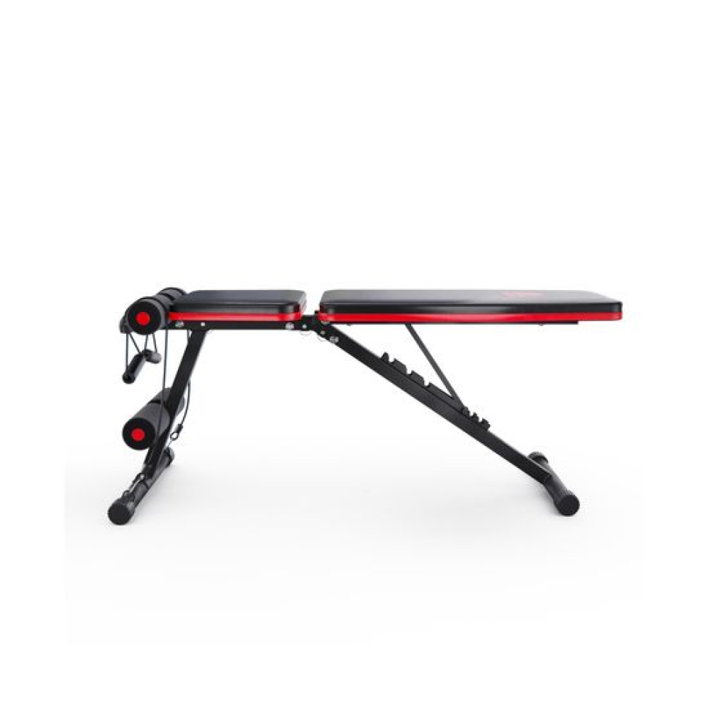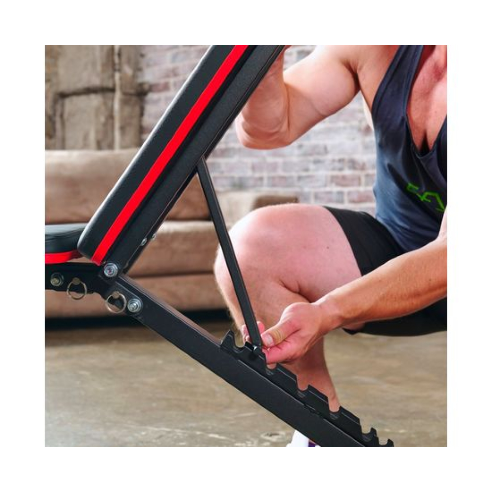 Универсальная скамья DFC DCH310 предназначена для домашних тренировок на различные группы мышц: во время занятий можно использовать собственный вес и дополнительные отягощения, гантели. Имеет стильный дизайн: обивка и каркас чёрного цвета, с яркими красными декоративными элементами.Особенности тренажёраРегулировка скамьиСиловая скамья имеет регулируемую спинку в 8 положениях: 15-40-55-73-90-116 см от пола. Для установки нужного положения необходимо приподнять спинку и установить опору в соответствующий паз.Мощная основаРама скамьи изготовлена из стали и выдерживает до 140 килограмм нагрузки.Складная конструкцияСкамья DFC DCH310 легко складывается и занимает минимум пространства, что удобно для хранения дома.ЭспандерыВ комплектацию входят эспандеры для тренировки рук. Подходят для упражнений на бицепс, плечи, спину: разведение рук, сгибание к себе и т. д. Длина эспандеров 69 см.