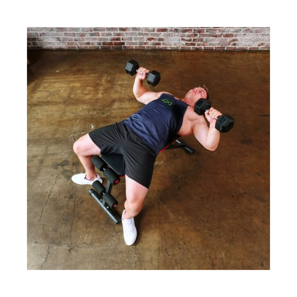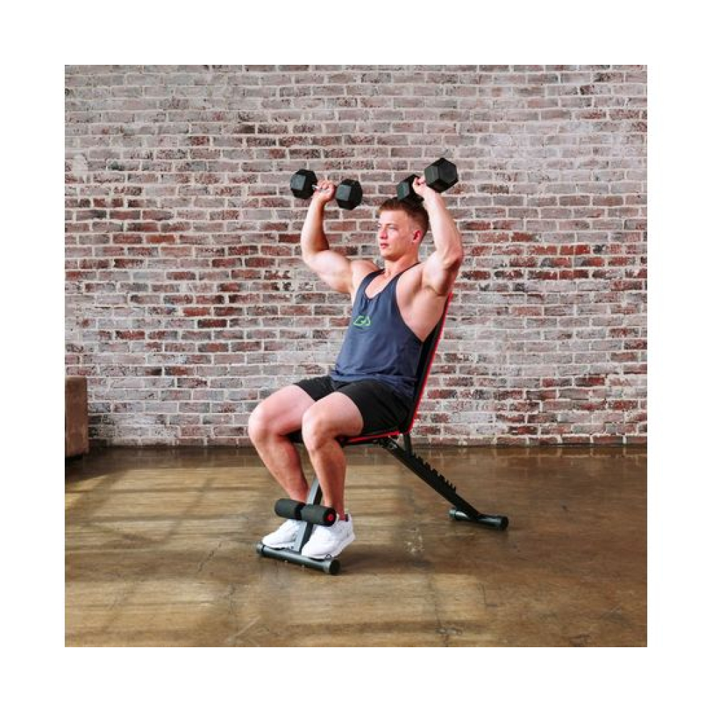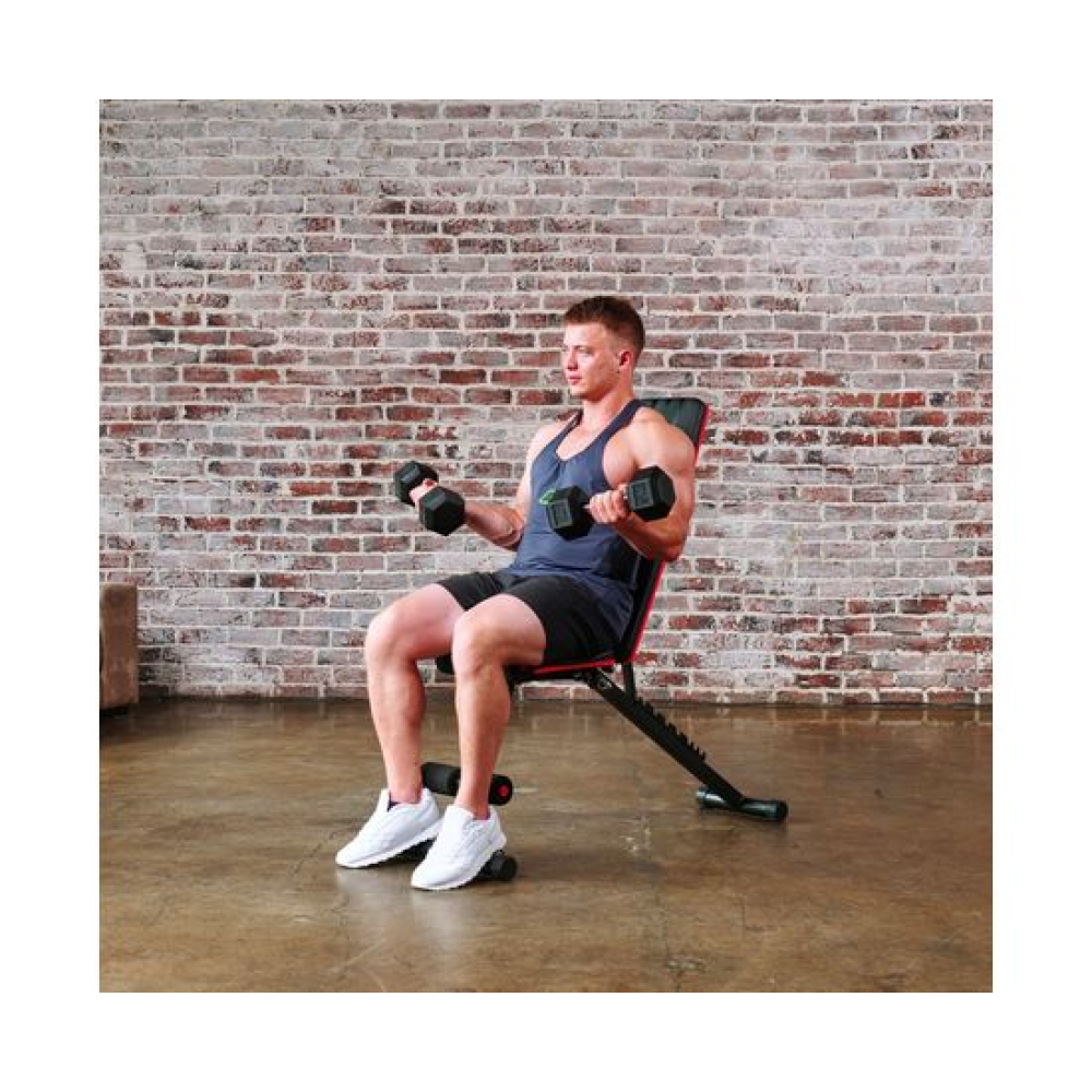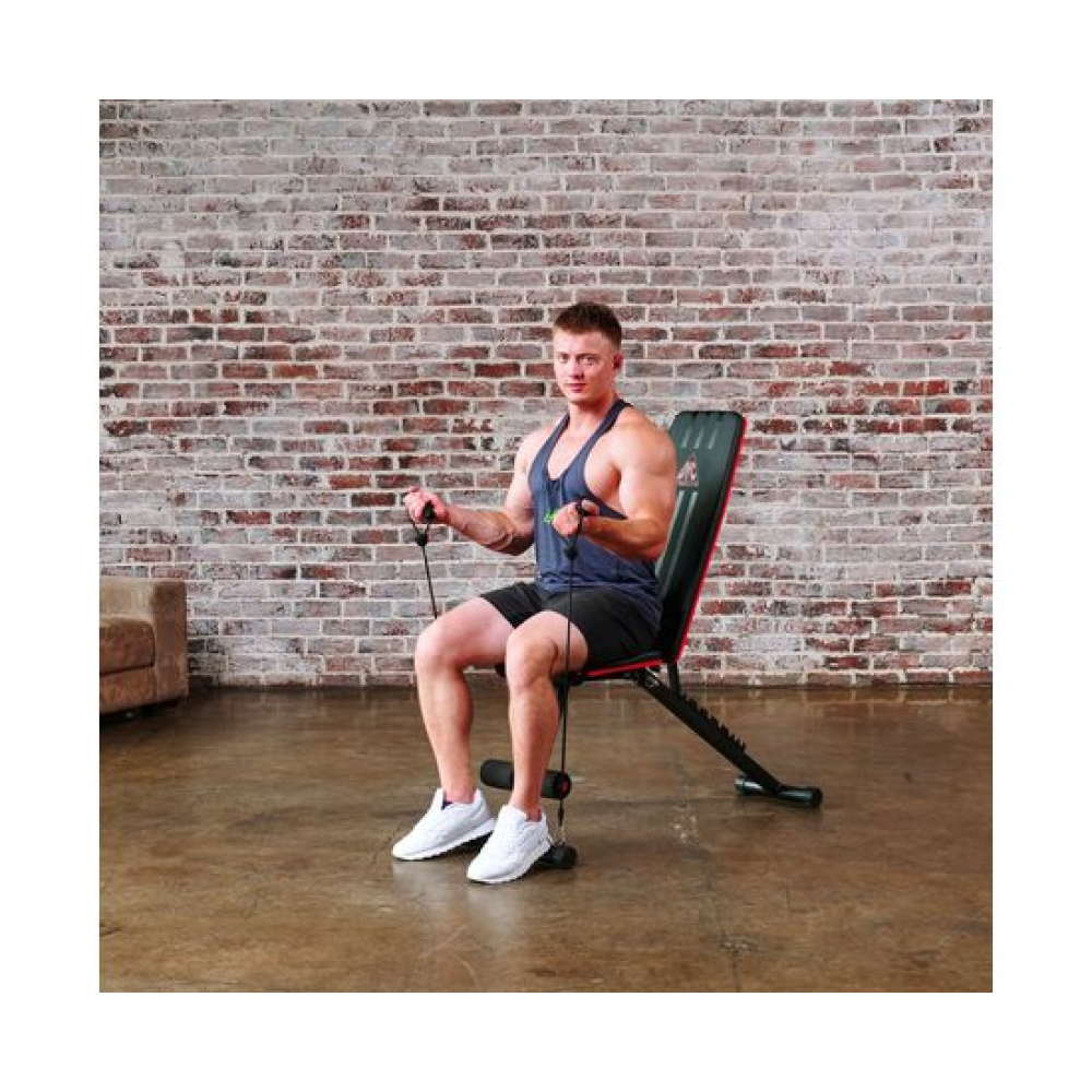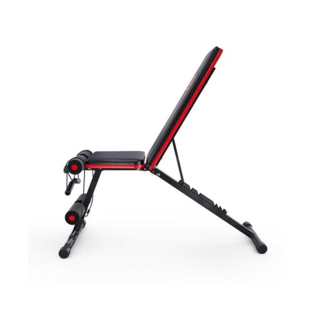 Универсальная скамья DFC DCH310 предназначена для домашних тренировок на различные группы мышц: во время занятий можно использовать собственный вес и дополнительные отягощения, гантели. Имеет стильный дизайн: обивка и каркас чёрного цвета, с яркими красными декоративными элементами.Особенности тренажёраРегулировка скамьиСиловая скамья имеет регулируемую спинку в 8 положениях: 15-40-55-73-90-116 см от пола. Для установки нужного положения необходимо приподнять спинку и установить опору в соответствующий паз.Мощная основаРама скамьи изготовлена из стали и выдерживает до 140 килограмм нагрузки.Складная конструкцияСкамья DFC DCH310 легко складывается и занимает минимум пространства, что удобно для хранения дома.ЭспандерыВ комплектацию входят эспандеры для тренировки рук. Подходят для упражнений на бицепс, плечи, спину: разведение рук, сгибание к себе и т. д. Длина эспандеров 69 см.