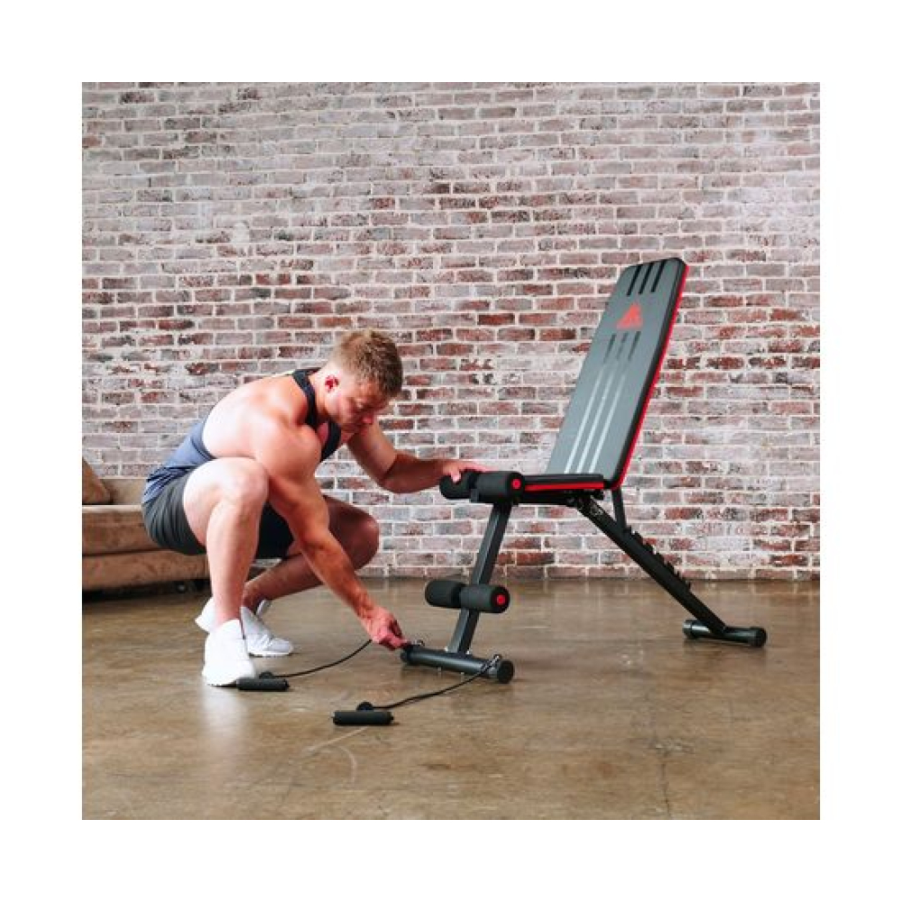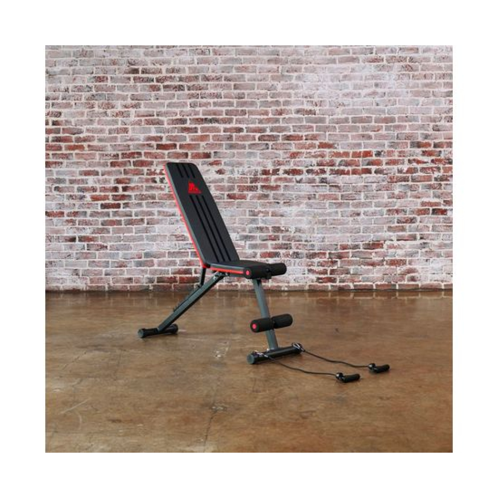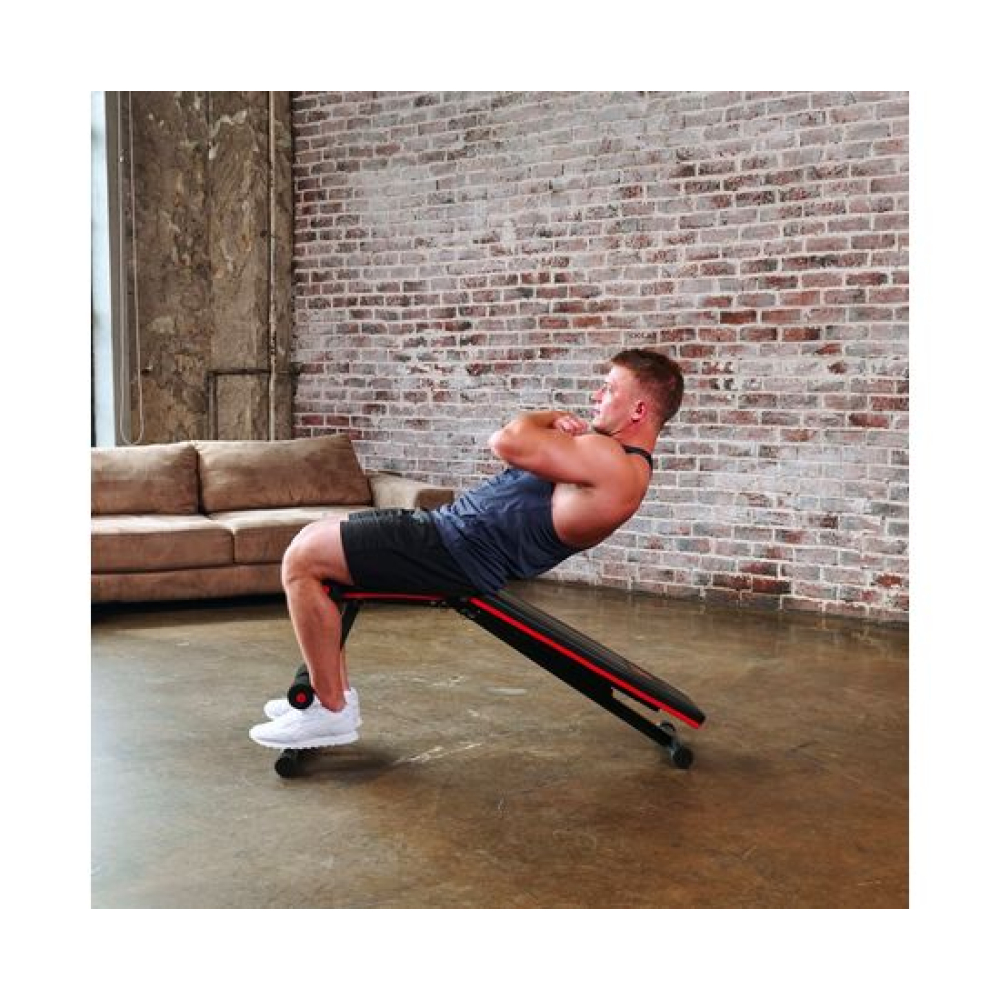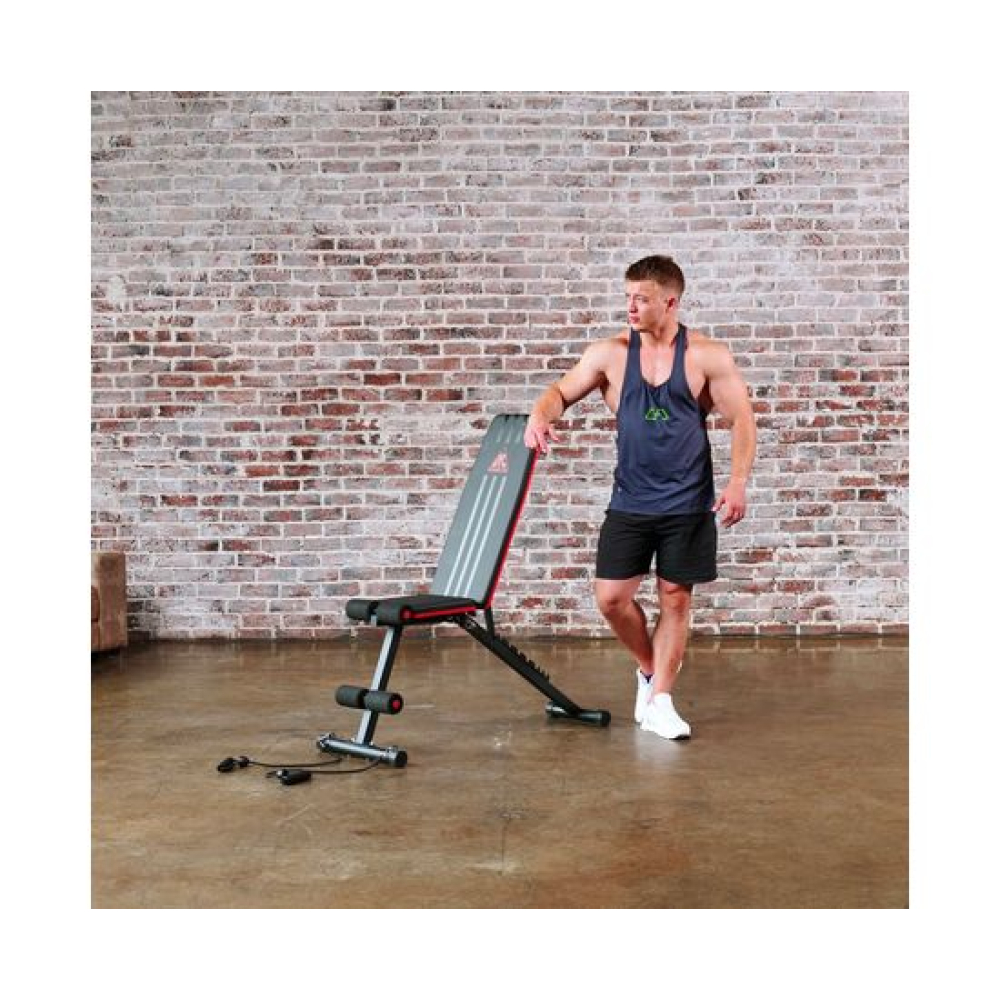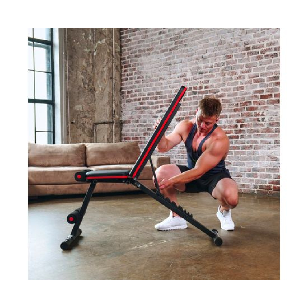 Универсальная скамья DFC DCH310 предназначена для домашних тренировок на различные группы мышц: во время занятий можно использовать собственный вес и дополнительные отягощения, гантели. Имеет стильный дизайн: обивка и каркас чёрного цвета, с яркими красными декоративными элементами.Особенности тренажёраРегулировка скамьиСиловая скамья имеет регулируемую спинку в 8 положениях: 15-40-55-73-90-116 см от пола. Для установки нужного положения необходимо приподнять спинку и установить опору в соответствующий паз.Мощная основаРама скамьи изготовлена из стали и выдерживает до 140 килограмм нагрузки.Складная конструкцияСкамья DFC DCH310 легко складывается и занимает минимум пространства, что удобно для хранения дома.ЭспандерыВ комплектацию входят эспандеры для тренировки рук. Подходят для упражнений на бицепс, плечи, спину: разведение рук, сгибание к себе и т. д. Длина эспандеров 69 см.