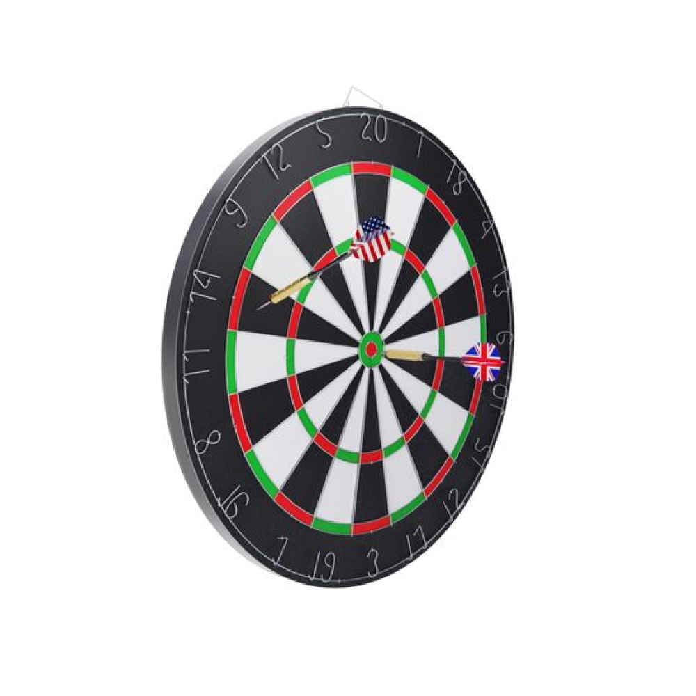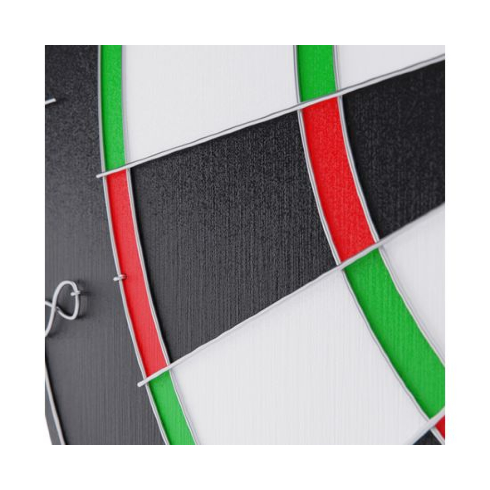 Мишень DFC DAR2118D представляет собой идеальное решение для любителей дартса, которые хотят наслаждаться игрой в уютной домашней обстановке. Это прекрасное развлечение для всех возрастов, и в игру можно включить любое количество игроков. Цифры на модели стальные, из того же материала, что и каркас.Комплект мишени включает в себя 6 дротиков с металлическими наконечниками, а также имеет 2 игровых поля с двух сторон для разных типов игры. Каждый дротик весит 16,5 грамм, что делает его легким и удобным для бросков. Кроме того, в комплекте идут флайты с американским и английским флагами, что делает эту мишень еще более интересной. Диаметр мишени составляет 45 см.В комплекте с мишенью идет металлическое крепление, которое обеспечивает уверенную и надежную фиксацию на стене. Это обеспечивает безопасность во время игры, а также позволяет настроить высоту мишени и выбрать место для игры, которое наиболее удобно для вас.