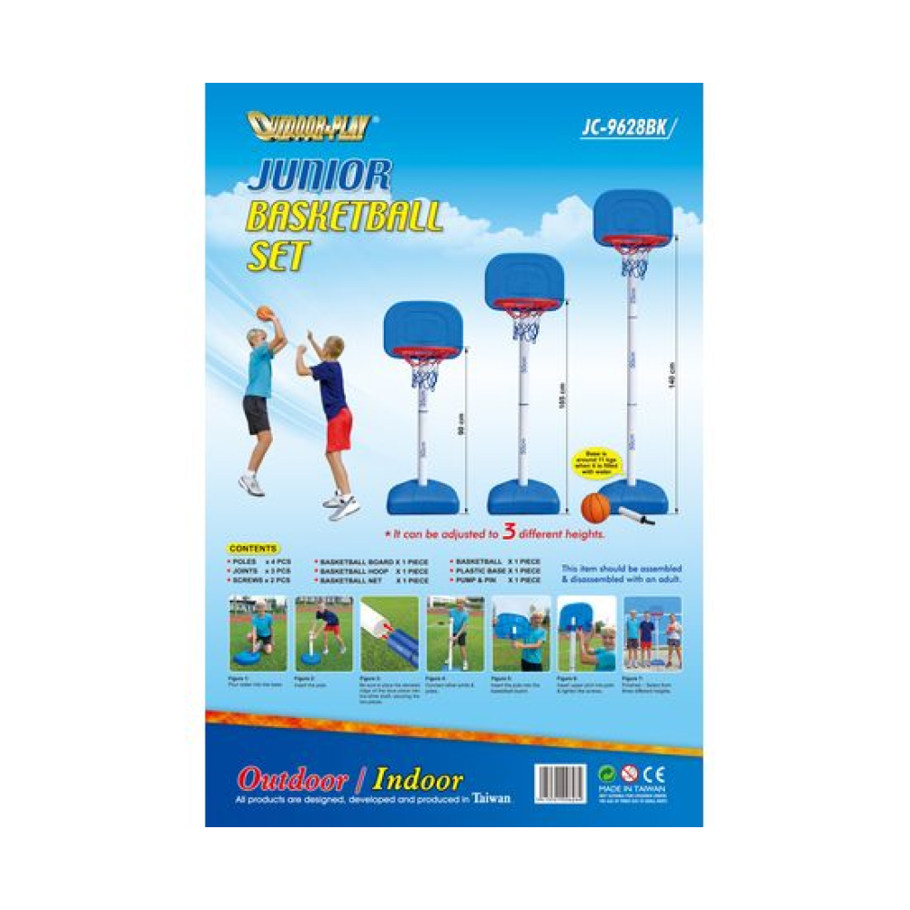Набор для игры в баскетбол DFC GOAL9628BK — это пластиковая баскетбольная стойка с регулировкой высоты от 90 до 140 см. Стойка имеет 3 уровня высоты, что позволяет удовлетворить потребности детей разных возрастов.В комплект входят 6-дюймовый баскетбольный мяч и 8-дюймовый насос. Конструкция детского баскетбольного набора безопасна и удобна для игры ребёнка. Набор легко собрать, с этим справится даже ребёнок. Перед использованием заполните основание стойки водой.