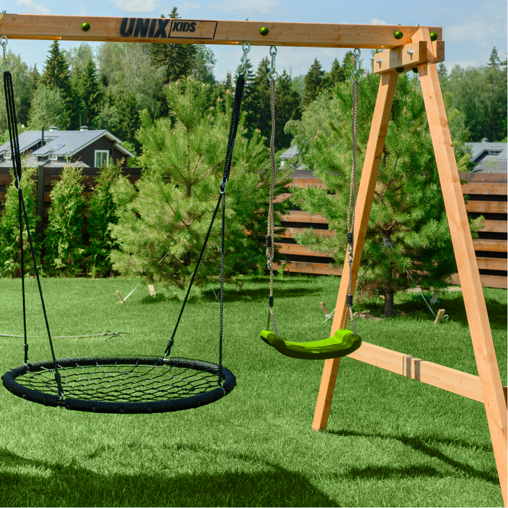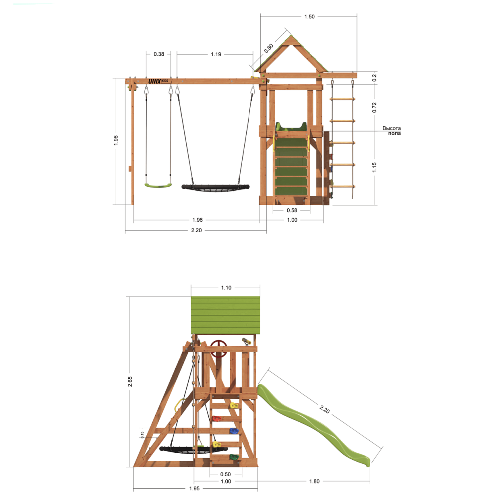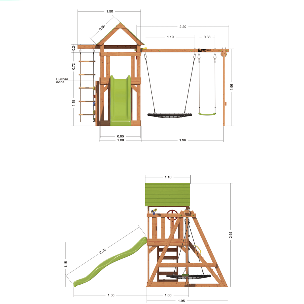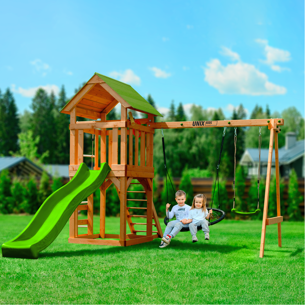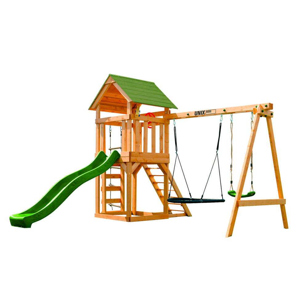 Игровой комплекс UNIX Line – это прекрасный подарок детям. Надежная игровая конструкция для улицы изготовлена из ангарской сосны. Предназначена для детей от 3-х лет.. . Детская площадка предназначена для установки на загородном участке в личное пользование. Конструкция не требует бетонирования каркасных стоек, устанавливается на подготовленную поверхность и держится за счет собственного веса. Под городок требуется участок поверхности размером 375 х 370 см.. Основа городка – деревянная башня высотой 265 см. На высоте 115 см установлена игровая площадка с ограждениями. Сверху башню закрывает двускатная деревянная крыша. Нижний ярус башни можно использовать под небольшую песочницу.. . Горка длиной 220 см изготовлена из пластика и имеет прекрасную скользящую поверхность. Боковые бортики обеспечивают безопасность малышей. Дополнительными элементами для развлечений служат скалодром, обычные подвесные качели и с гнездом размером 100 см, а так же веревочная лестница.. Все элементы городка обработаны пропиткой на водной основе. Древесина надежно защищена от воздействия окружающей среды.. Комплекс возможно использовать круглый год. .