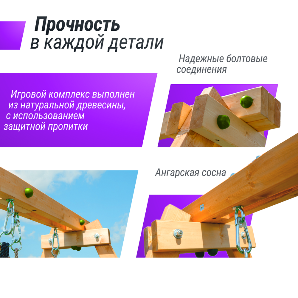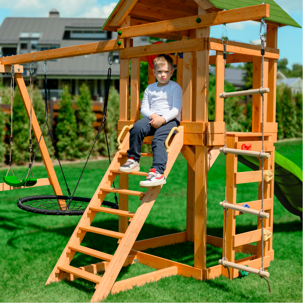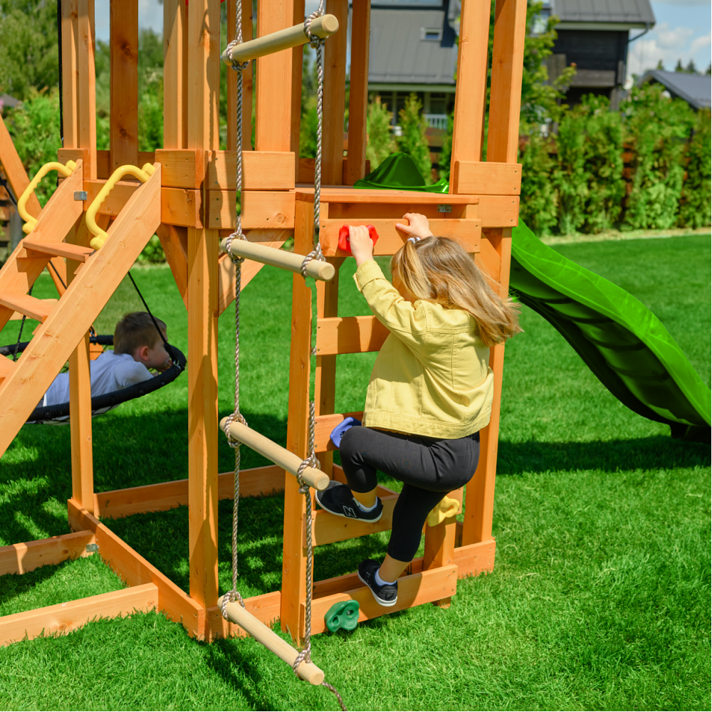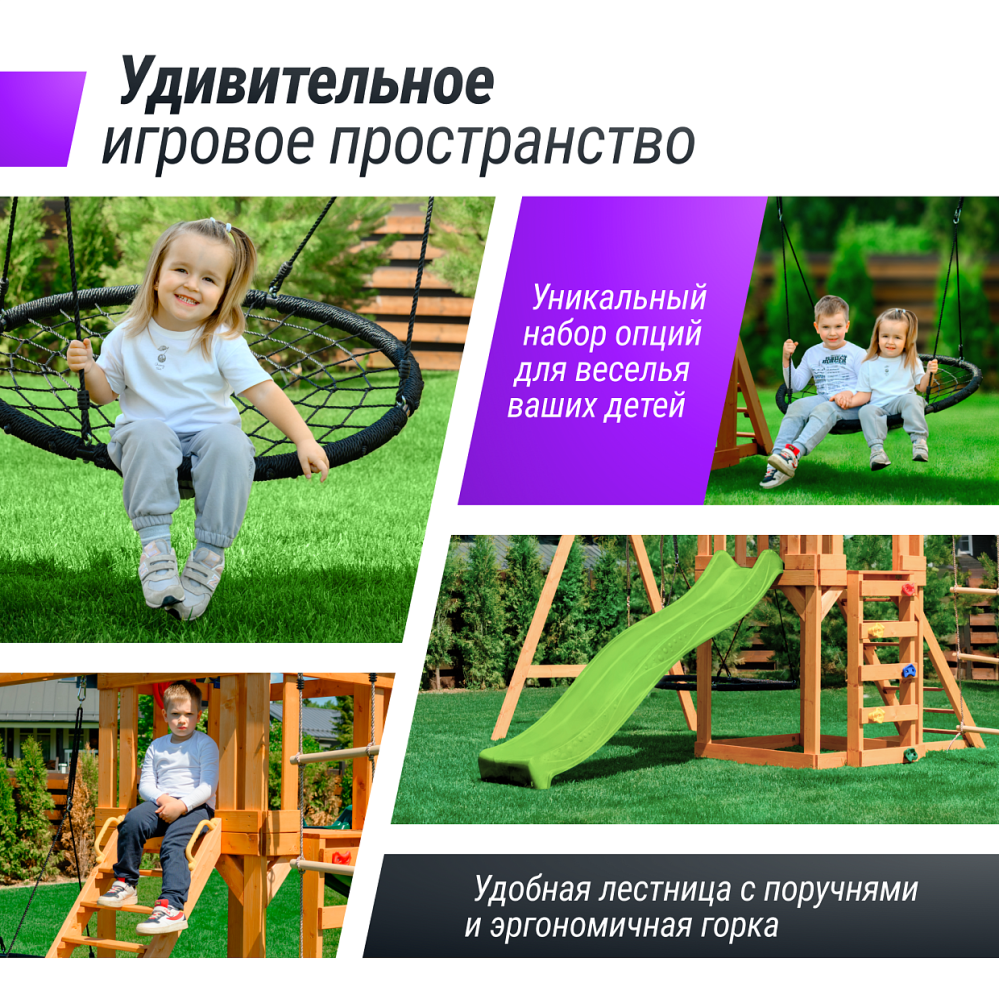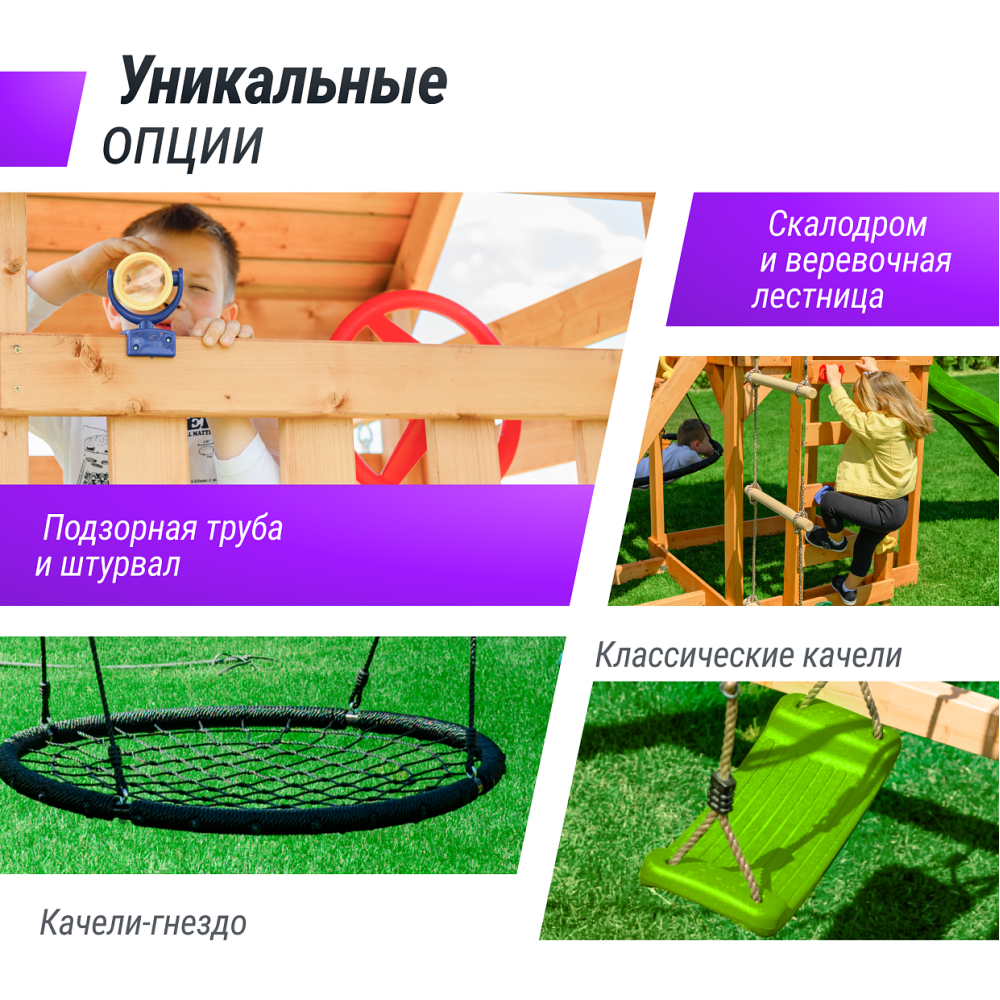 | Комплектация | Горка, скалодром, песочница, качели обычные, качели - гнездо, штурвал, подзорная труба, верёвочная лестница, крепежные элементы, инструкция по сборке изделия |