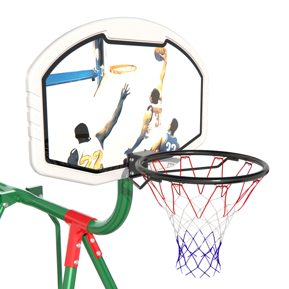 Детская площадка, сочетающая в себе все необходимое для активного времяпрепровождения, — больше не мечта. Детский игровой комплекс MTB-01 серии DFC Kids — это возможность организовать полноценную зону отдыха для детей с минимумом усилий. Комплектация качелей поражает воображение — комплекс оборудован не только развлекательными, но и спортивными элементами: баскетбольное кольцо, качели-планер, качели-гнездо, классические веревочные качели и батут, изготовленный из гипоаллергенных полимерных материалов. Занимает все это относительно мало места — габариты комплекса составляют 381 х 156 х 261 см. Все металлические элементы, включая профиль опоры 50,8×2 мм, выдерживающий нагрузку до 145 кг, окрашены порошковой краской, обеспечивающей устойчивость конструкции к сложным атмосферным условиям. Комплекс может использоваться детьми от 3 лет. В комплекте с комплексом поставляются анкеры крепления к земле, повышающие устойчивость конструкции. Под каждый анкер выкопайте яму глубиной 60 см и залейте бетонным раствором 30x30x50 см (ДxШxВ). Воткните анкеры в раствор, пока он не застыл.