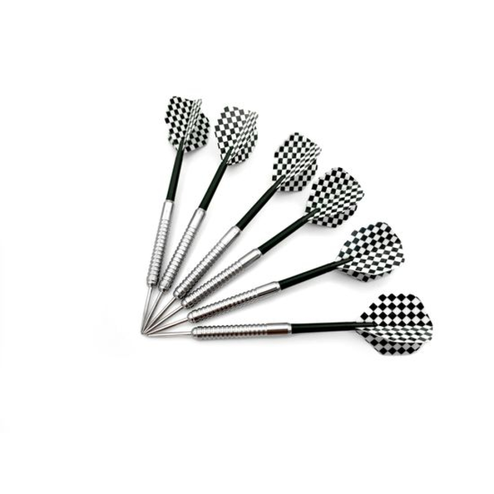 Набор дротиков для дартса DAR3071, состоящий из 6-ти дротиков с чёрно-белым узорчатым флайтом и металлическим держателем. Каждый дротик имеет вес 19,5 грамм, что делает их подходящими для использования опытными или профессиональными игроками. Толщина хвата (баррель) составляет 7,6 мм.