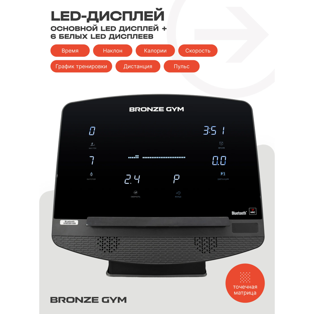 Такой датчик в комплекте не идет и приобретается отдельно. Также к тренажеру через Bluetooth можно подключить смартфон или планшет, разместить на удобной полке и тренироваться.
