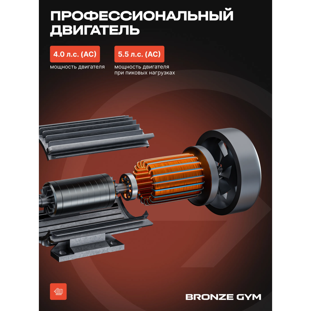 В движение её приводит электродвигатель мощностью 4 л.c., что позволяет бегать на дорожке с максимальной скоростью в 22 км в час, и этого более чем достаточно даже опытным спортсменам. Наклон полотна регулируется автоматически, программой или кнопками на консоли. Максимальный угол подъема составляет оптимальные 15%. За бережное отношение к нашим суставам и гашение ударных нагрузок во время бега отвечает развитая система амортизации на базе комплекса эластомеров продвинутого уровня.