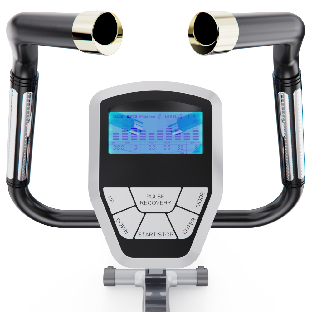 Электромагнитный генераторный велотренажер DFC XFACT SQ-CB701 — это отличный выбор для тех, кто ищет надёжный и современный велотренажёр для домашнего использования. Он сочетает в себе компактные габариты, продуманную конструкцию и богатый функционал, что делает его подходящим как для начинающих, так и для опытных пользователей. Велотренажёр генераторного типа для тренировки рук и ног функционирует автономно благодаря встроенному генератору. Для запуска процесса выработки электроэнергии нужно начать крутить педали — важно поддерживать достаточное количество оборотов в минуту. Сразу после старта тренировки генерируемая энергия поступает на систему нагружения и питает дисплей устройства. Модель предназначена для пользователей весом до 150 кг. Особенностью этой модели является плавная и точная регулировка сопротивления. Электронная регулировка сопротивления с 16 уровнями позволяет точно настраивать интенсивность тренировки. Увеличенный инерционный вес маховика 17 кг способствует плавной и стабильной работе тренажёра, создавая комфортные условия для длительных и эффективных тренировок. Сиденье тренажёра регулируется на 10 уровней по вертикали в диапазоне от 90 до 100 см, что позволяет подобрать удобную посадку для пользователей разного роста. Для дополнительной устойчивости и безопасности предусмотрены рифлёные, нескользящие педали с ремешками, которые надёжно фиксируют ноги и обеспечивают уверенный контроль во время занятий. Тренажёр оснащён 12 встроенными программами, включая ручной режим, целевой режим и пользовательский режим. На встроенном LCD-дисплее отображаются все важные параметры тренировки: время, скорость, дистанция, калории, пульс (сенсорные датчики на поручнях), обороты в минуту (RPM), а также режим сканирования. Расстояние между поручнями составляет 36 см, что обеспечивает комфортное положение рук во время занятий. Электромагнитный (генератор) велотренажер DFC XFACT SQ-CB701 сочетает комфорт, функциональность и надёжность. Он обеспечивает плавную и тихую работу, подходит для тренировок любой интенсивности и помогает поддерживать форму, не выходя из дома. Встроенные транспортировочные ролики позволяют легко перемещать тренажёр с места на место, что особенно удобно при использовании в ограниченном пространстве. А наличие держателя для бутылки помогает поддерживать водный баланс во время занятий. Гарантия на детали подверженные естественному износу в процессе эксплуатации — до 6 месяцев с момента установки тренажера при условии регулярного планового ТО. Важно: гарантия не распространяется на преждевременный износ из-за чрезмерной эксплуатации тренажера.