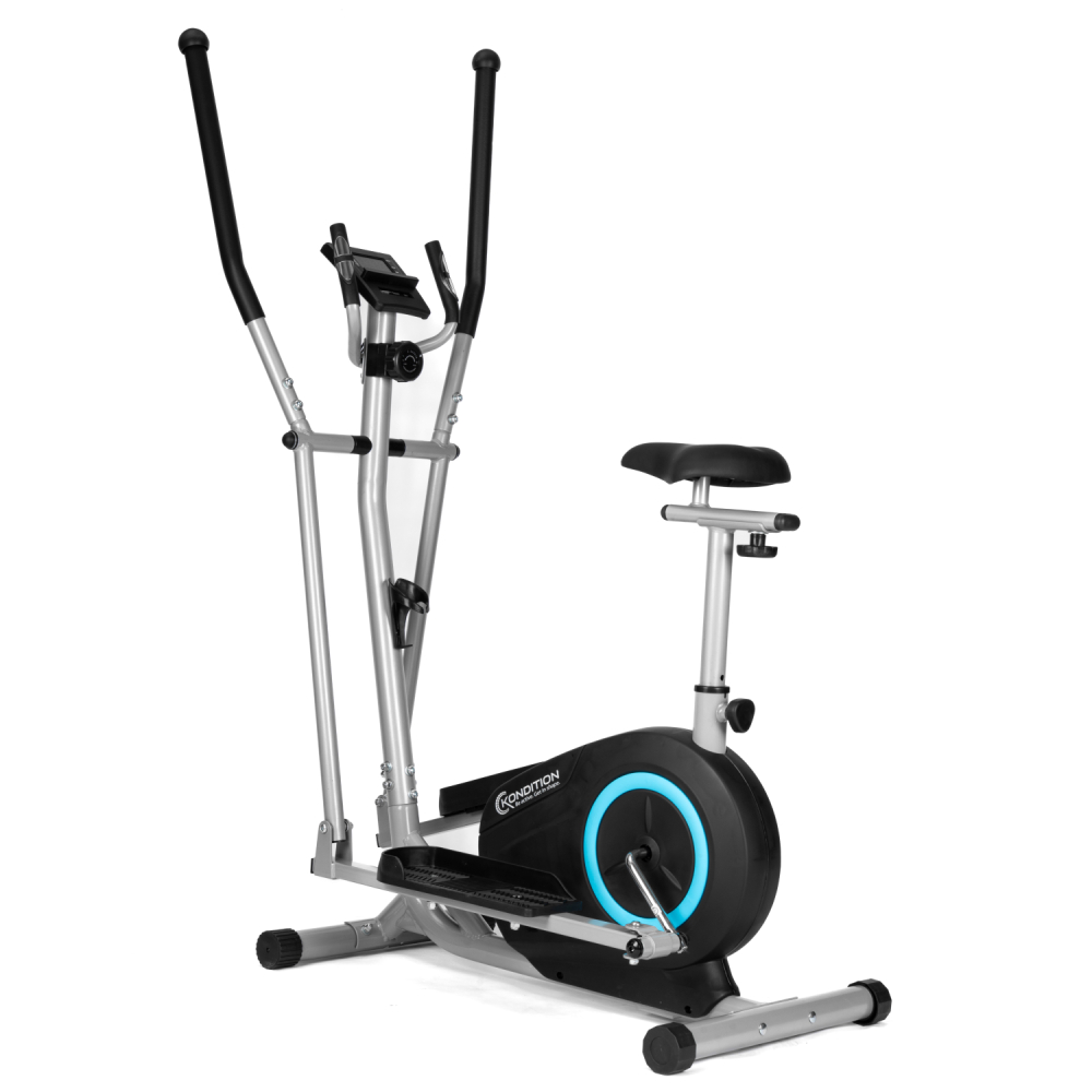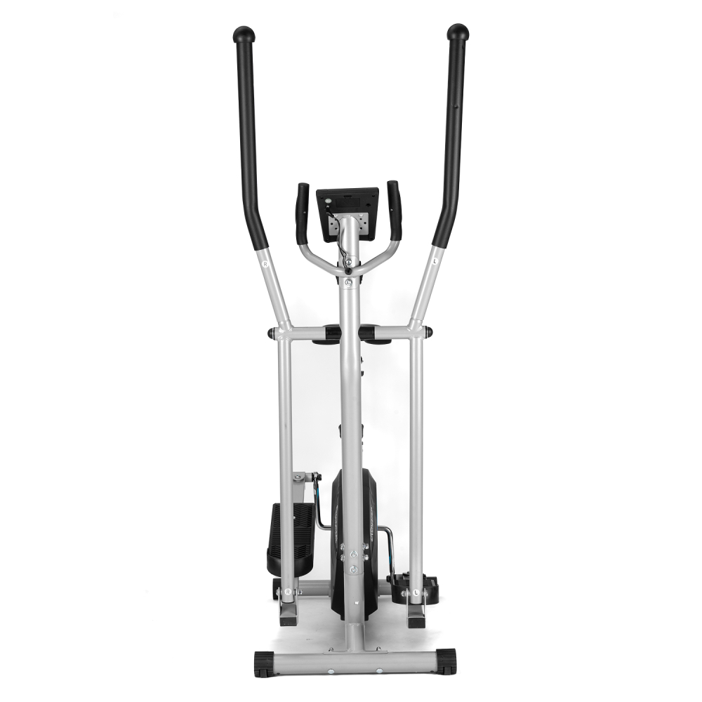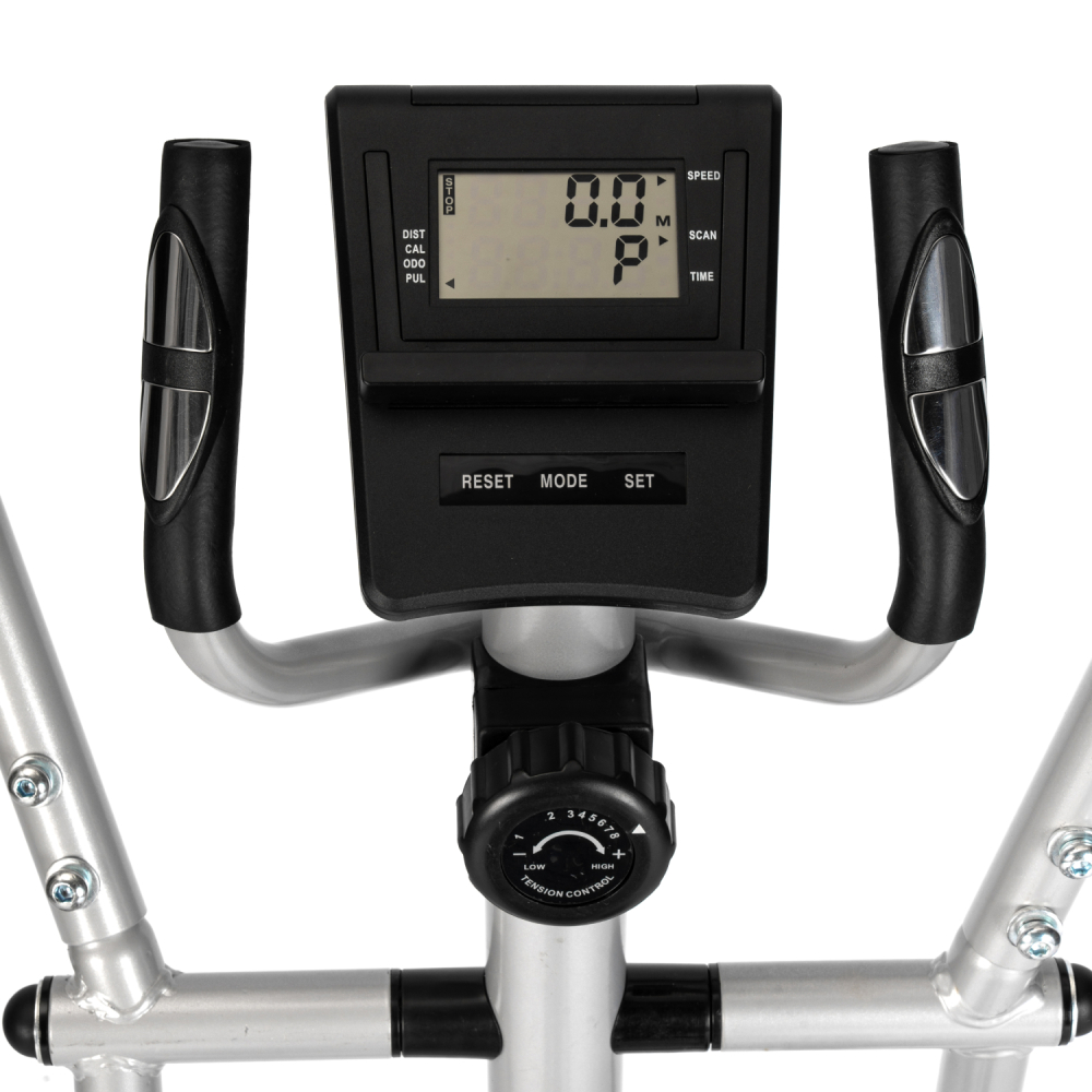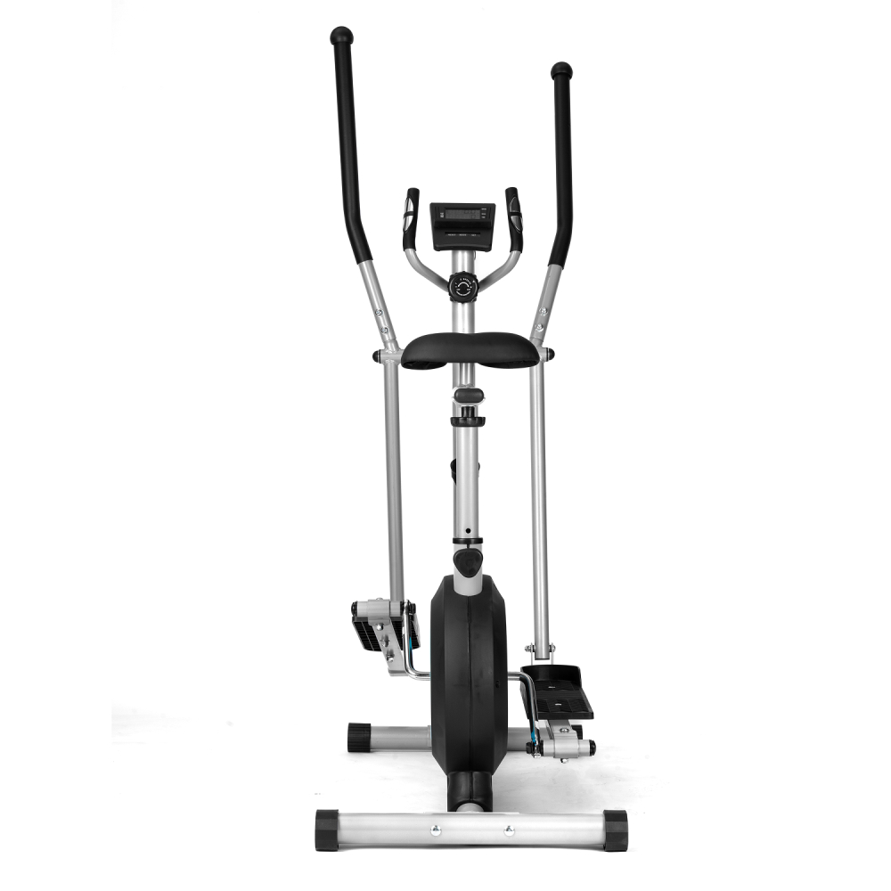 Эллиптический тренажёр DFC Condition SQ-2300C — удобный и функциональный эллиптический тренажер для дома, предназначенный для комфортных и эффективных кардио-тренировок. Во время занятий активно работают мышцы ног, а также мышцы рук, плечевого пояса и корпуса, что делает тренировки на эллипсоиде комплексными и результативными. Модель способна выдержать пользователя весом до 110 кг. Тренажёр оснащён магнитной системой нагрузки с инерционным весом маховика 7 кг. Механическая регулировка сопротивления с 8 уровнями нагрузки позволяет подобрать оптимальную интенсивность тренировки в зависимости от подготовки пользователя. Рифлёные педали с нескользящей поверхностью обеспечивают надёжную фиксацию ног и предотвращают соскальзывание. Удобный хват обеспечивают поручни: расстояние между длинными поручнями составляет 48,3 см, а между короткими — 19 см, что делает тренировку комфортной и безопасной. Сиденье регулируется на 5 уровней, обеспечивая индивидуальную посадку для пользователей разного роста. Тренажёр оснащён монохромным LCD-дисплеем, который отображает основные параметры тренировки: скорость, время, дистанцию, калории, пульс, общую дистанцию и режим сканирования. Для контроля состояния организма во время тренировки на поручнях установлены сенсорные датчики пульса. Дисплей работает от двух батареек типа AAA (не входят в комплект). Эллипсоид устойчиво стоит благодаря компенсаторам неровности пола, легко перемещается на транспортировочных роликах, а подставка под планшет и держатель для бутылки позволяют держать всё необходимое под рукой. Эллиптический тренажёр DFC Condition SQ-2300C сочетает комфорт, функциональность и простоту в использовании. Такой эллипс станет отличным решением для регулярных и эффективных домашних тренировок. Гарантия на детали подверженные естественному износу в процессе эксплуатации — до 6 месяцев с момента установки тренажера при условии регулярного планового ТО. Важно: гарантия не распространяется на преждевременный износ из-за чрезмерной эксплуатации тренажера.