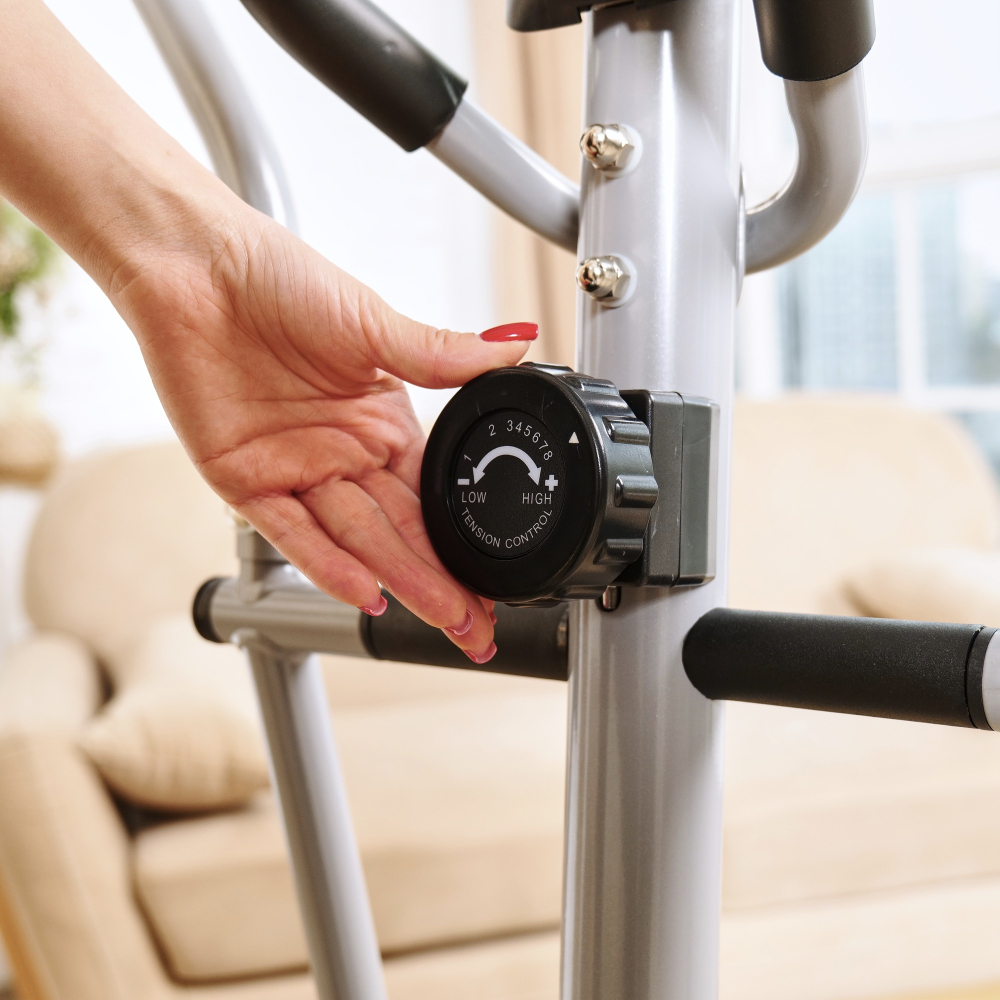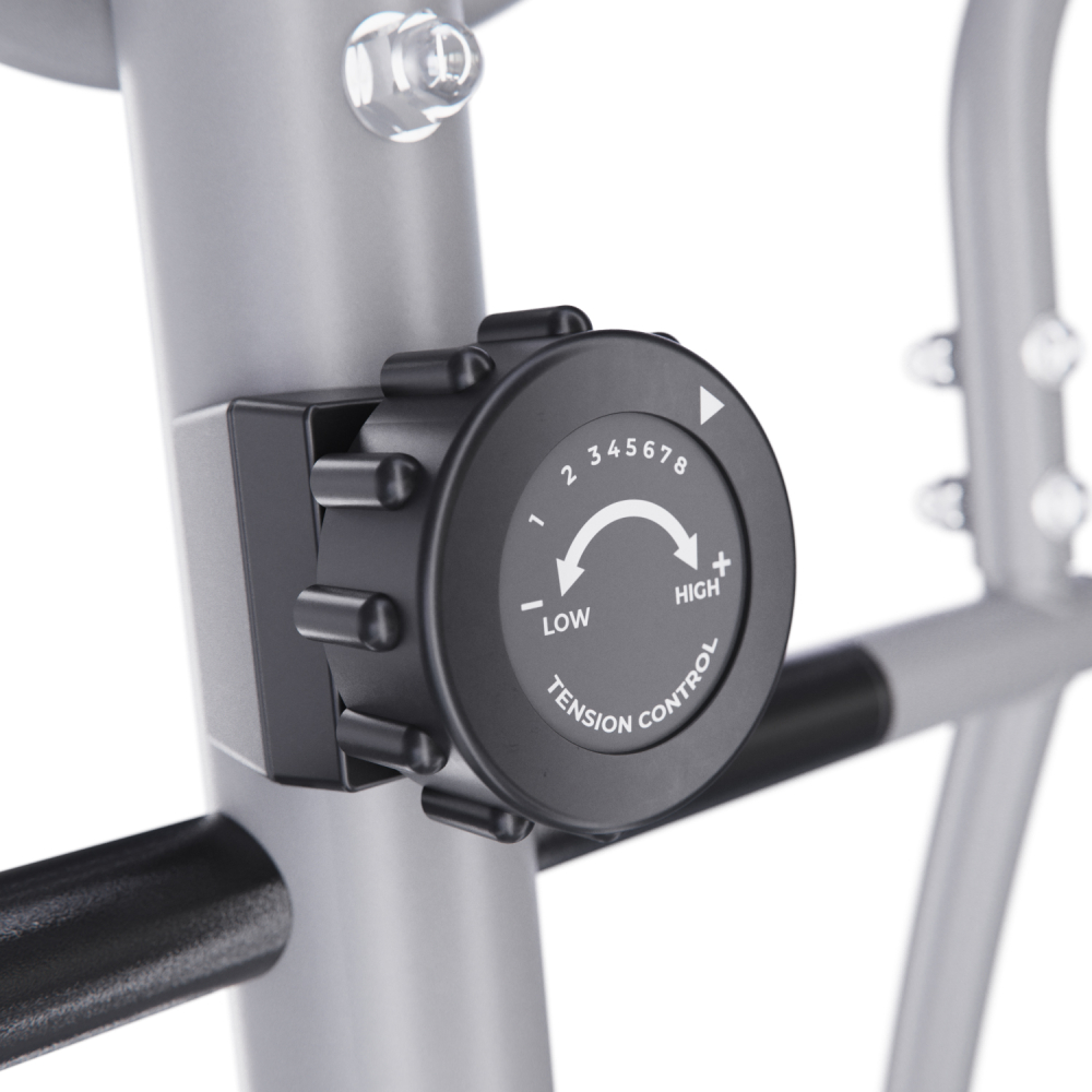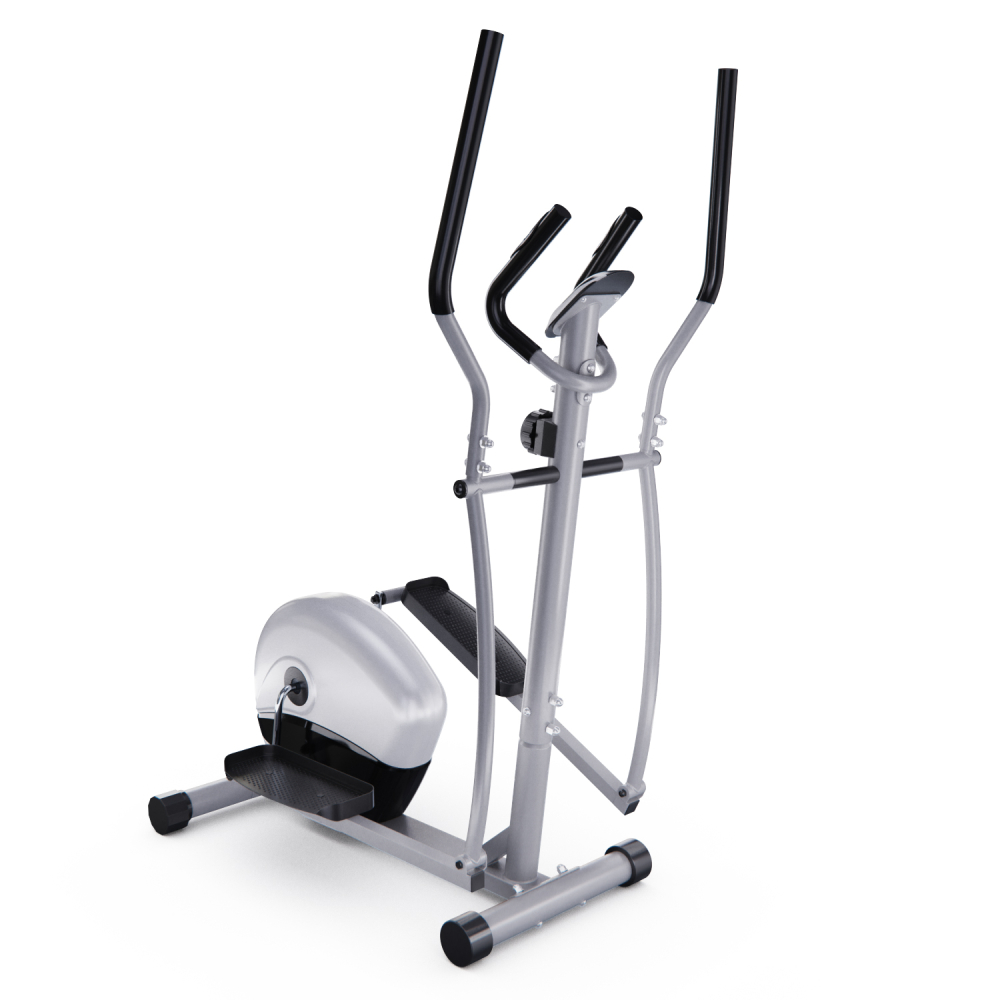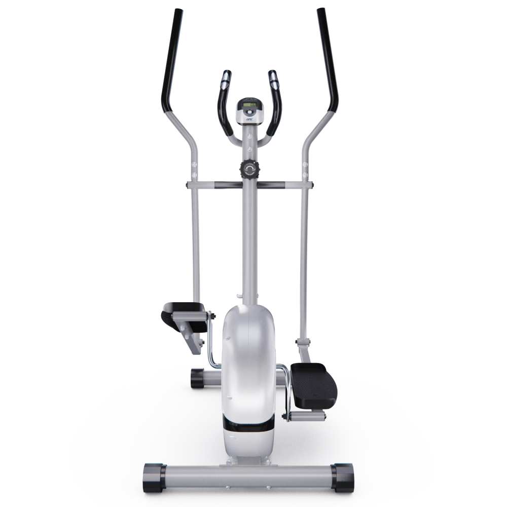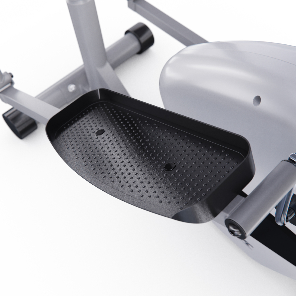 Эллиптический тренажёр DFC E85106 — идеальное решение для домашних тренировок. Он подходит для пользователей весом до 100 кг и оснащён магнитной системой нагрузки с 8 уровнями регулировки. Благодаря компактным размерам и компенсаторам неровности пола, тренажёр легко разместить в любом помещении. Сенсорные датчики на поручнях позволяют контролировать пульс во время тренировки. Монохромный дисплей показывает скорость, время, расстояние, обороты, пульс и калории, что позволяет отслеживать результаты и корректировать программу тренировок. Простая механическая регулировка нагрузки и питание от батареек типа АА или ААА делают тренажёр экономичным и удобным в использовании.
