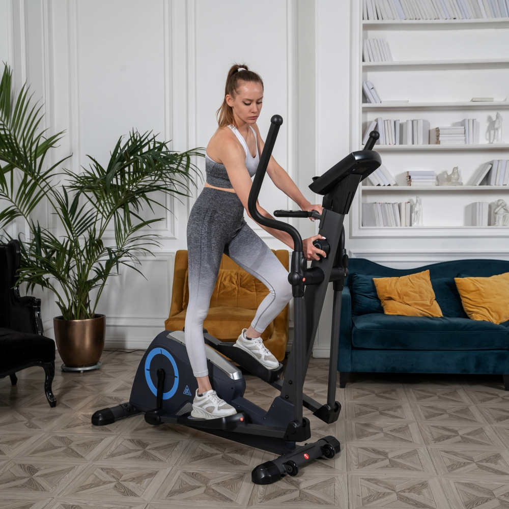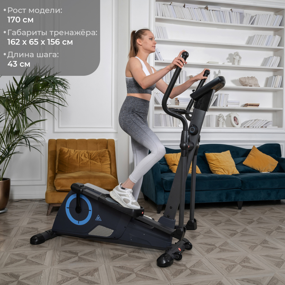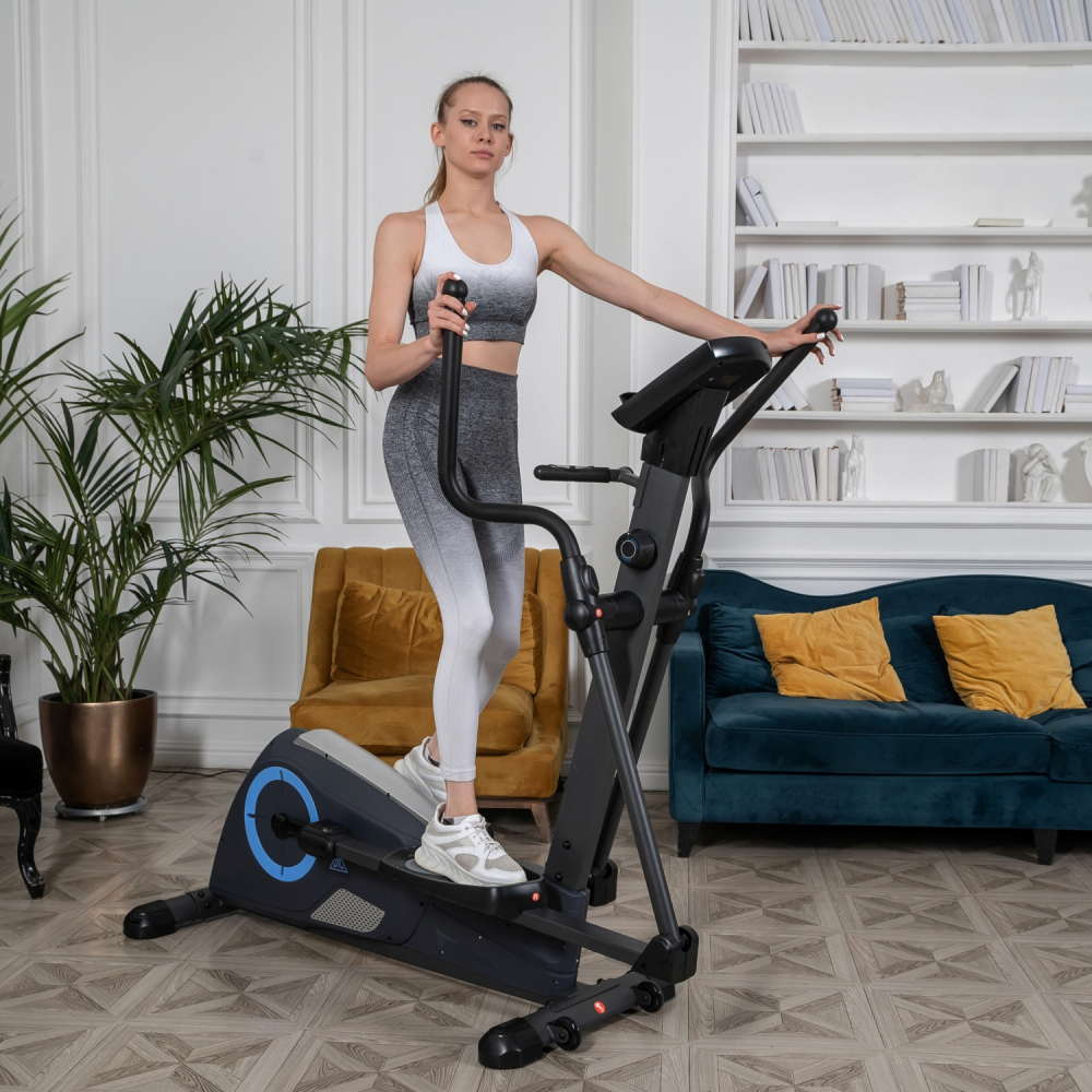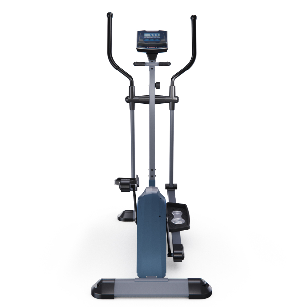 Эллиптический тренажер с задним расположением маховика для домашнего использования. Тренировка на эллиптическом тренажере - это прекрасная альтернатива бегу трусцой или ходьбе, с разницей в высоком сжигании калорий. Благодаря интенсивному движению рук верхние участки тела напрягаются, все тело укрепляется, повышается эффективность тренировки. Среднегабаритная модель с магнитной нагрузкой - система сопротивления с постоянным магнитом и тончайшей настройкой интенсивности. Регулировка нагрузки с помощью ручного привода на стойке тренажера. Консоль с монохромным LCD-дисплеем отображает все необходимые показатели во время тренировки. Измерение пульса осуществляется с помощью встроенных датчиков. Мощная рама тренажера, усиленная конструкция из стального профиля, позволит заниматься пользователю весом до 120 кг. Широкие педали с нескользящей вставкой. Транспортировочные колеса в передней части обеспечивают свободное перемещение тренажера по комнате. Задний стабилизатор с регулировкой положения на неровной поверхности. Показания консоли: время, расстояние, количество сожженных калорий, скорость, пульс