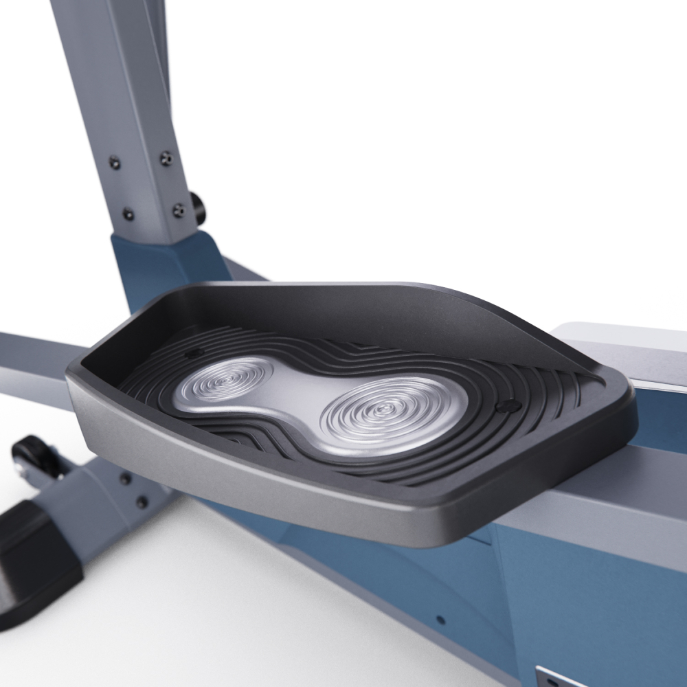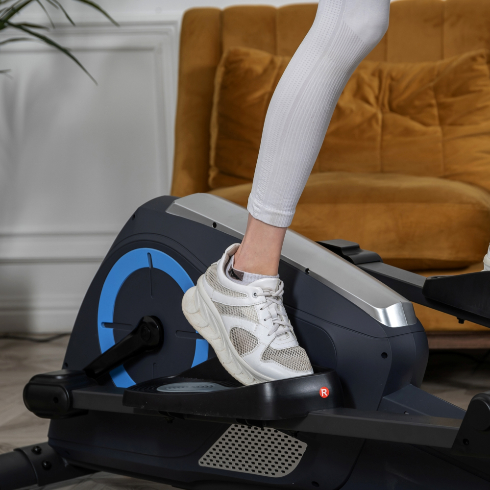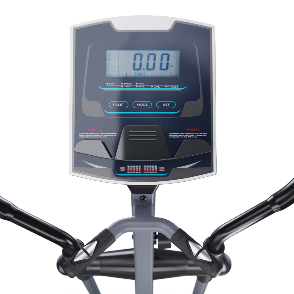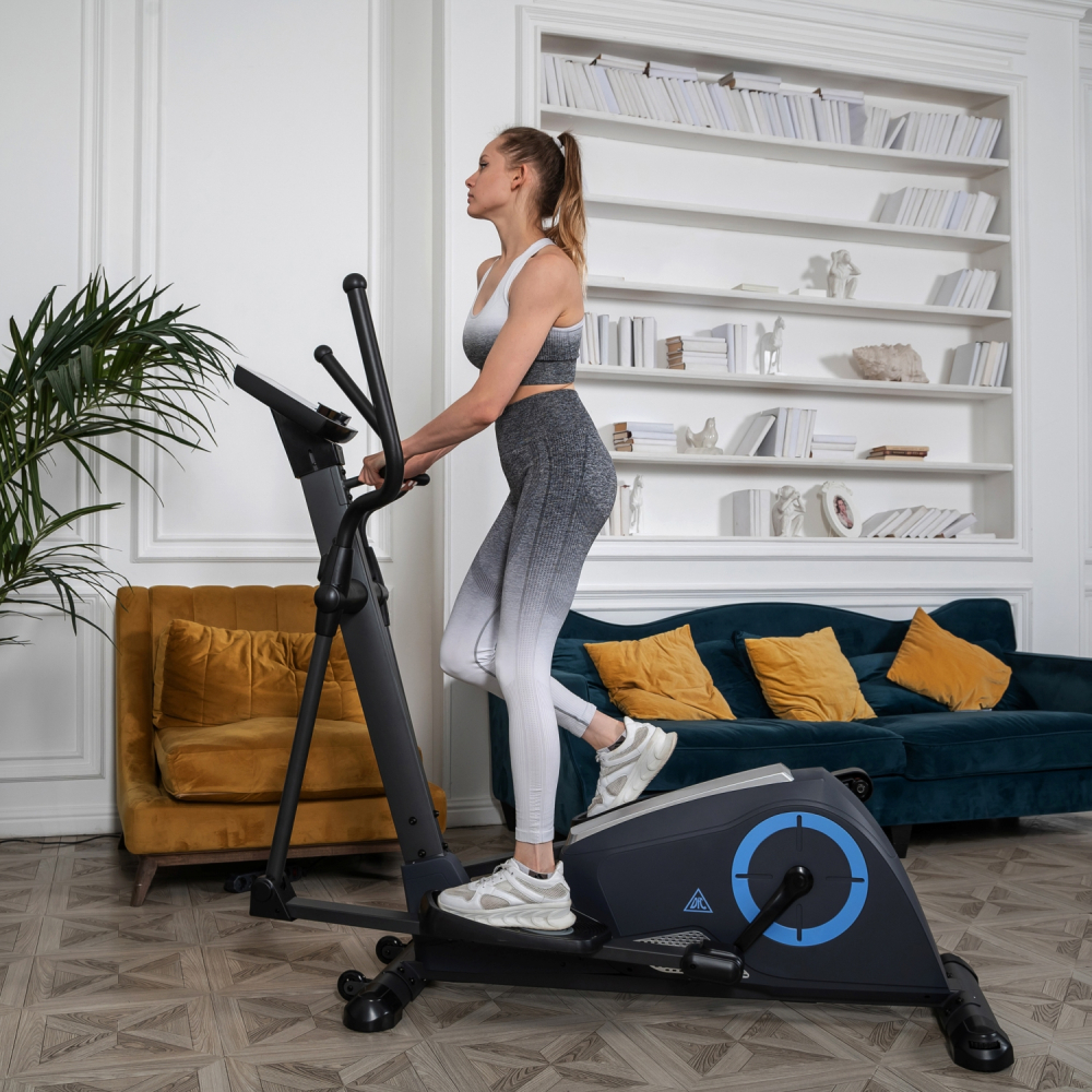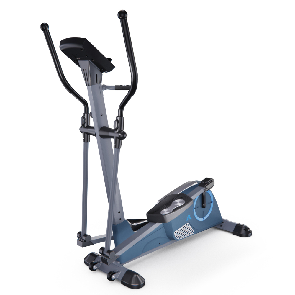 Эллиптический тренажер с задним расположением маховика для домашнего использования. Тренировка на эллиптическом тренажере - это прекрасная альтернатива бегу трусцой или ходьбе, с разницей в высоком сжигании калорий. Благодаря интенсивному движению рук верхние участки тела напрягаются, все тело укрепляется, повышается эффективность тренировки. Среднегабаритная модель с магнитной нагрузкой - система сопротивления с постоянным магнитом и тончайшей настройкой интенсивности. Регулировка нагрузки с помощью ручного привода на стойке тренажера. Консоль с монохромным LCD-дисплеем отображает все необходимые показатели во время тренировки. Измерение пульса осуществляется с помощью встроенных датчиков. Мощная рама тренажера, усиленная конструкция из стального профиля, позволит заниматься пользователю весом до 120 кг. Широкие педали с нескользящей вставкой. Транспортировочные колеса в передней части обеспечивают свободное перемещение тренажера по комнате. Задний стабилизатор с регулировкой положения на неровной поверхности. Показания консоли: время, расстояние, количество сожженных калорий, скорость, пульс