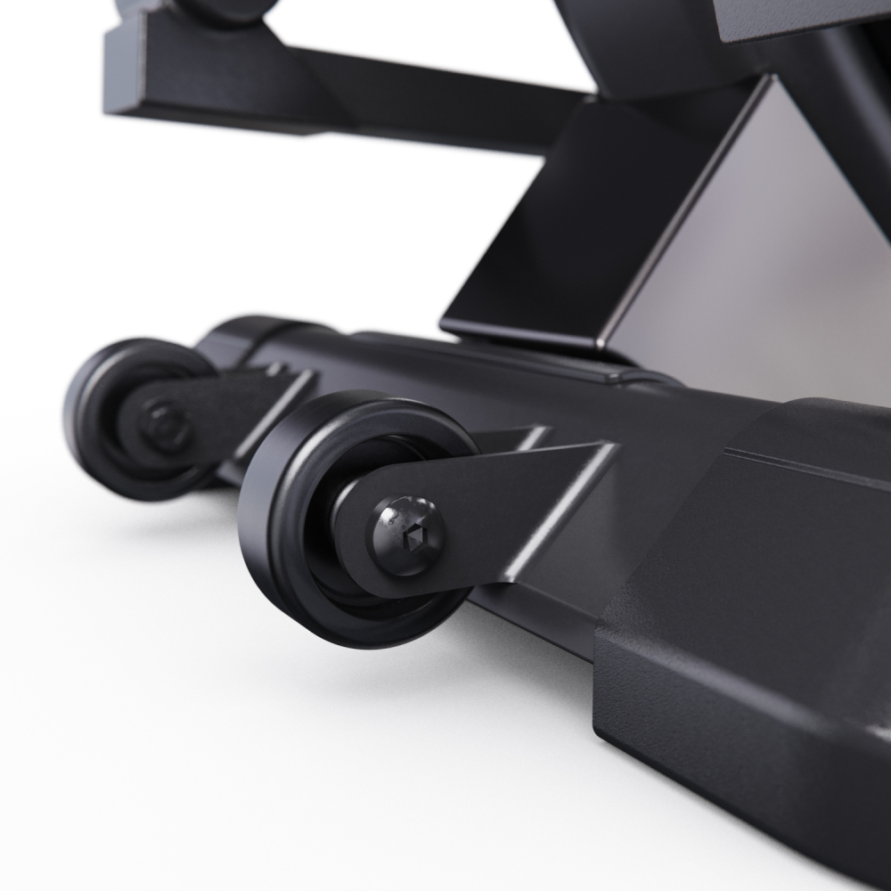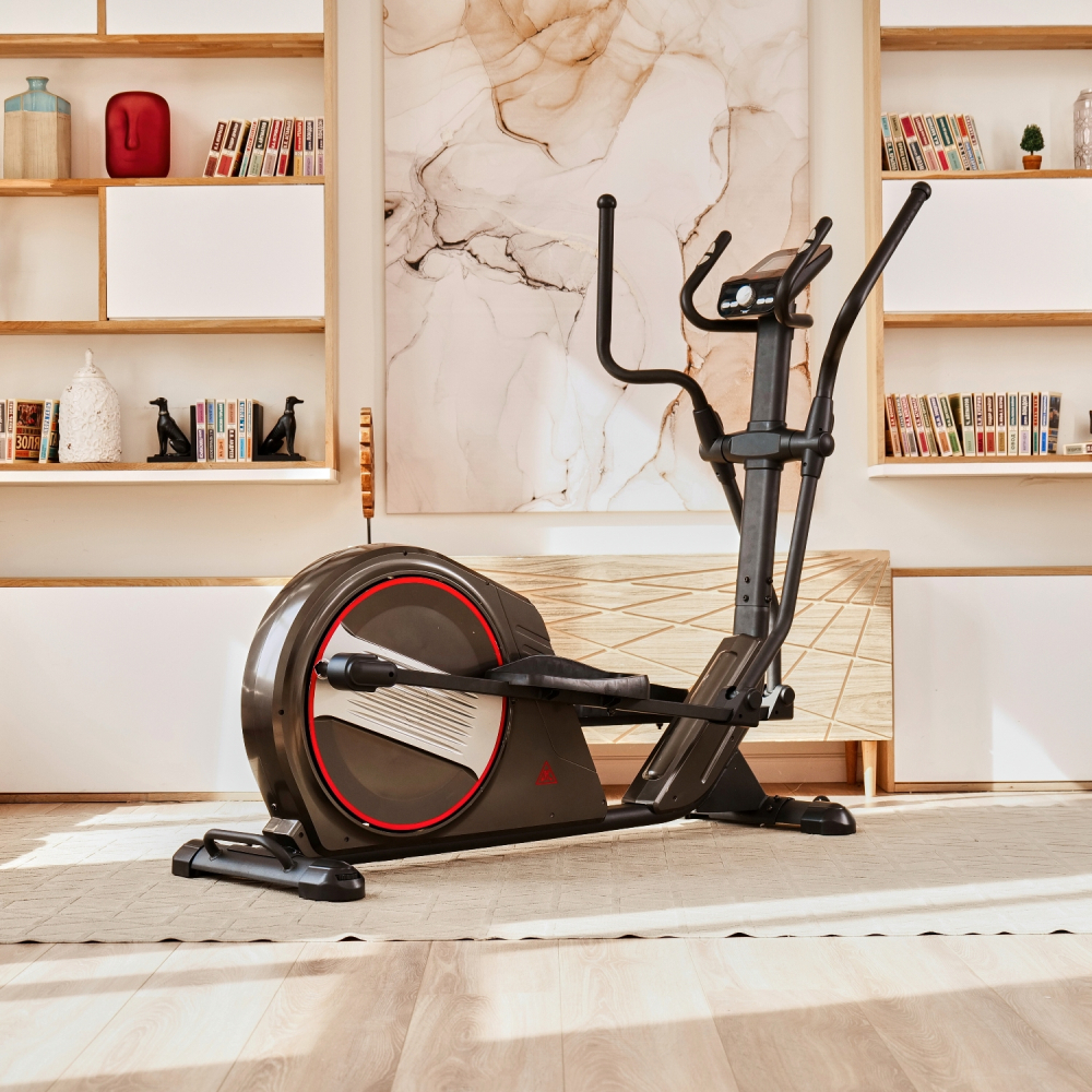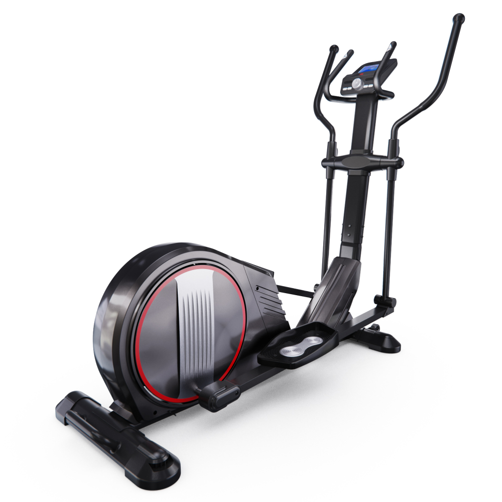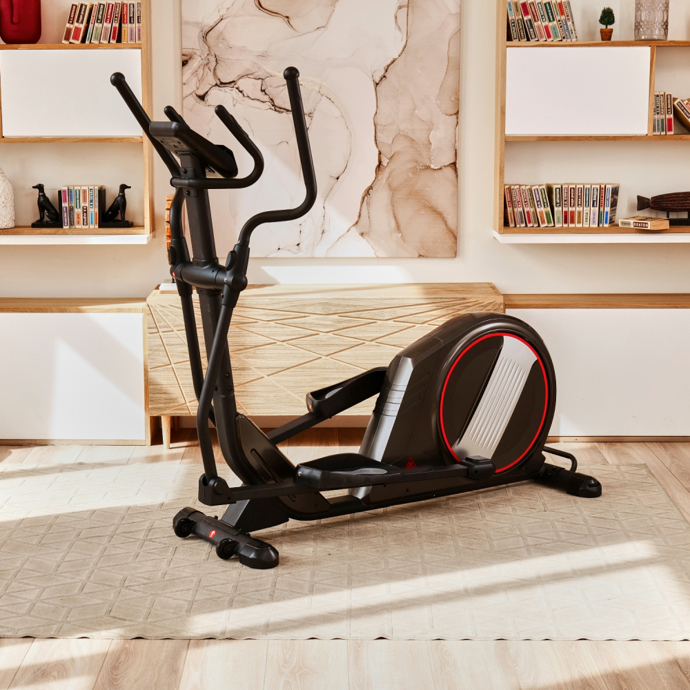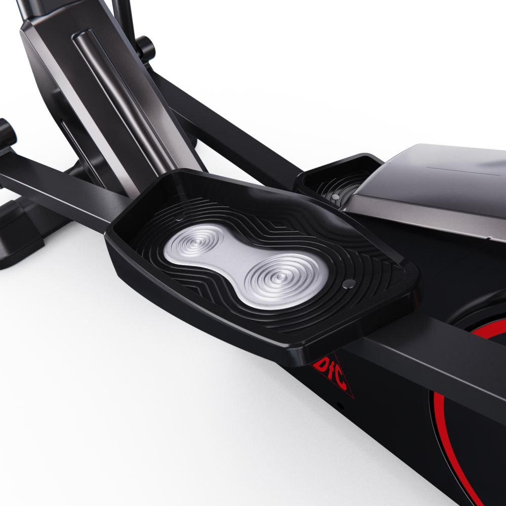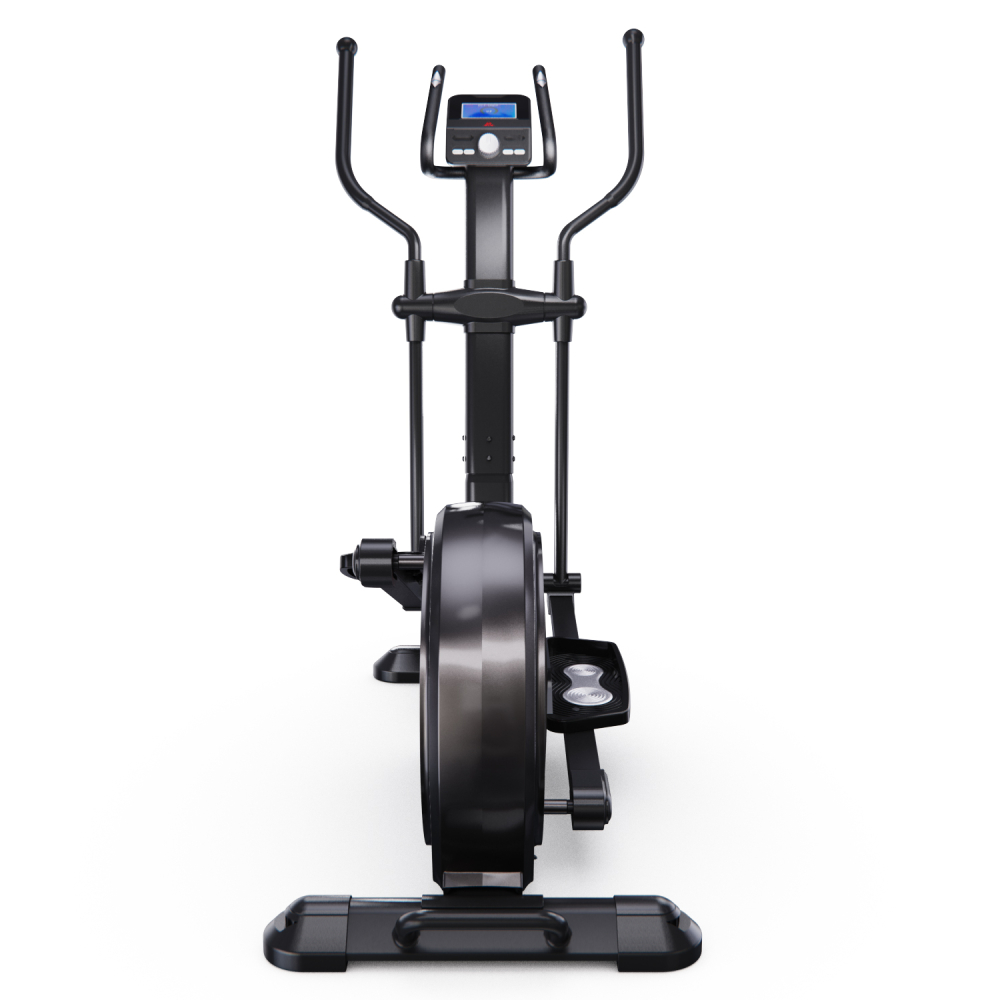 Эллиптический тренажер с задним расположением маховика для домашнего использования. Тренировка на эллиптическом тренажере - это прекрасная альтернатива бегу трусцой или ходьбе, с разницей в высоком сжигании калорий. Благодаря интенсивному движению рук верхние участки тела напрягаются, все тело укрепляется, повышается эффективность тренировки. Модель с удлиненной базой и бесшумной магнитной нагрузкой - система сопротивления с постоянным магнитом и тончайшей настройкой интенсивности. Электронная регулировка сопротивления с помощью компьютера. На тренажере установлен простой и современный компьютер с ЖК-дисплеем. Управление с помощью большой ручки „Push & Turn“. На дислее отображается весь необходимый список параметров тренировки. Измерение пульса осуществляется с помощью встроенных датчиков на дополнительных поручнях. Мощная рама тренажера, усиленная конструкция из стального профиля, позволит заниматься пользователю весом до 135 кг. Широкие педали с нескользящей вставкой. Транспортировочные колеса в передней части обеспечивают свободное перемещение тренажера по комнате. Задний стабилизатор с регулировкой положения на неровной поверхности. Показания консоли: время, расстояние, количество сожженных калорий, скорость, пульс, жироанализатор BodyFat, фитнес-тест Recovery