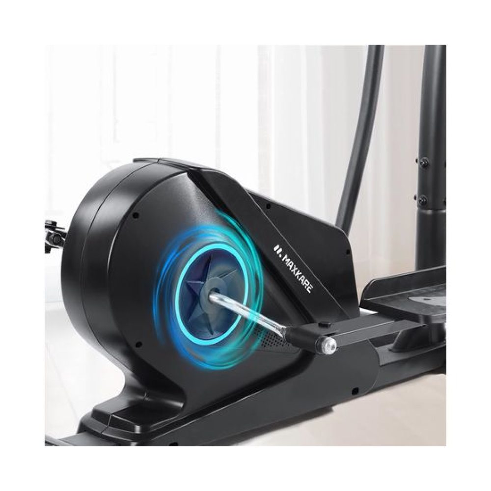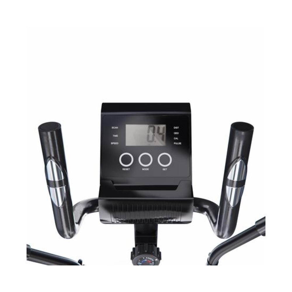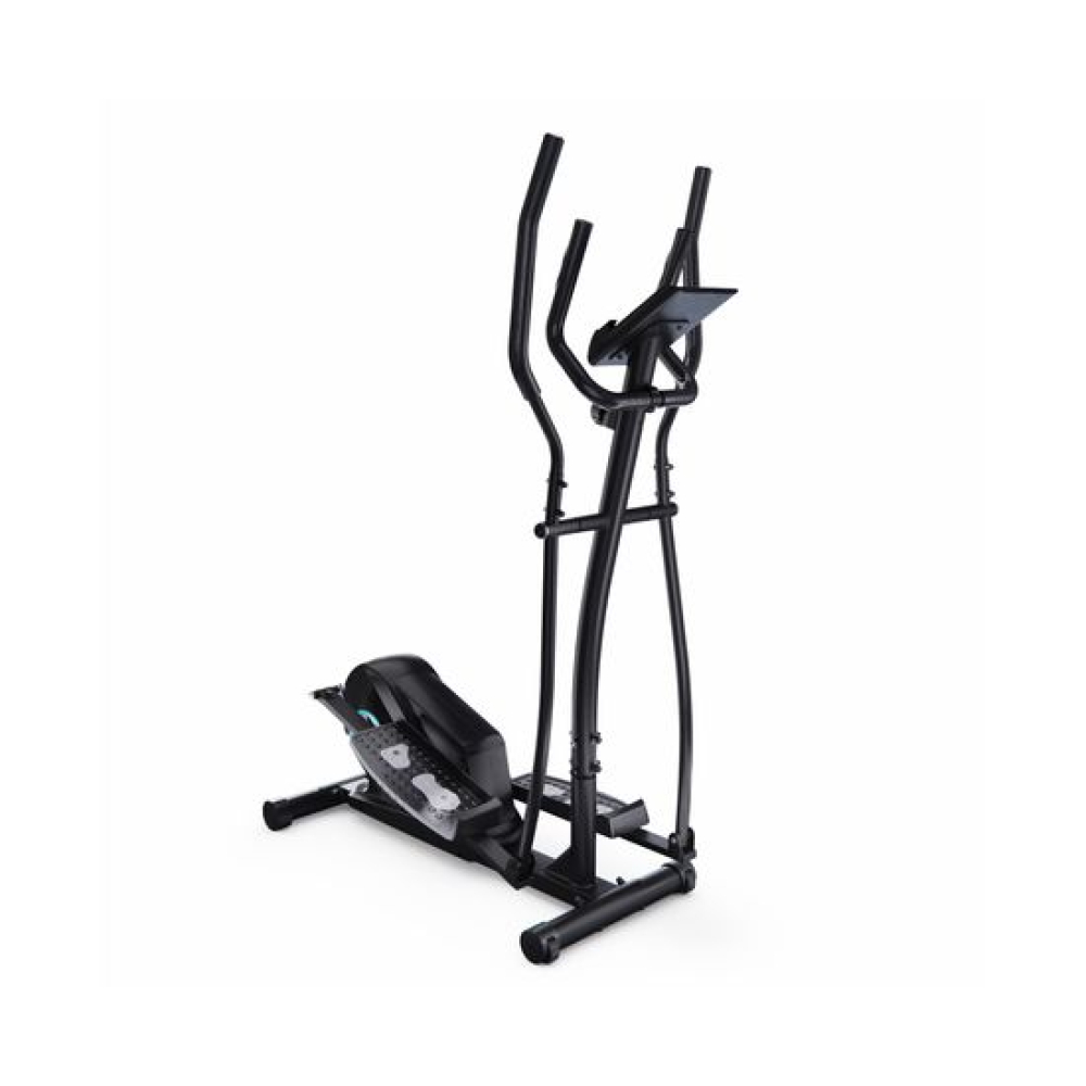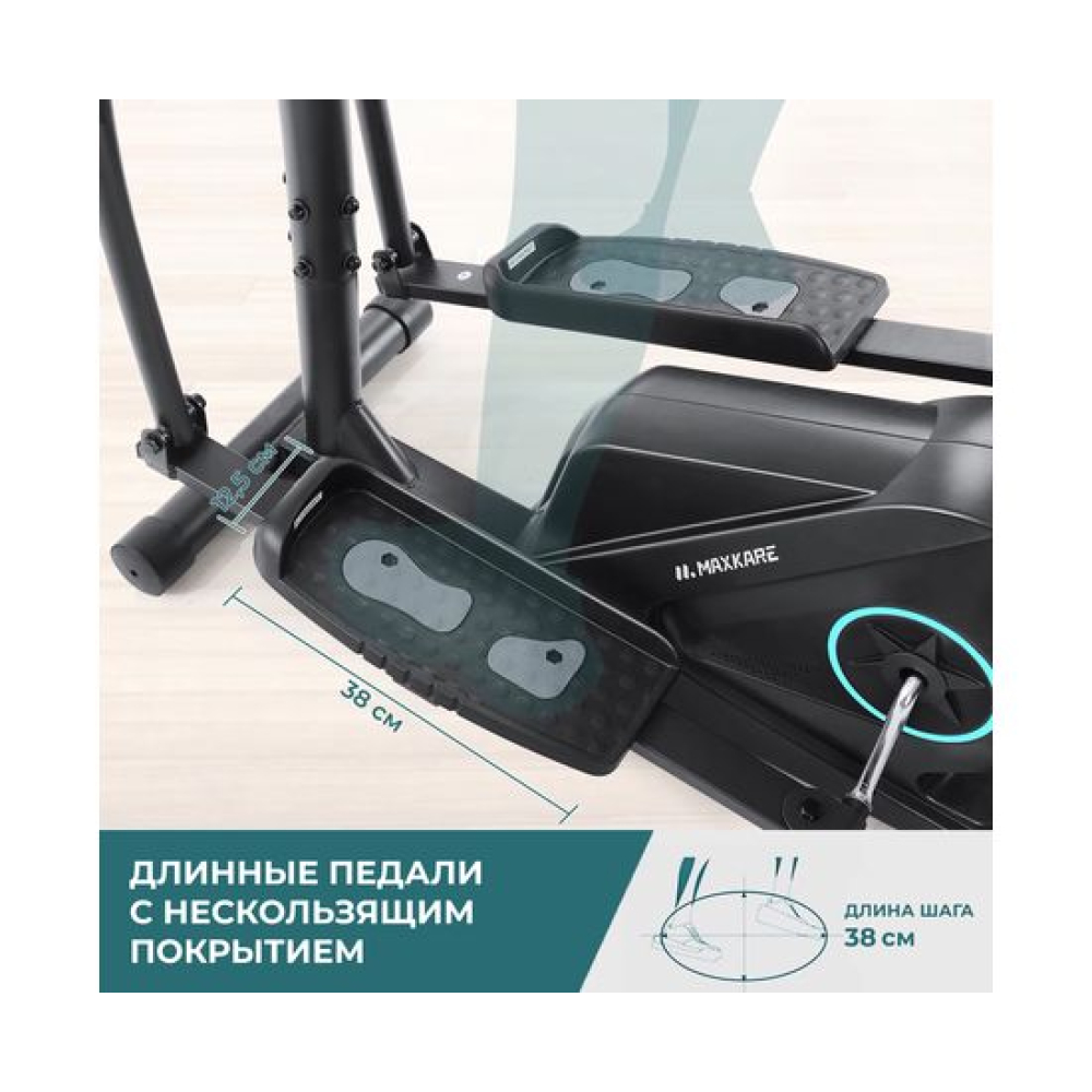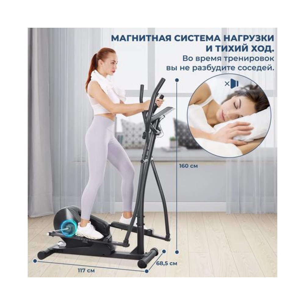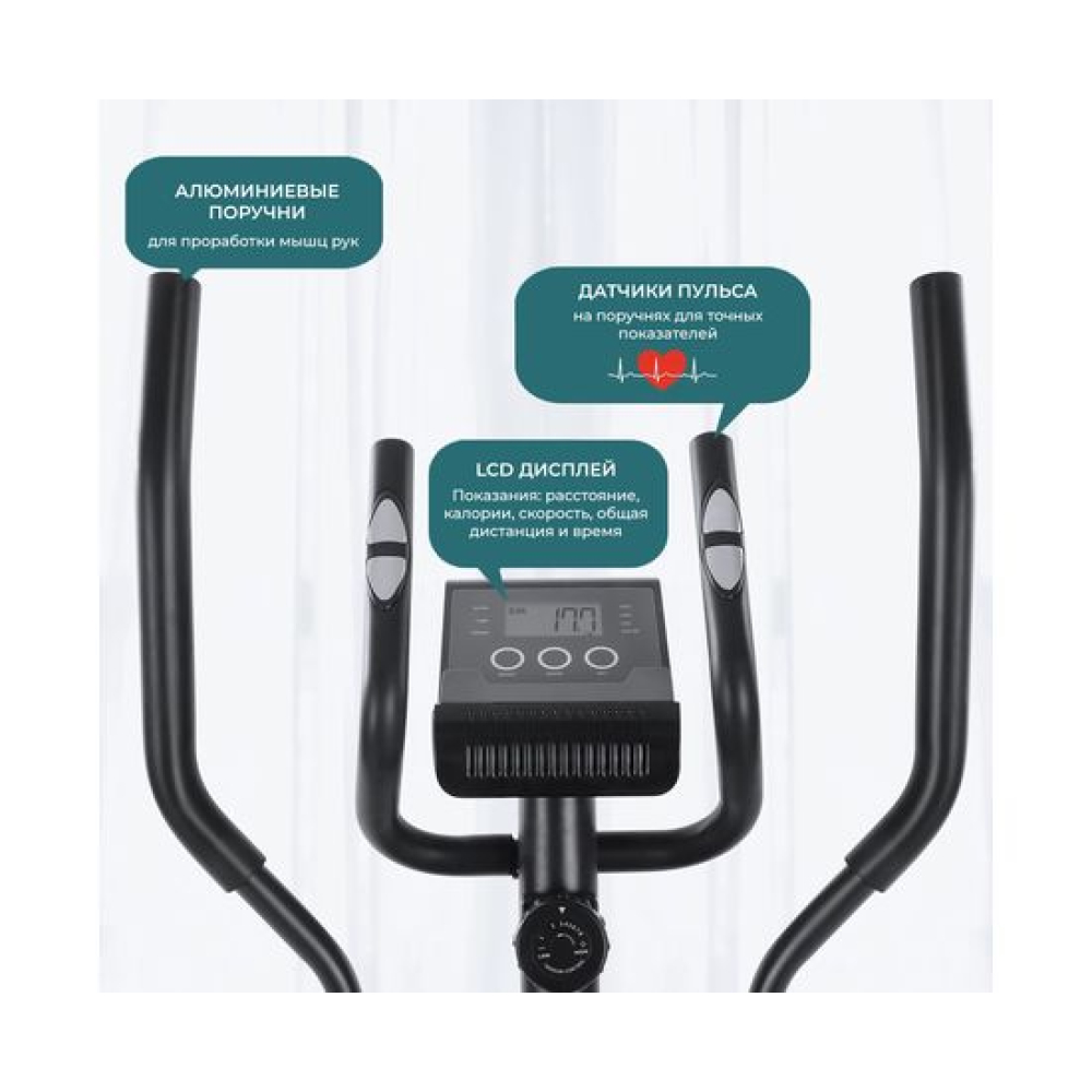 Эллиптический тренажёр DFC MAXKARE создан для тех, кто хочет поддерживать физическую форму и заботиться о своём здоровье. Благодаря заднему тихому маховику и магнитной системе нагрузки, вы сможете наслаждаться комфортной тренировкой без лишнего шума.Монохромный LCD-дисплей отображает скан, время, расстояние, калории, скорость, пульс и общую дистанцию. Сенсорные датчики на поручнях позволяют контролировать ваш пульс во время тренировки.Тренажёр имеет максимальный вес пользователя 130 кг и длину шага 38 см. Механическая регулировка нагрузки предлагает 8 уровней сложности, а транспортировочные ролики и компенсаторы неровности пола обеспечивают стабильность и удобство использования.В комплекте идёт держатель для планшета, который позволит вам следить за прогрессом своих тренировок. Тренажёр работает от двух батареек типа AA (не входят в комплект).