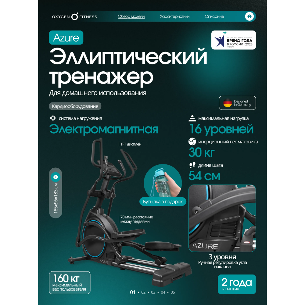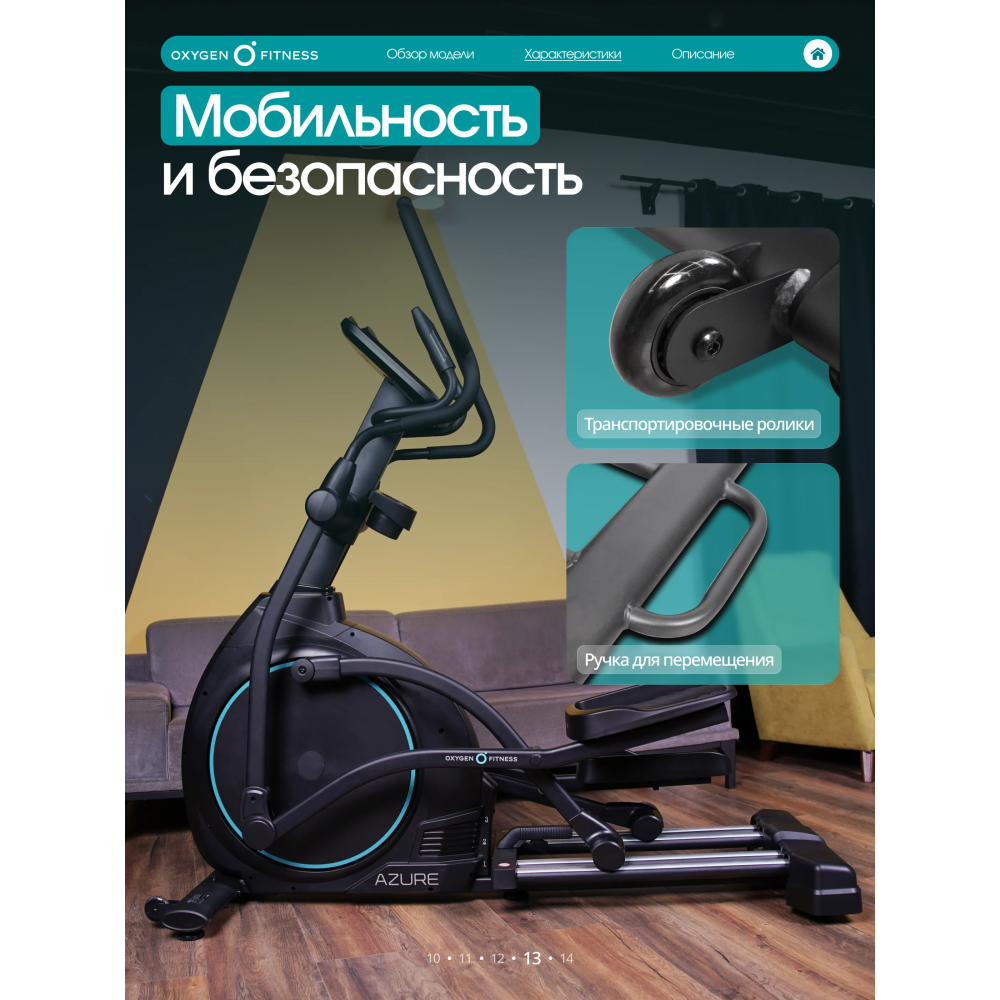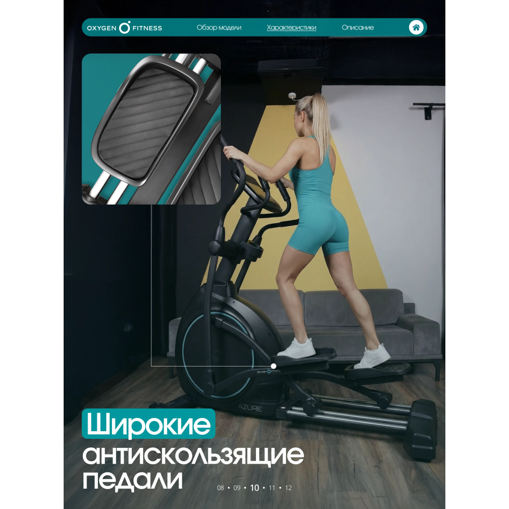 OXYGEN FITNESS AZURE — высокотехнологичный эллиптический тренажёр для домашних тренировок продвинутого уровня. Модель ориентирована на пользователей, которым важна длина шага, точная настройка нагрузки, работа по пульсу и расширенная аналитика тренировки. AZURE сочетает в себе эргономику клубного оборудования и функциональность, адаптированную для комфортного использования дома.