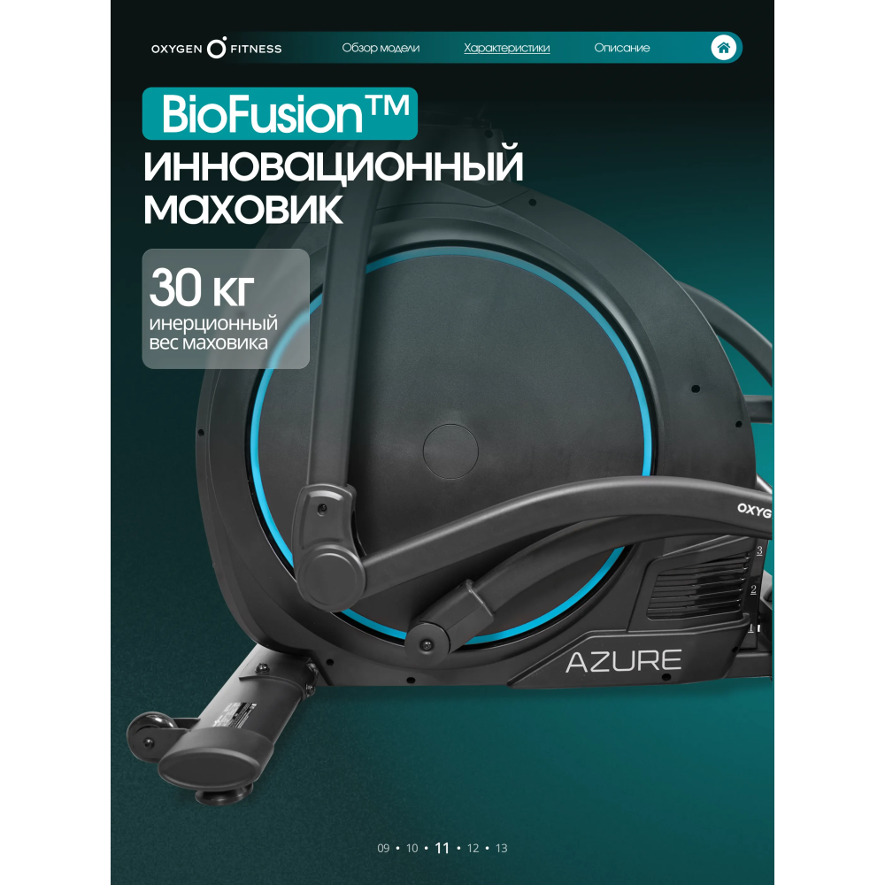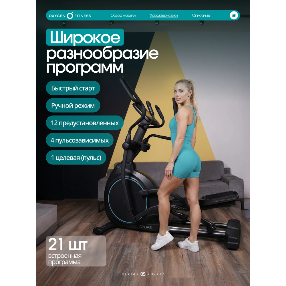 OXYGEN FITNESS AZURE — эллиптический тренажёр для тех, кто хочет получить максимум от домашних кардиотренировок: продвинутую биомеханику, интеллектуальные программы и уровень комфорта, сравнимый с профессиональным фитнес-клубом.