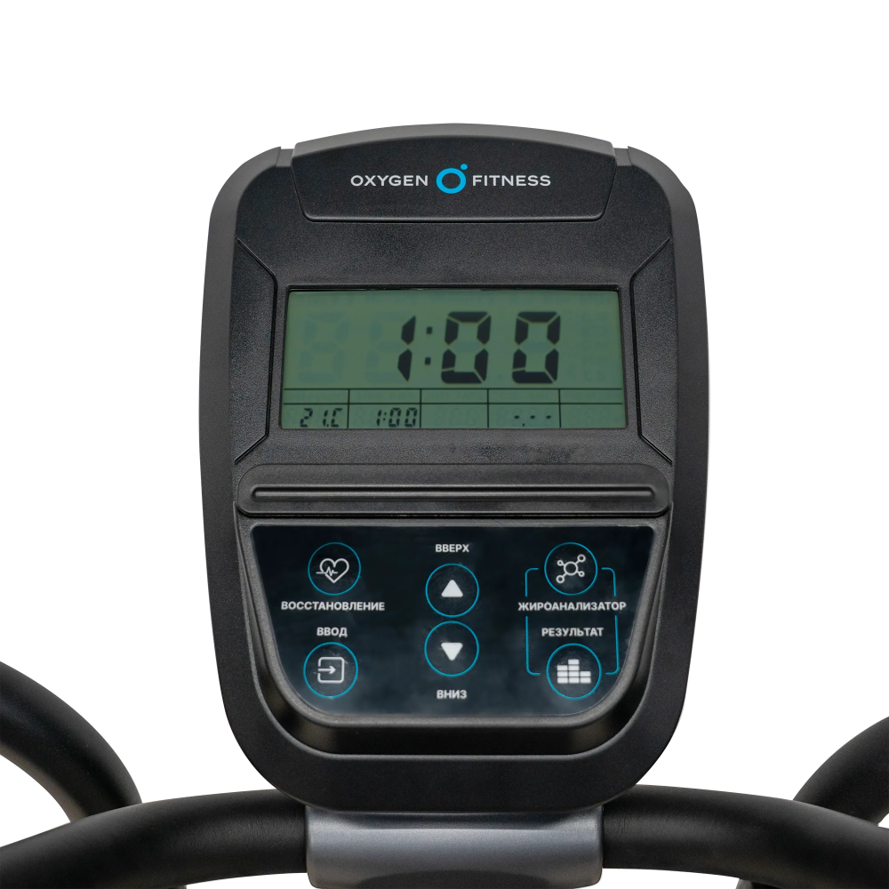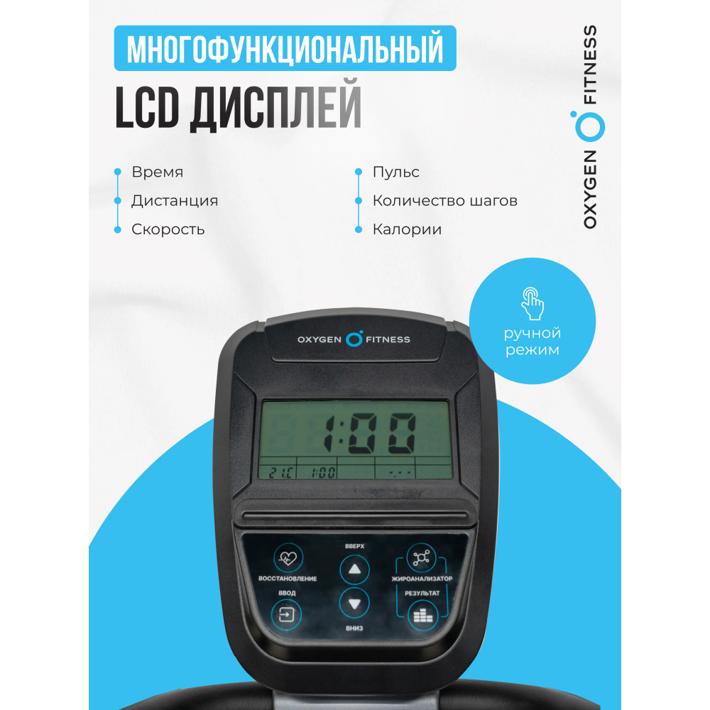 Консоль тренажера оснащена монохромным LCD-дисплеем, на котором отображаются ключевые параметры: время, скорость, дистанция, калории, пульс и количество шагов. Удобные двухпозиционные нескользящие рукоятки с сенсорными датчиками пульса обеспечивают комфорт и безопасность во время занятий. Тренажер имеет ручной режим тренировки с функцией жироанализатора, что позволяет пользователю более эффективно отслеживать свои результаты.
