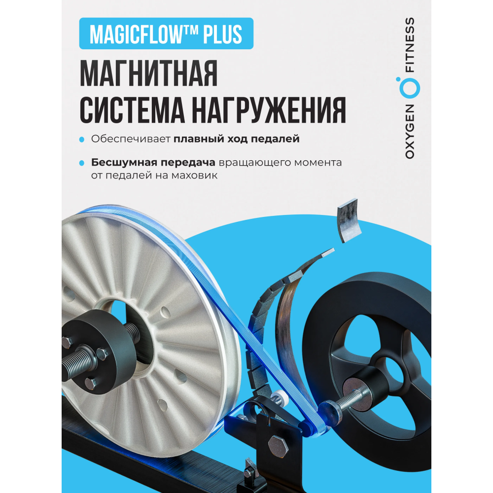 Тренажер работает на основе магнитной системы нагружения magicFLOW™ PLUS и предлагает 8 уровней нагрузки, что позволяет пользователю настраивать интенсивность тренировок в зависимости от своих целей. Инерционный вес маховика составляет 22 кг, что обеспечивает стабильность и плавность хода. Длина шага в 450 мм и расстояние между педалями 200 мм способствуют естественному движению, минимизируя нагрузку на суставы, а трехкомпонентный шатун обеспечивает надежную и эффективную работу тренажера.