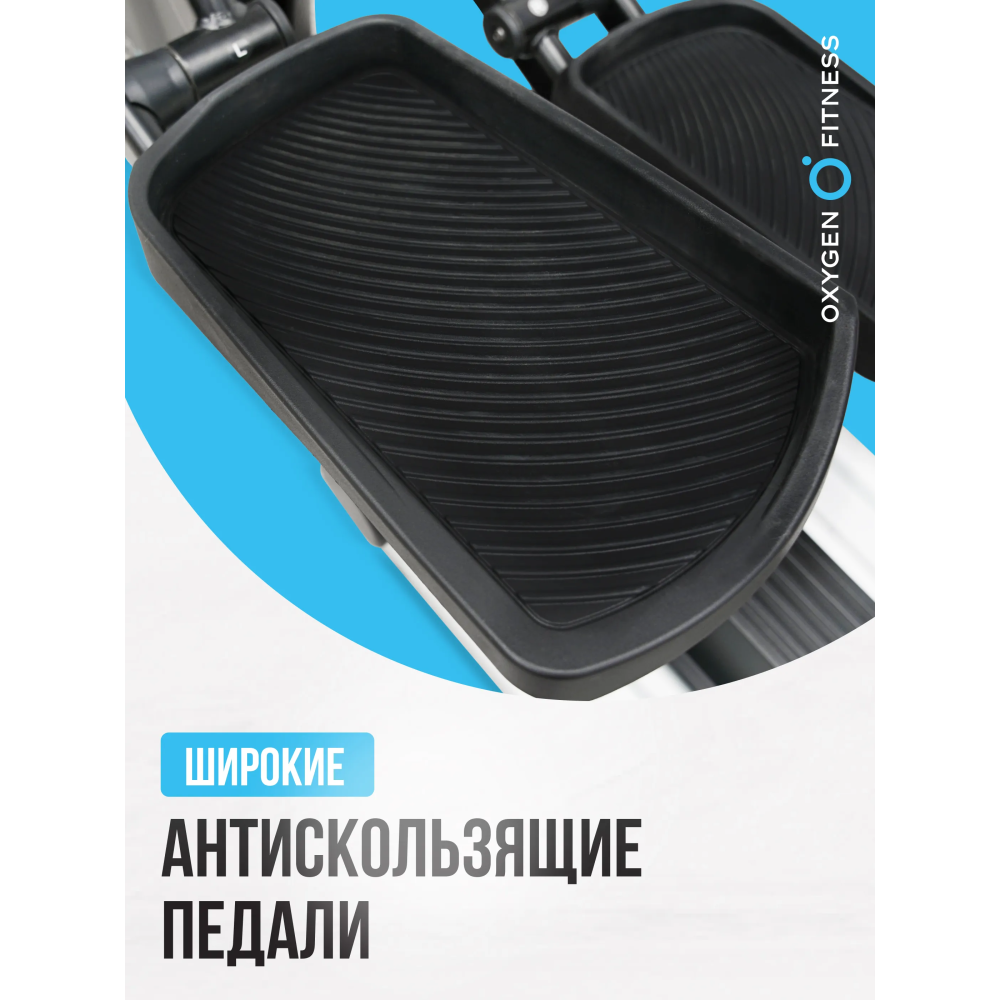 Эллиптический тренажер оснащен удобными изогнутыми подвижными поручнями с мягкой оплеткой, а также неподвижными поручнями для измерения пульса. Расстояние между педалями составляет 110 мм, а длина шага — 490 мм, что обеспечивает естественный и комфортный ход во время тренировки. Педали имеют антискользящее покрытие и увеличенный размер для максимального удобства. Эллиптический тренажер OXYGEN FITNESS E700 PRO — это идеальное решение для тех, кто хочет добиться максимальных результатов в кардионагрузках и поддерживать отличную физическую форму!