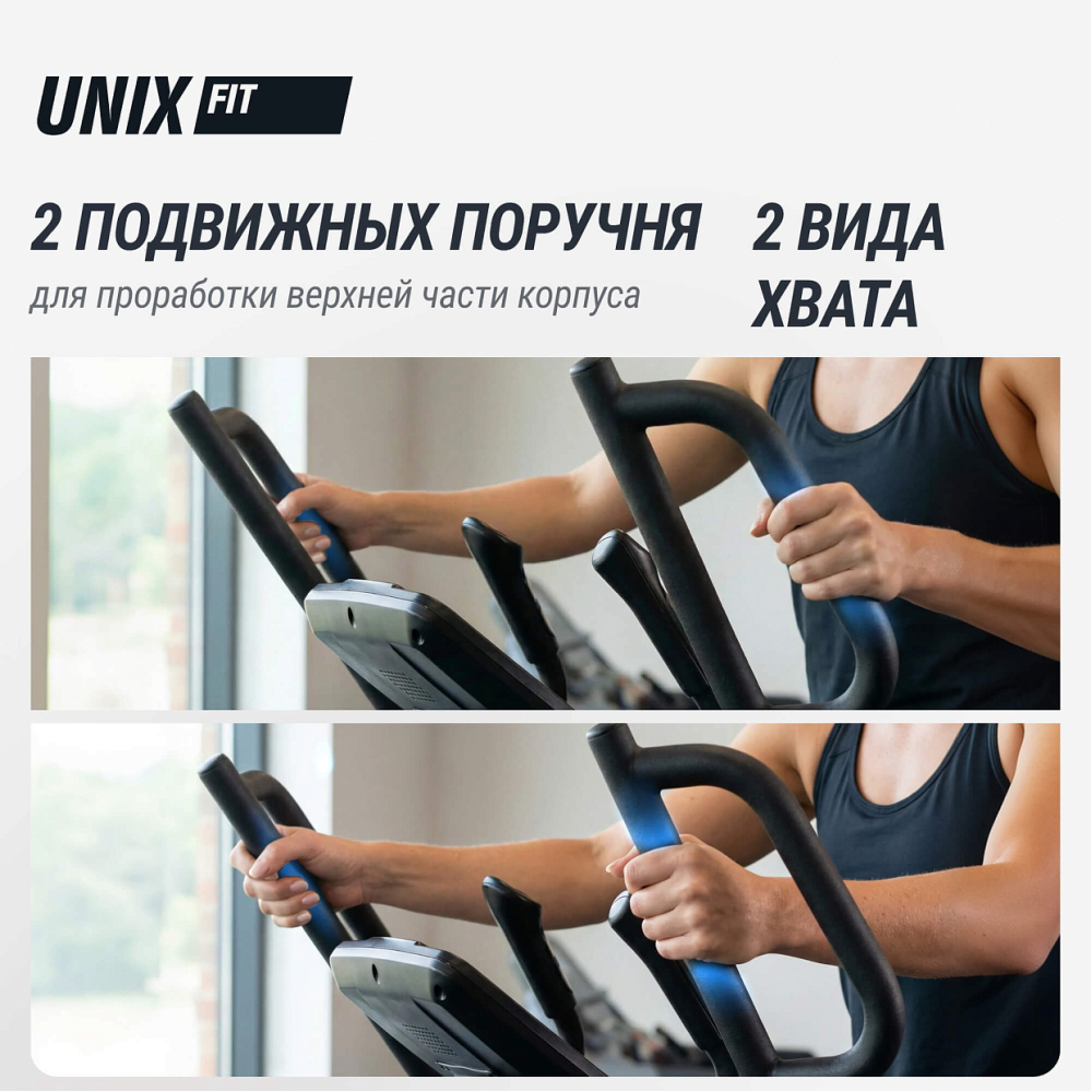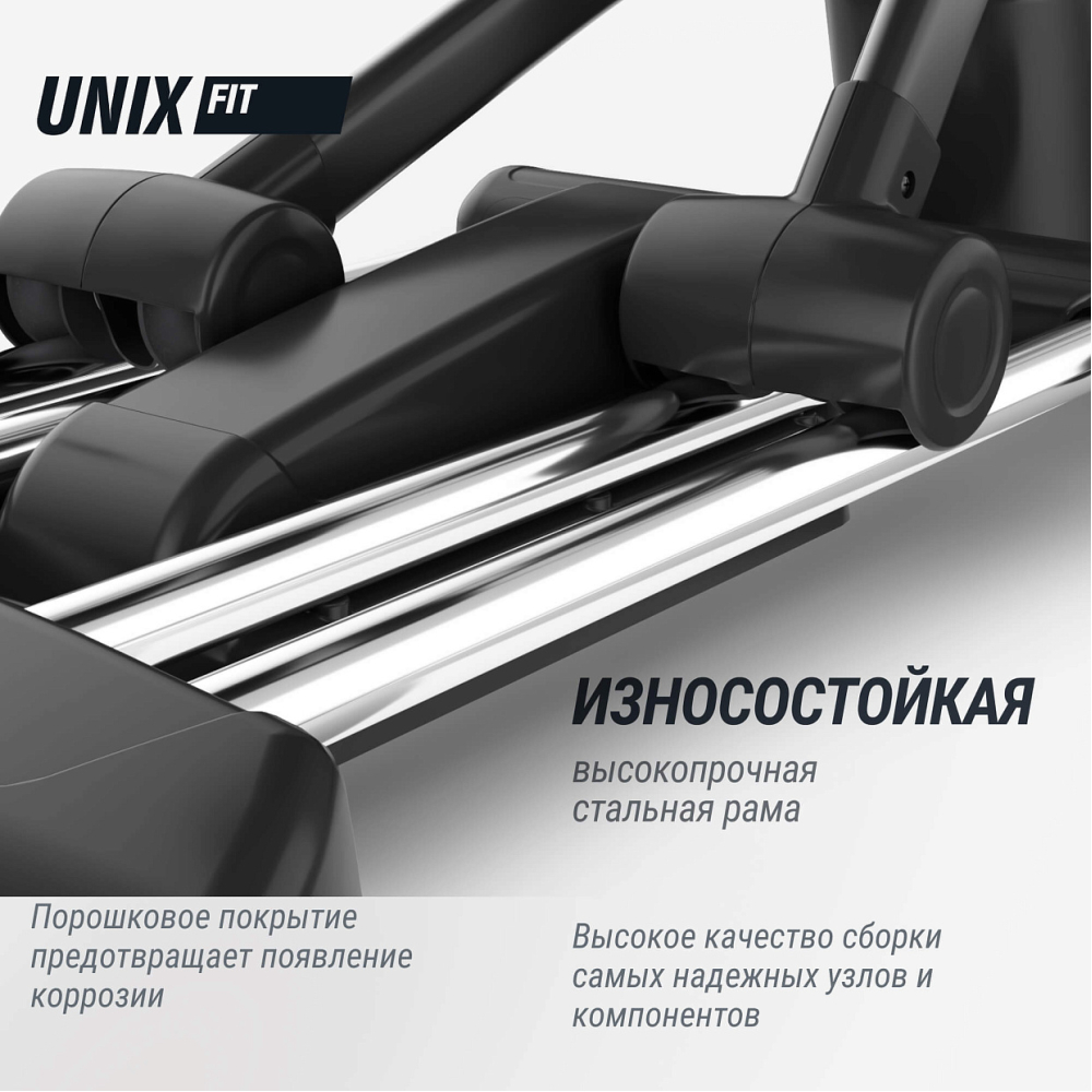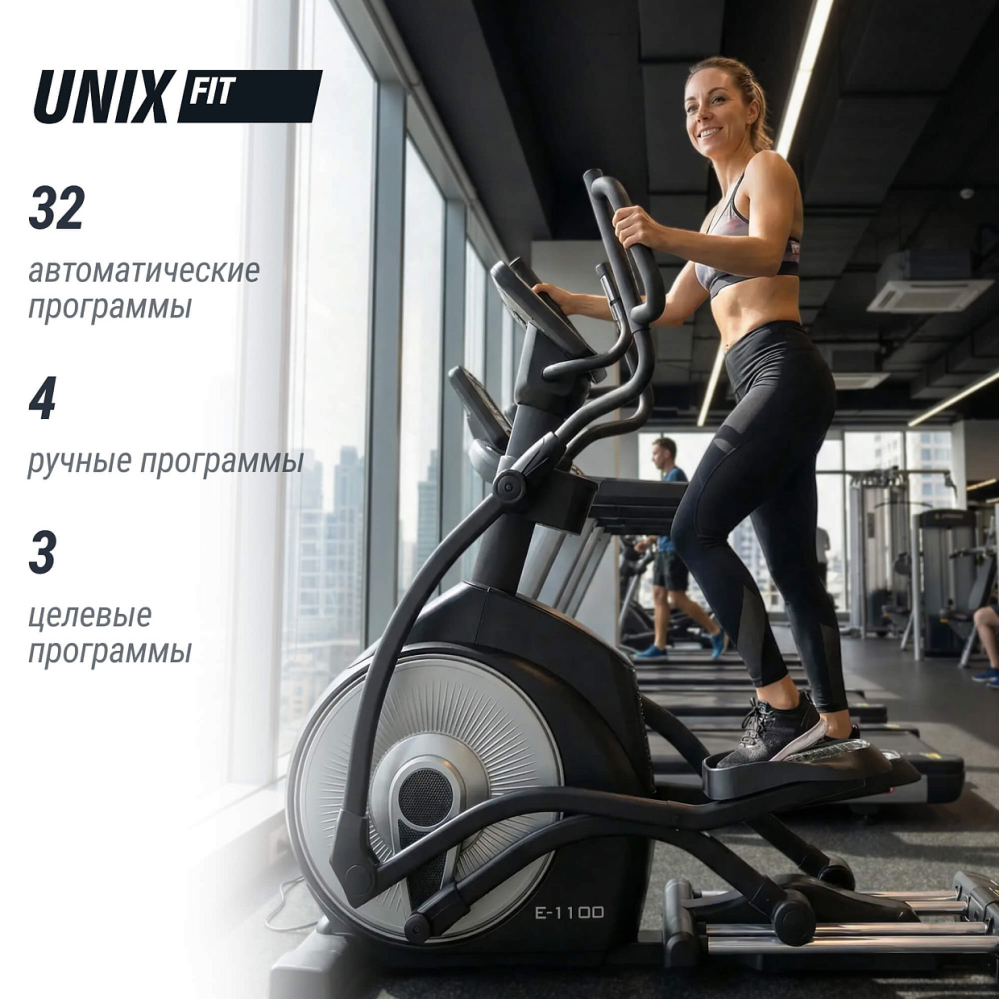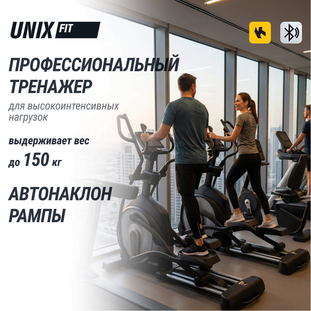 Эллиптический тренажер UNIX Fit E-1100 PRO – это коммерческий профессиональный эллипсоид для фитнес-центра, спортивного клуба или домашнего использования. Тренажёр обладает множеством полезных и разнообразных функций, чтобы помочь достичь лучших результатов и поддерживать спортивную форму. Эллиптический тренажёр снижает нагрузку на позвоночный столб, суставы и кости всего организма за счёт движения педалей по траектории эллипса без отрыва стопы. Занятия на эллиптическом тренажере тренируют выносливость организма, улучшают метаболизм. Эллиптические тренажеры оптимальны для интервальных тренировок, подготовки к силовым нагрузкам, мышечной «сушки», правильного и эффективного похудения. . Преимущества. Автоматическая регулировка рамы. Эллипс оснащен автоматической регулировкой наклона рамы от 0 до 21 уровня, что позволяет адаптировать тренировку под индивидуальные потребности и цели каждого пользователя. Благодаря функции угла наклона будут задействованы разные группы мышц. Например, если необходимо проработать мышцы ног, педали при вращении должны быть сильно наклонены вперед . - Электромагнитная система нагружения. Тяжелый маховик с инерционным весом 30 кг и электромагнитное сопротивление с электронным блоком управления, обеспечивают сбалансированную нагрузку и плавное переключение, способную выдерживать интенсивное использование в спортзалах. Тренажер позволяет настраивать уровни нагрузки от легкого (1) до тяжелого (32) в зависимости от ваших потребностей. Вы сможете контролировать интенсивность тренировки, настраивая электромагнитное сопротивление в соответствии с вашими целями и уровнем физической подготовки. Электромагнитная система сопротивления отличается большой мощностью, надежностью и эффективностью . - Q-фактор. Эллиптический тренажер с длиной шага 52 см и оптимальным расстоянием между педалями 9 см (Q-фактор) обеспечивает плавное и естественное движение, минимизируя нагрузку на суставы и предотвращая возможные травмы . - Переднеприводная система. В эллиптическом тренажере UNIX Fit E-1100 PRO маховик расположен спереди. Такая конструкция позволяет увеличить максимальную длину шага и обеспечивает естественное перемещение педалей. Благодаря высоко расположенным поручням, устройство подойдет пользователям любого роста. . . - Встроенные режимы. Спортивный тренажер эргометр предлагает 32 режима тренировки и 32 различных уровня сопротивления, включая интенсивные интервальные тренировки, хилл-программы и многое другое. Это позволит разнообразить тренировку и достичь максимальных результатов, прорабатывая и уделяя отдельное внимание разным группам мышц. . . - Усиленная рама и особопрочные материалы гарантируют долговечность и надежность тренажера. Максимальный вес пользователя – 150 кг. Гарантия на тренажер 2 года . - Датчики пульса на поручнях. В тренажере предусмотрено два вида поручней — подвижный поручень предназначен для более интенсивной проработки мышц плечевого пояса, а фиксированный для менее интенсивных тренировок. На неподвижных поручнях эллипсойда расположены датчики пульса для измерения частоты сердцебиения и 4 кнопки управления: углом наклона рамы, а так же изменение уровня нагрузки. Чтобы вы могли повышать или понижать интенсивность тренировки в процессе занятий на эллиптическом тренажере 