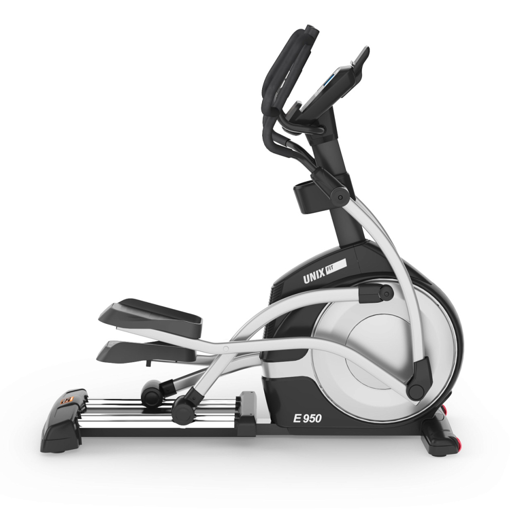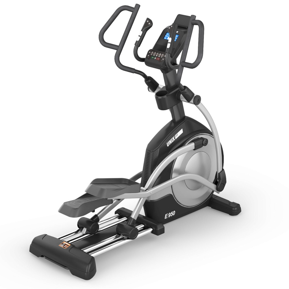 UNIX Fit E-950 PRO - профессиональный эллиптический тренажер полукоммерческого класса, воплощение инноваций и производительности. Являетесь ли вы профессиональным спортсменом, любителем фитнеса или владельцем тренажерного зала, этот спортивный тренажёр содержит все необходимое, чтобы оправдать и превзойти ваши ожидания! Эллиптический тренажёр снижает нагрузку на позвоночный столб, суставы и кости всего организма за счёт движения педалей по траектории эллипса без отрыва стопы. Занятия на эллиптическом тренажере тренируют выносливость организма, улучшают метаболизм. Эллиптические тренажеры оптимальны для интервальных тренировок, подготовки к силовым нагрузкам, мышечной «сушки», правильного и эффективного похудения. . Преимущества.. - Q-фактор. Длина шага 53 см, оптимальное расстояние между педалями 9 см (Q-фактор) и фиксируемая траектория шага обеспечивают комфортную и безопасную тренировку на кардио тренажере, без нагрузки на суставы. Длина шага 53 см и Q-фактор 9 см идеально подходит людям с ростом от 180 см . - Электромагнитная система нагружения. Обладая изящным дизайном, эллипсоид с инерционным весом маховика 26 кг и усиленной рамой спроектирован таким образом, чтобы выдерживать суровые условия высокоинтенсивных тренировок, обеспечивая при этом плавные и естественные движения. Тренажер позволяет настраивать уровни нагрузки от легкого (1) до тяжелого (32) в зависимости от ваших потребностей. Вы сможете контролировать интенсивность тренировки, настраивая электромагнитное сопротивление в соответствии с вашими целями и уровнем физической подготовки. Электромагнитная система сопротивления отличается большой мощностью, надежностью и эффективностью . - Переднеприводная система. В эллиптическом тренажере UNIX Fit E-950 PRO маховик расположен спереди. Такая конструкция позволяет увеличить максимальную длину шага и обеспечивает естественное перемещение педалей. Благодаря высоко расположенным поручням, устройство подойдет пользователям любого роста. . . - Усиленная рама и особопрочные материалы гарантируют долговечность и надежность тренажера. Максимальный вес пользователя – 150 кг. Гарантия на тренажер 2 года . - Датчики пульса на поручнях. В тренажере предусмотрено два вида поручней — подвижный поручень предназначен для более интенсивной проработки мышц плечевого пояса, а фиксированный для менее интенсивных тренировок. На неподвижных поручнях эллипсойда расположены датчики пульса для измерения частоты сердцебиения и кнопки изменения нагрузки, чтобы вы могли повышать или понижать интенсивность тренировки в процессе занятий на эллиптическом тренажере . - Функция сна и автоматического отключения. Во включенном состоянии при отсутствии сигнала от датчиков скорости в течение 4 минут система автоматически переходит в состояние паузы. Из состояния паузы при отсутствии какой-либо активности в течение 4 минут система переходит в состояние сна. Из состояния сна система может быть выведена нажатием любой кнопки . - LED - консоль. В системе предустановлено 16 программ с меняющимся уровнем сопротивления, имитирующих различные дорожные и иные условия, что позволяет пользователям бросить вызов самим себе. Дисплей эллипса отображает такие показатели тренировки как время, скорость, калории, дистанция, пульс и обороты в минуту, а приложение Ki