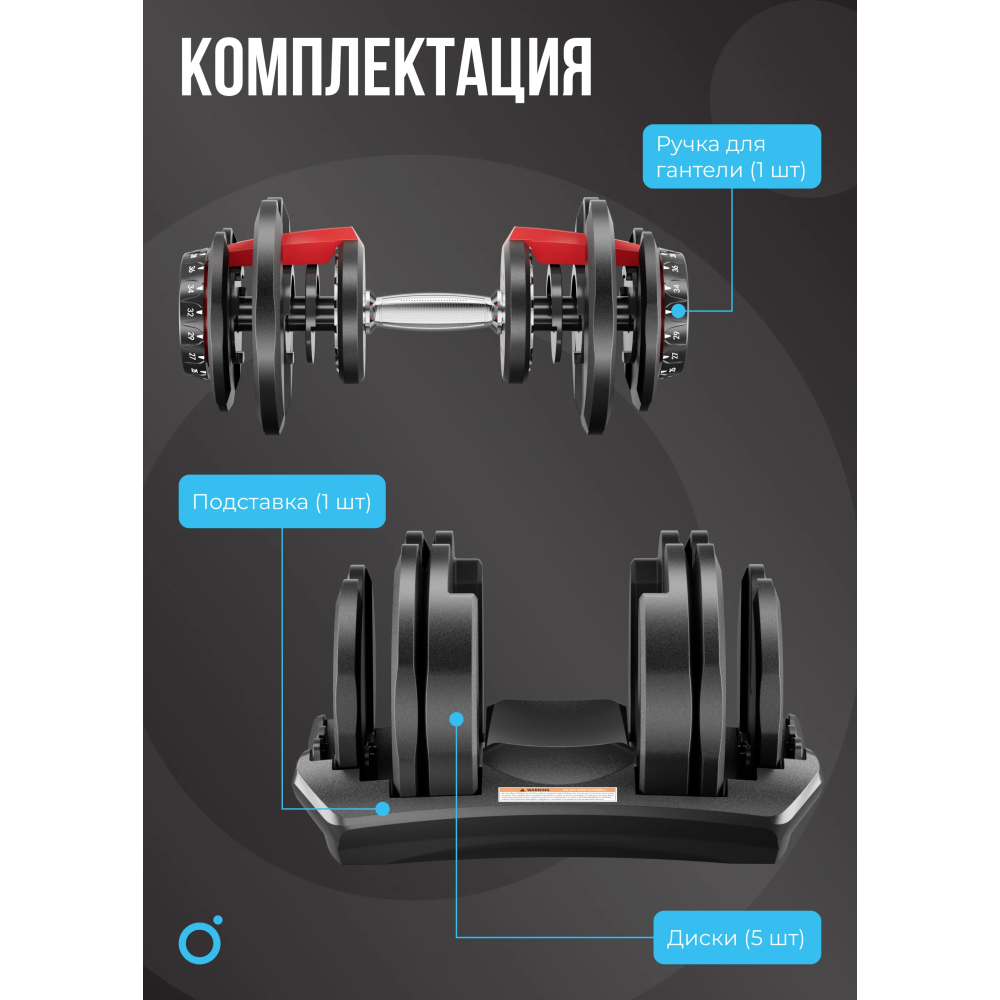 Гантель оснащена рукояткой диаметром 35,8 мм, что обеспечивает надежный захват и комфорт во время тренировок. В комплект входит десять дисков и одна ручка для гантелей, что позволяет легко менять уровень нагрузки. Поставляемая подставка из ABS и PP пластика обеспечивает удобное хранение и экономит место, что делает использование гантелей еще более практичным.