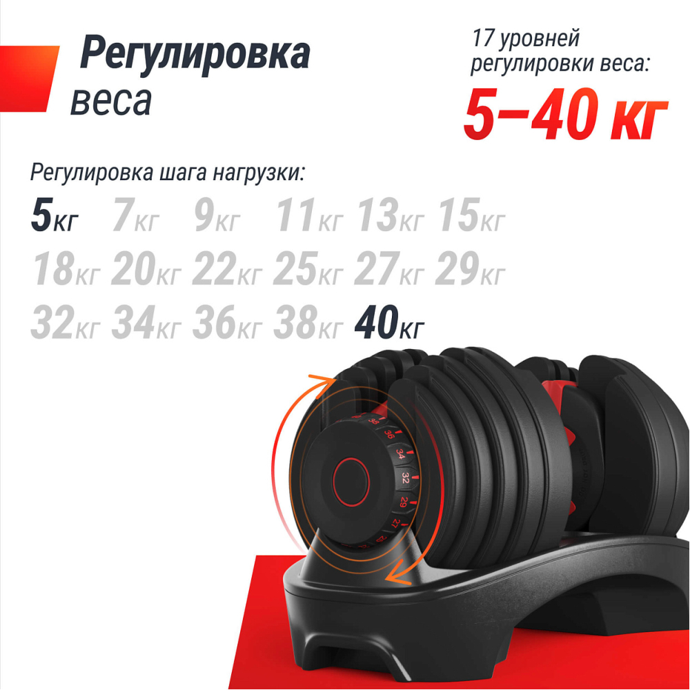 | Регулировка шага нагрузки | 5кг - 7кг - 9кг - 11кг - 13кг - 15кг - 18кг - 20кг - 22кг - 25кг - 27кг - 29кг - 32кг - 34кг - 36кг - 38кг - 40кг |
