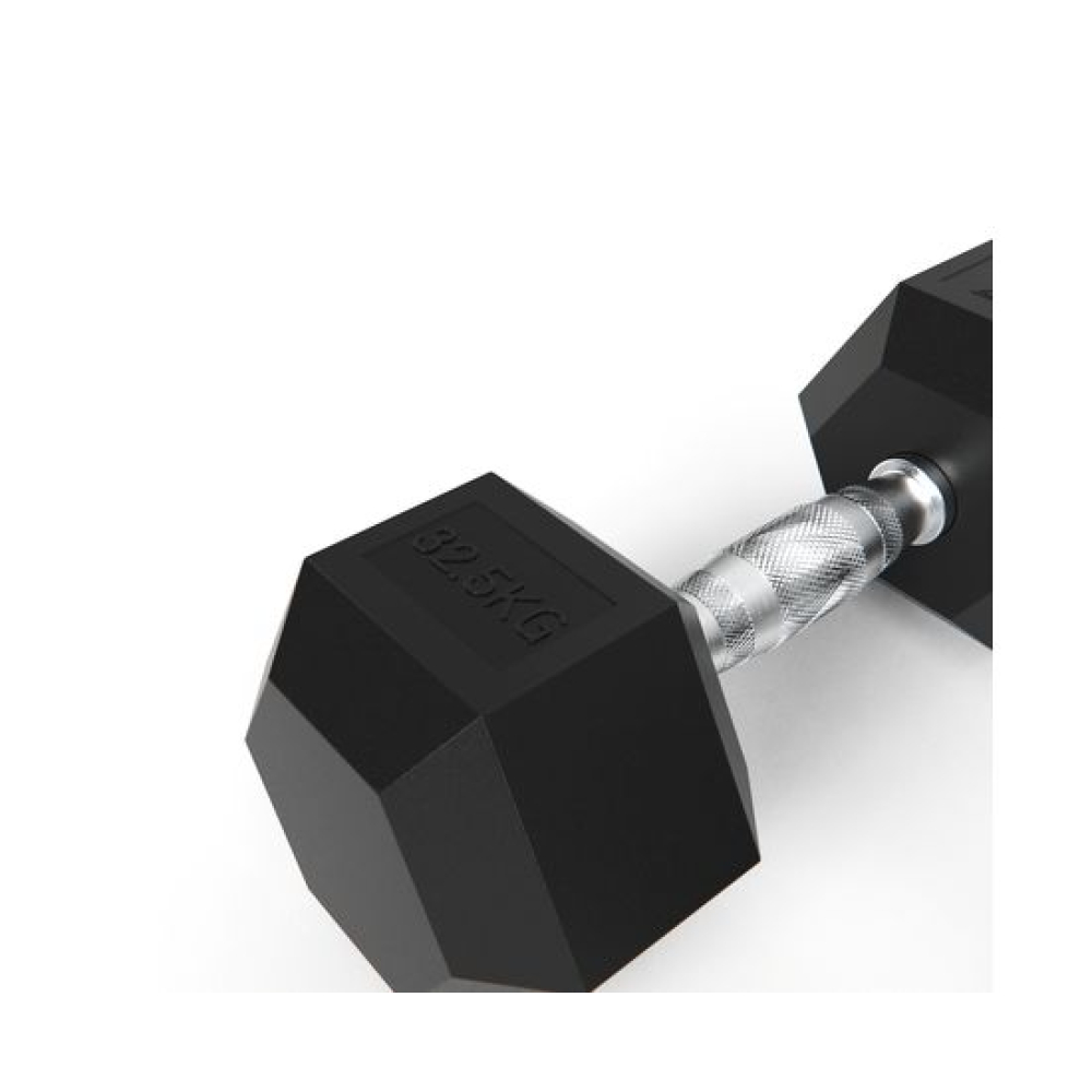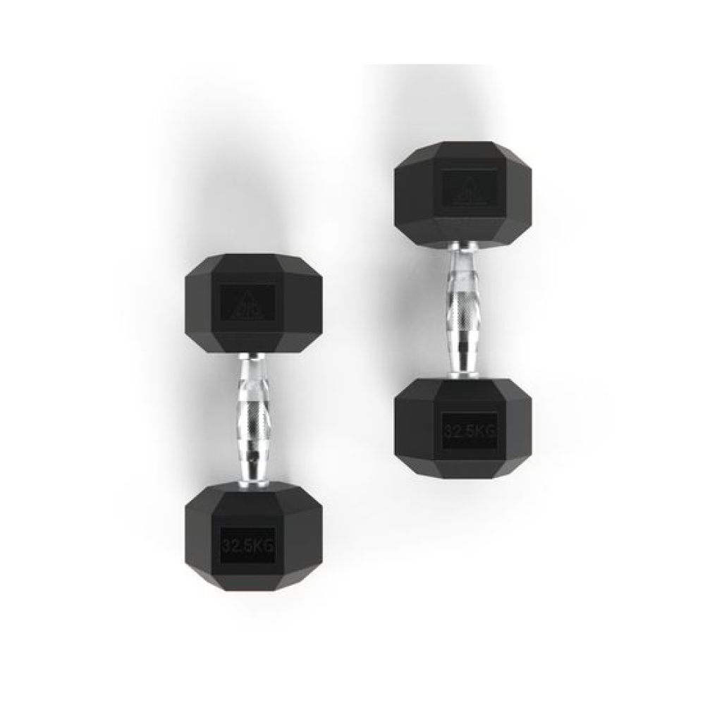 Гантель обрезиненная с хромированной ручкой. Вес гантели 32.5 кг, в комплекте 2 штуки (пара).Ручка с насечками для предотвращения скольжения.Гексагональная гантель – обрезиненная модель удобной конструкции.Гантель имеет много граней и не катается по полу. Обрезиненная поверхность не царапает пол при ударе.Гантели используются в фитнесе, лечебной физкультуре, бодибилдинге и других спортивных тренировках.