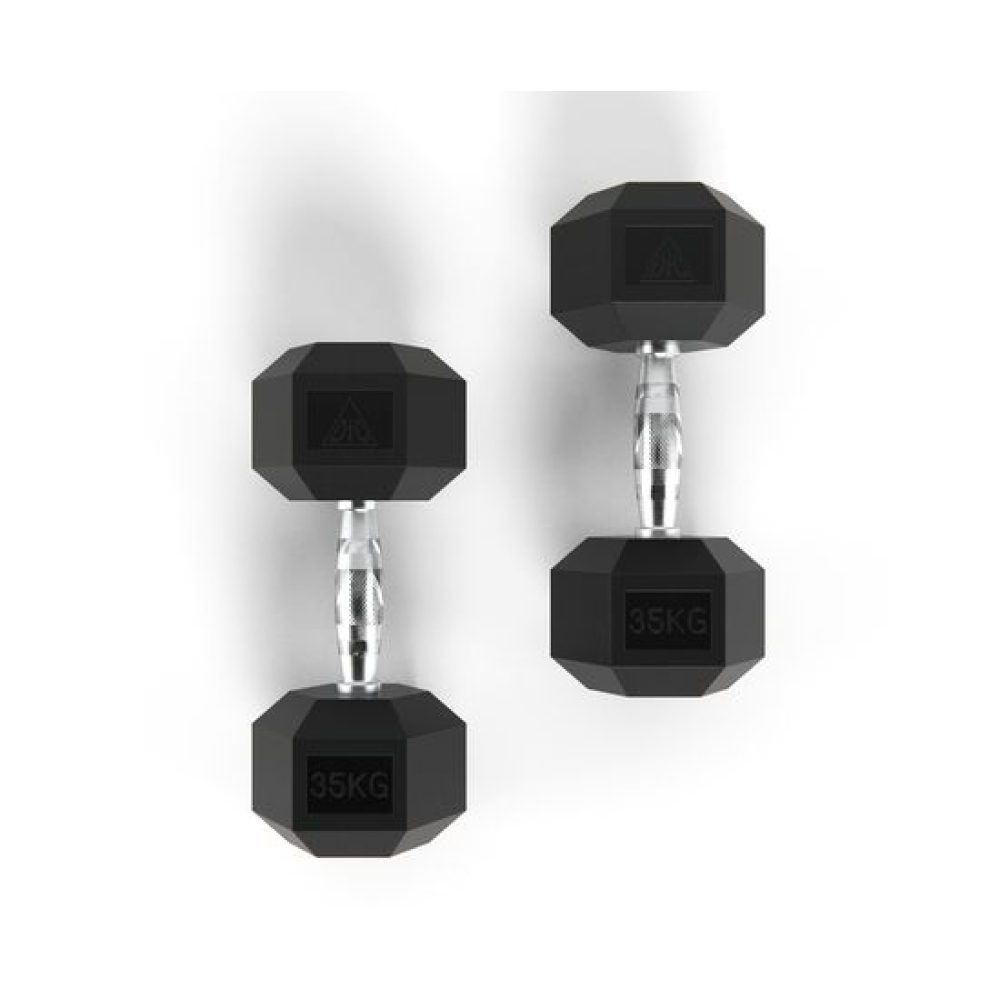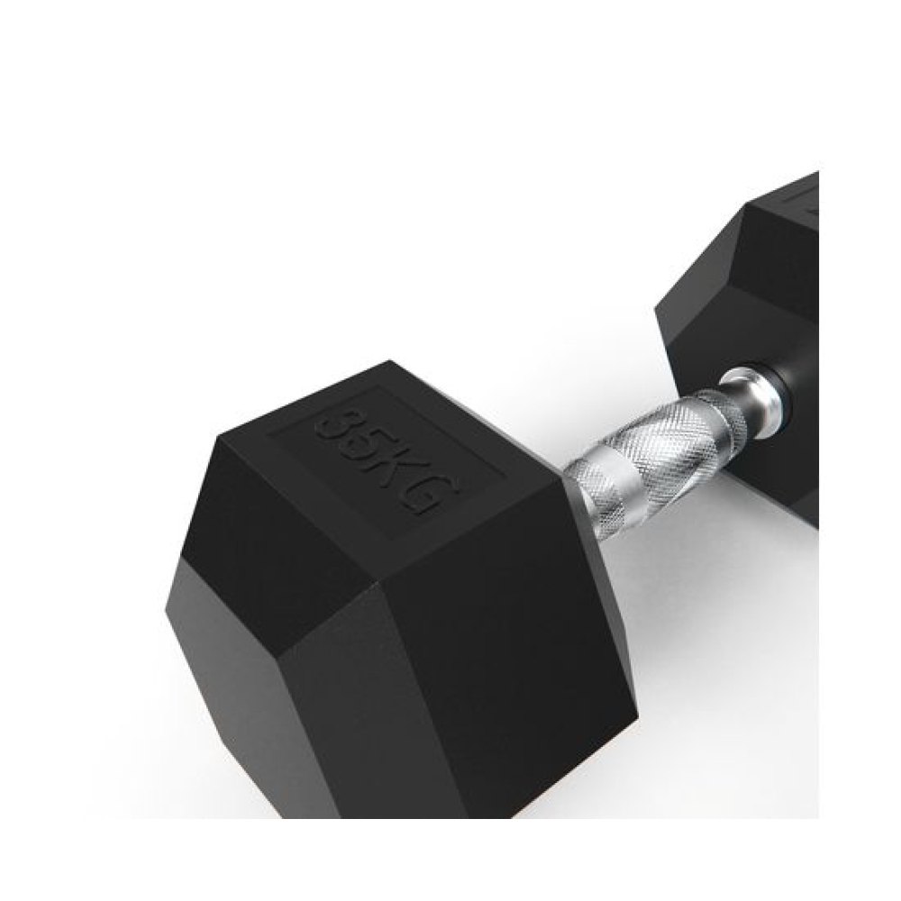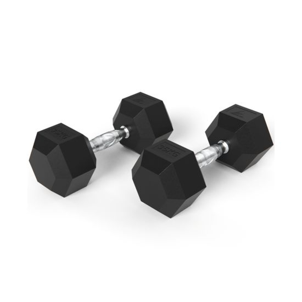 Гантель обрезиненная с хромированной ручкой. Вес гантели 35 кг, в комплекте 2 штуки (пара).Ручка с насечками для предотвращения скольжения.Гексагональная гантель – обрезиненная модель удобной конструкции.Гантель имеет много граней и не катается по полу. Обрезиненная поверхность не царапает пол при ударе.Гантели используются в фитнесе, лечебной физкультуре, бодибилдинге и других спортивных тренировках.