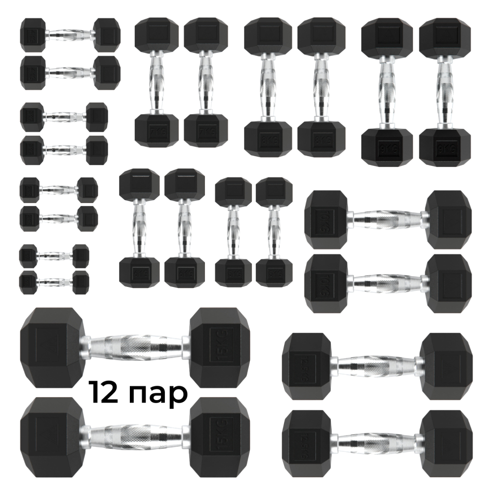 Гантели обрезиненные с хромированной ручкой. Вес гантели от 1 кг до 15 кг с шагом, в комплекте по 2 штуки (пара). Набор включает следующие гантели: 2 x 1 кг, 2 x 2 кг, 2 x 3 кг, 2 x 4 кг, 2 x 5 кг, 2 x 6 кг, 2 x 7 кг, 2 x 8 кг, 2 x 9 кг, 2 x 10 кг, 2 x 12,5 кг, 2 x 15 кг Ручка с насечками для предотвращения скольжения. Гексагональная гантель – обрезиненная модель удобной конструкции. Гантель имеет много граней и не катается по полу. Обрезиненная поверхность не царапает пол при ударе. Гантели используются в фитнесе, лечебной физкультуре, бодибилдинге и других спортивных тренировках.
