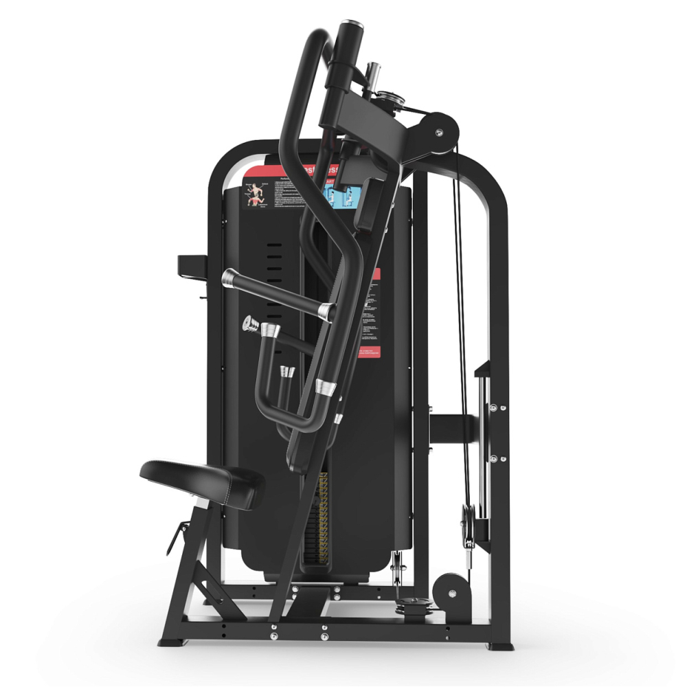 Тренажер жим от груди UNIX Fit 100 PRO Мультихват (Vertical chest press 2) - это идеальное решение для тех, кто стремится к совершенству своего тела! Мощный тренажер обеспечивает максимальную изоляцию мышц груди, позволяя вам развивать и укреплять эту группу мышц с невероятной эффективностью. С его помощью вы сможете работать над каждым участком груди, создавая красивую форму и выразительный рельеф. Хаммер-тренажер обладает уникальной конструкцией, которая обеспечивает плавное и комфортное движение во время тренировок, минимизируя риск травм. Тренажер для жима позволит приобрести правильную технику выполнения жима от груди, ведь благодаря наклонной спинке и конструкции, тренажер сводит к минимуму риск травм вне зависимости от выбранного веса и будет крайне полезен начинающим спортсменам. Нескользящие эргономичные рычаги и мягкая, плотно набитые спинка и сиденье обеспечат безопасность и комфорт во время выполнения упражнений. Регулируемый вес грузоблочного тренажера позволяют использовать его как мужчинам, так и женщинам и адаптировать его под уровень подготовки и индивидуальные цели, обеспечивая максимальную эффективность тренировок. Тренируйтесь с удовольствием и с UNIX Fit!. . Характеристики:. - Вес стека: 100 кг. - Защита стека: внешняя, стальной защитный кожух толщиной 2 мм. - Количество плит грузового стека: 20 шт - Вес одной плиты грузового стека: 5 кг. - Материал плит: легированная сталь. - Обозначение веса на плитах: кг и lbs. - Фиксатор плит: магнитный, на эластичном тросе. - Направляющие весового стека выполнены из нержавеющей стали и отполированы для обеспечения плавности хода и защиты от коррозии. - Форма профиля рамы: прямоугольник. - Размер профиля рамы: 100 х 50 мм. - Толщина профиля рамы: 3 мм. - Покрытие профиля: двойная порошковая окраска. - Толщина троса: 6 мм. - Полимерное покрытие троса для защиты от истирания. - Инструкция по выполнению упражнений: размещена на защитном кожухе весового стека, с крупными схематическими изображениями исходного и конечного положения. - Материал обивки подушек сиденья, спинки и подголовника: качественная эко-кожа с двойной прострочкой и плетеной структурой. - Сиденье анатомической формы, спинка и подголовник. - Количество положений регулировки высоты сиденья: 6. - Высота сиденья от пола в нижнем положении: 43 см.-Высота сиденья от пола в верхнем положении: 59 см. - Шаг регулировки положения высоты сиденья: 3 см. - Держатель для телефона. - Держатель для бутылки. - Независимость работы рычагов для жима. - Количество вариантов хвата при работе на тренажере: 2. - Толщина сиденья: 9 см. - Размер подушки спинки: 65 х от 37-26 х 9 см. - Размер подушки подголовника: 25-23 х 16 х 9 см. - Защита ножек: резиновые подпятники. - Максимальный вес пользователя: 200 кг .
