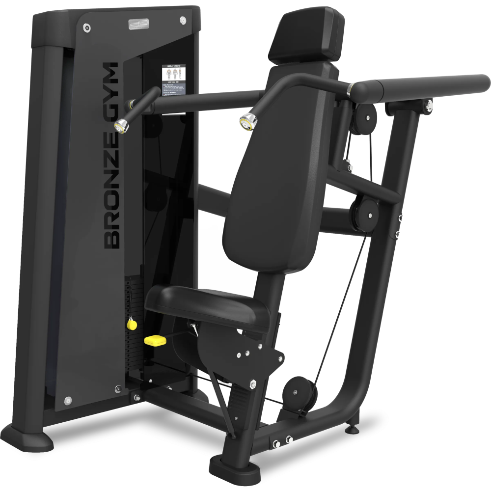 BRONZE GYM NEO 06- профессиональный тренажер коммерческого класса предназначен для выполнения упражнения жим от плеч. C помощью данной модели пользователь сможет проработать плечевые и дельтовидные мышцы. Профиль рамы тренажера, размером 100*50, выполнен из высокопрочной стали толщиной 3 мм. Благодаря двухслойному порошковому покрытию, обеспечивается защита корпуса от внешних повреждений на 98%. Прорезиненные, нескользящие рукоятки модели обеспечивают надежное сцепление рук пользователя во время занятий, что избавляет от риска получения травм. Стальной трос в ПВХ оболочке, общим диаметром 6 мм, отвечает за подъем стека, общий вес которого составляет 100 кг. Сами плиты стека изготовлены из прочной легированной стали. Для простоты использования, все фиксаторы на тренажере выполнены в ярких цветах*. Установленное на модели эргономичное сиденье из высокопрочной экокожи гарантирует повышенный комфорт на протяжении всей тренировки. Подушки с полиуретановым наполнителем максимально смягчают давление на ноги. Фиксатор для ног регулируется по вертикали. В качестве дополнения BRONZE GYM NEO 06 оснащен держателем для бутылки с водой.