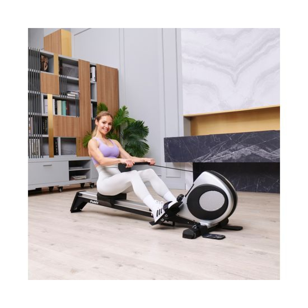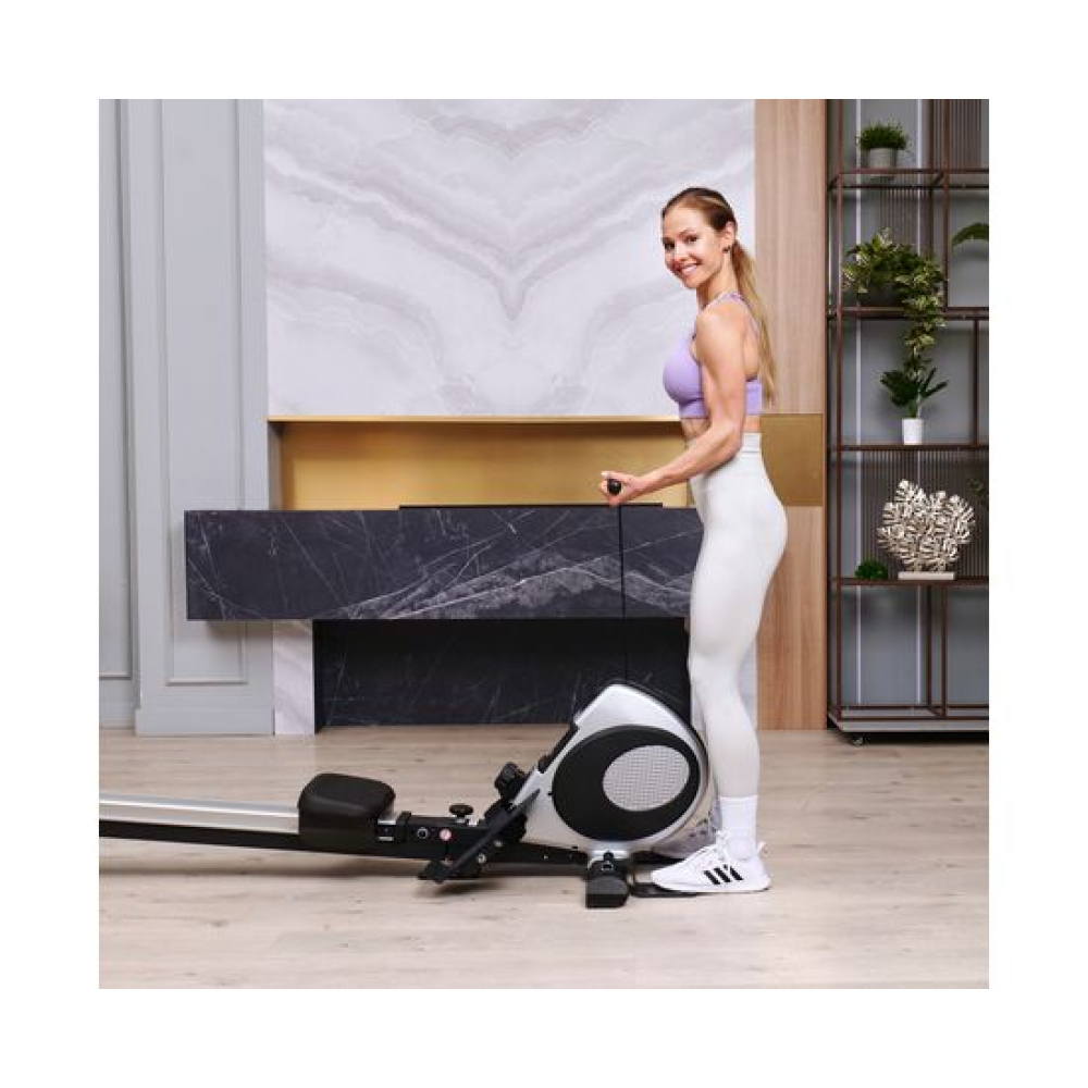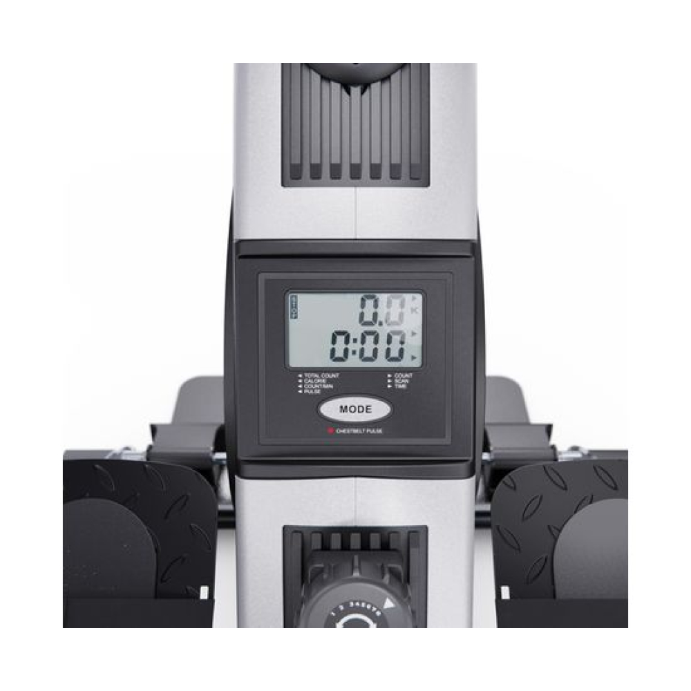 Гребной тренажёр DFC PoMt серого цвета — отличный выбор для домашних тренировок! Максимальный вес пользователя составляет 120 килограммов, что делает тренажер подходящим для людей с разной физической подготовкой. Гребной тренажёр для дома идеально подходит для укрепления мышц верхней части тела и развития выносливости.Кардиотренажер для ног и рук оснащён маховиком весом 4 килограмма и имеет магнитную систему нагрузки, что обеспечивает плавный и тихий ход. 8 уровней нагрузки. Монохромный LCD-дисплей отображает основные параметры тренировки, такие как время, количество гребков, общее количество гребков и калории, а также имеет режим сканирования. Размер консоли 10,5 х 11 х 3 см.В рабочем состоянии гребной тренажер кардио имеет размеры 190 x 58 x 50 см, а также имеет компактные размеры в сложенном виде (123 x 58 x 124 см) и транспортировочные ролики, что позволяет удобно его хранить и легко перемещать его по дому.Домашний кардиотренажёр DFC PoMt для ног и рук — отличный выбор для интенсивных тренировок, активного образа жизни и похудения!