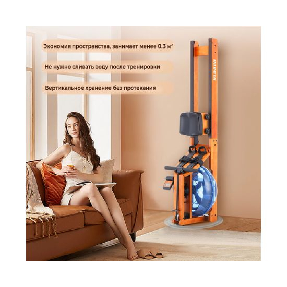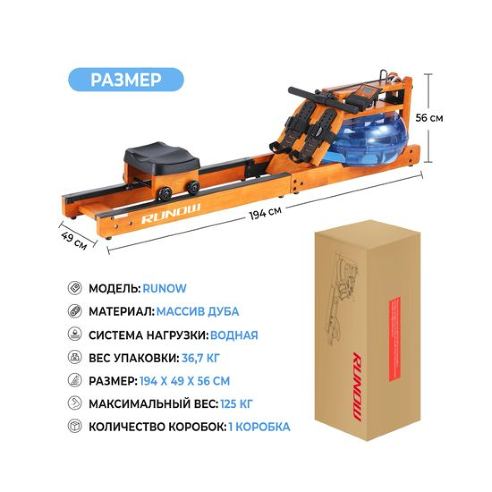 Гребной тренажер DFC Runow 6203 выполнен в цвете Оранжевый дуб и предназначен для пользователей весом до 125 килограмм. Тренажер компактен и может быть установлен вертикально у стены.Монохромный LCD-дисплей отображает следующую информацию: время, количество гребков, общее количество гребков, расстояние, калории и режим сканирования. Для функционирования консоли необходимы две батарейки типа “AAA”, которые не включены в комплект поставки.Особенностью данного тренажера является использование водного сопротивления. Уровень воды в баке имитирует вес лодки, изменяя тем самым сложность тренировки. Объем водяного бака составляет 20 литров при диаметре 56 сантиметров. Всего в тренажере 16 пластиковых лопастей для гребков.Основная рама изготовлена из массива дуба, что обеспечивает прочность и долговечность тренажера. Для удобства перемещения предусмотрены транспортировочные ролики.Тренажер воздействует на все группы мышц тела. Размеры в собранном виде составляют 56x49x194 сантиметров. Система нагрузки - водная, а регулировка нагрузки также осуществляется изменением уровня воды в баке. Длина слайда составляет 104.5 сантиметра.