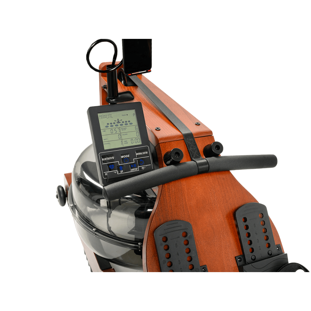 Гребной тренажер Wood Rower от бренда UNIX Fit - это надежный тренажер для домашнего использования с уникальным дизайном в скандинавском стиле. Корпус тренажера изготовлен из массива бука. Модель Wood Rower - отличный выбор для людей с хорошим вкусом и ценителей высококачественного экологичного материала. Гребля помогает тренировать все группы мышц верхней и нижней частей тела, а также поддерживать в тонусе сердечно-сосудистую и дыхательную систему. Потребление калорий в 2 раза больше по сравнению с другими видами кардиотренировок. Гребной тренажер Wood Rower наиболее точно имитирует реальную греблю на воде. Водная инерционная система нагружения обеспечивает плавное движение и сопротивление без рывков. Общий объем бака составляет 25 литров, для занятий потребуется залить от 10 до 12 литров. Рекомендуется дистилированная вода. Бак состоит из двух секций - основной активной и внутренней пассивной. Нагрузка регулируется с помощью ручки на баке. При выборе максимального уровня нагрузки вся жидкость будет находится в основном баке. В случае перевода ручки в положение с меньшей нагрузкой часть воды перейдет в пассивный отсек прямо во время тренировки. . Консоль с регулировкой угла наклона и информативным LCD-дисплеем размером 4” отображает необходимые параметры тренировки: время, скорость, расстояние, калории, количество гребков, количество ватт, время /500 м. Дисплей работает от 4 батареек АА (в комплекте). Эффективность тренировки достигается в том числе пакетом встроенных программ: ручной режим, 3 интервальные тренировки и 4 целевые тренировки (на время, расстояние, калории, количество гребков). Встроенный Bluetooth-приемник и держатель для мобильного устройства дают возможность использовать его с одним из популярных приложений: FitShow, Kinomap, ZWIFT, SPAX, FITLOG (подключение через Bluetooth). Для удобства и комфорта во время продолжительной тренировки инженеры компании UNIX FIT разработали комфортное анатомическое сиденье для бесшумного движения по направляющим. Педали для крепления ног рассчитаны на пользователей с разным размером ноги, имеют 6 положений регулировки и удобные ремешки для фиксации. Гребной тренажер Wood Rower отлично впишется в домашнюю обстановку. После занятий его удобно хранить в собранном или вертикальном виде, а колеса облегчают перемещение и расположение его в квартире. Видео сборки тренажера: https://cloud.mail.ru/public/qfcV/RsUJAT3Uv *Защитный коврик поставляется отдельно. Для данной модели рекомендуется коврик UNIX Fit 190x75 см. *В комплекте с водным гребным тренажером поставляются 2 хлорные таблетки.