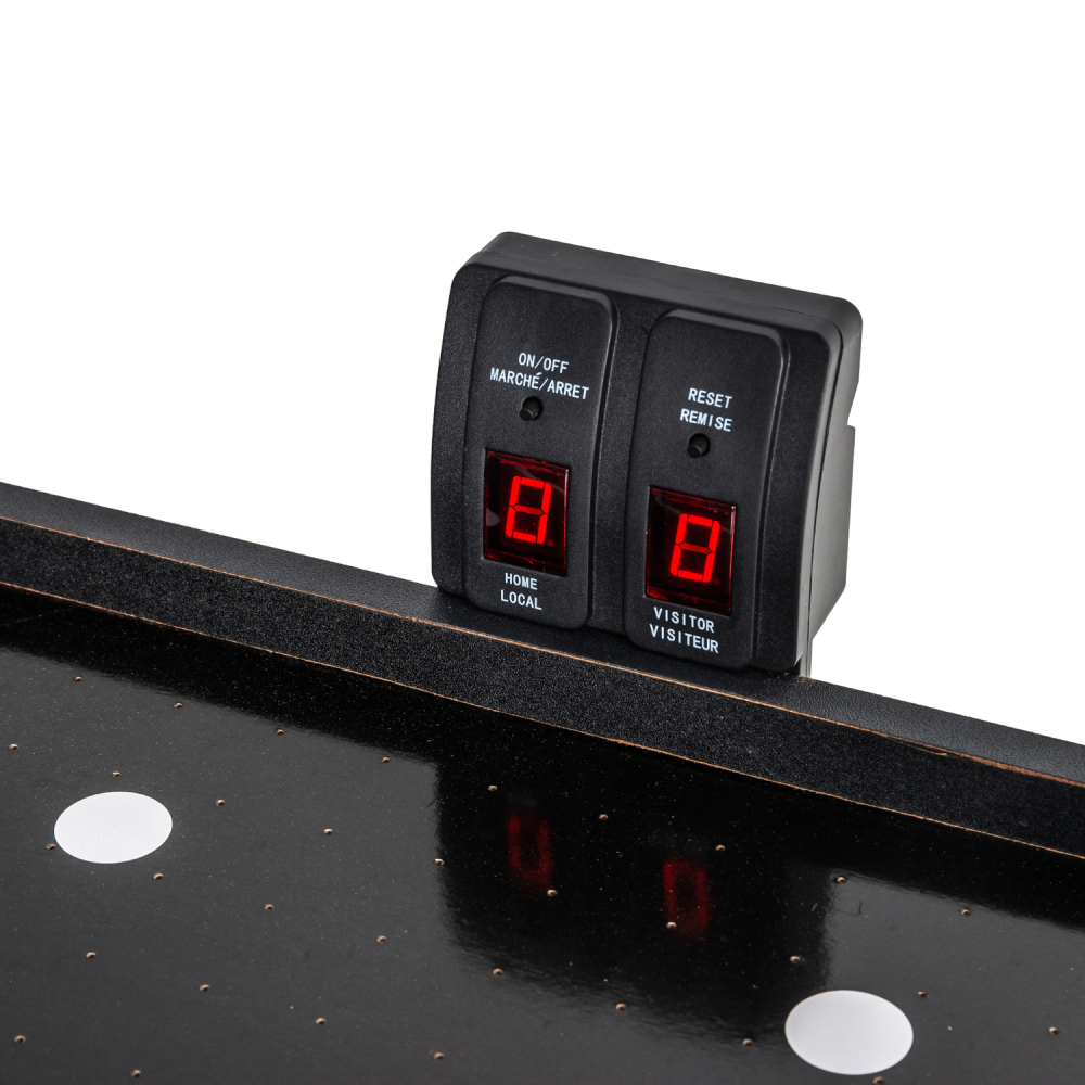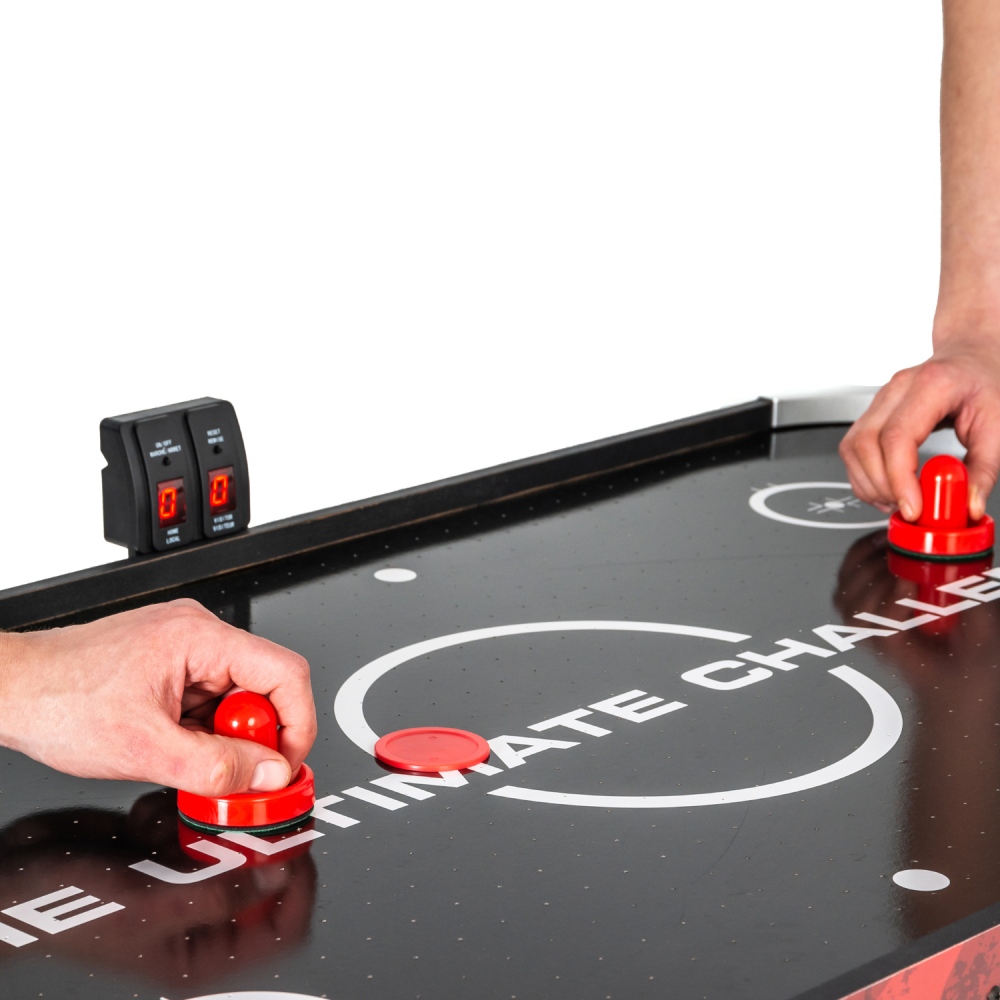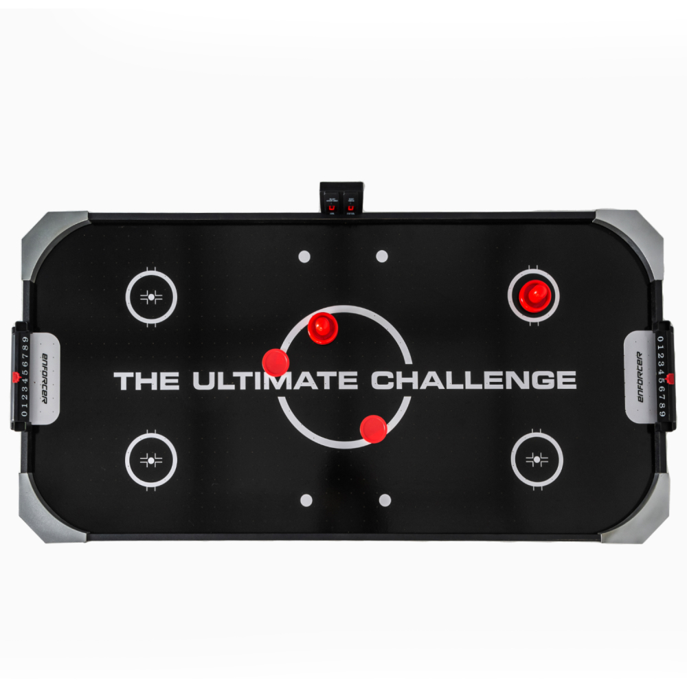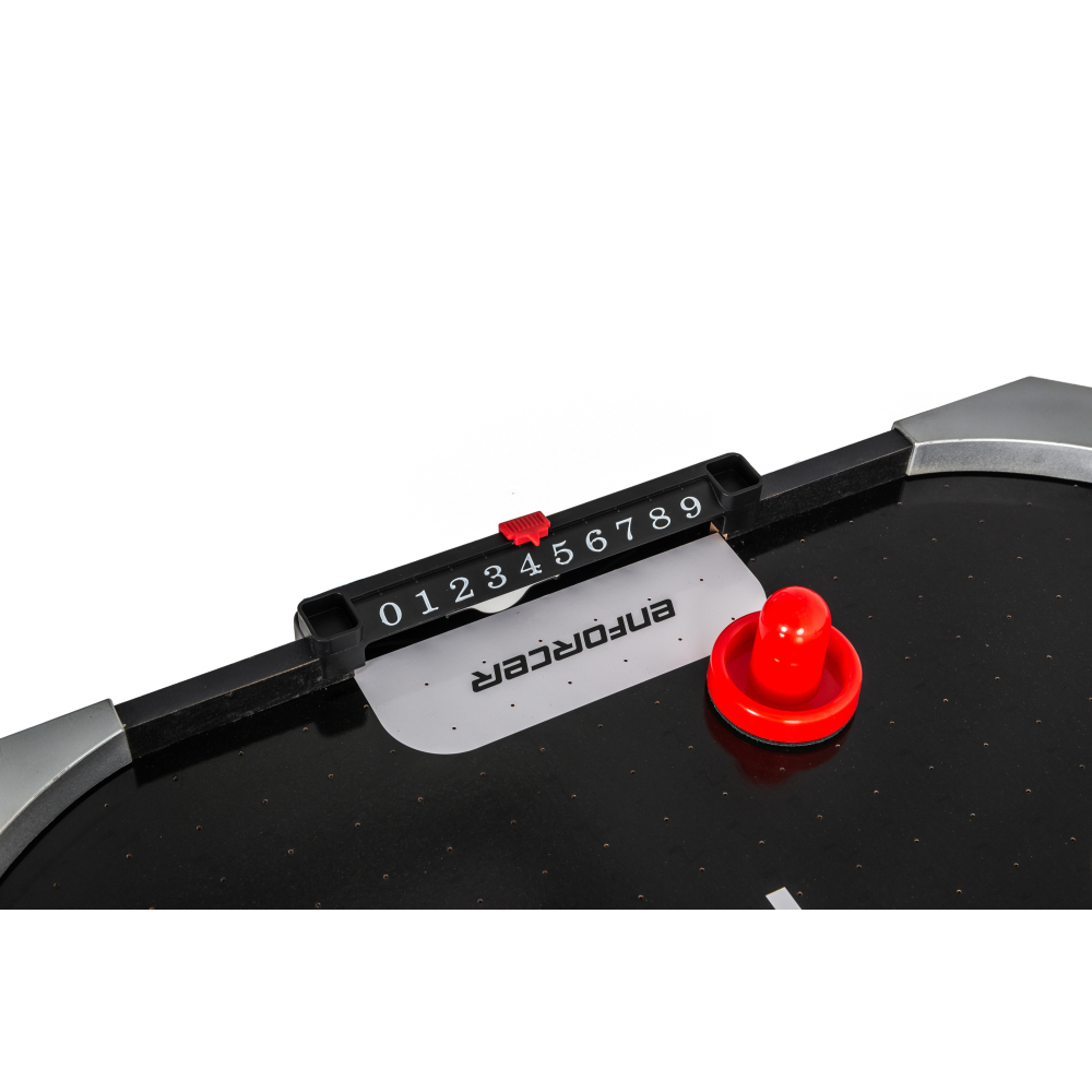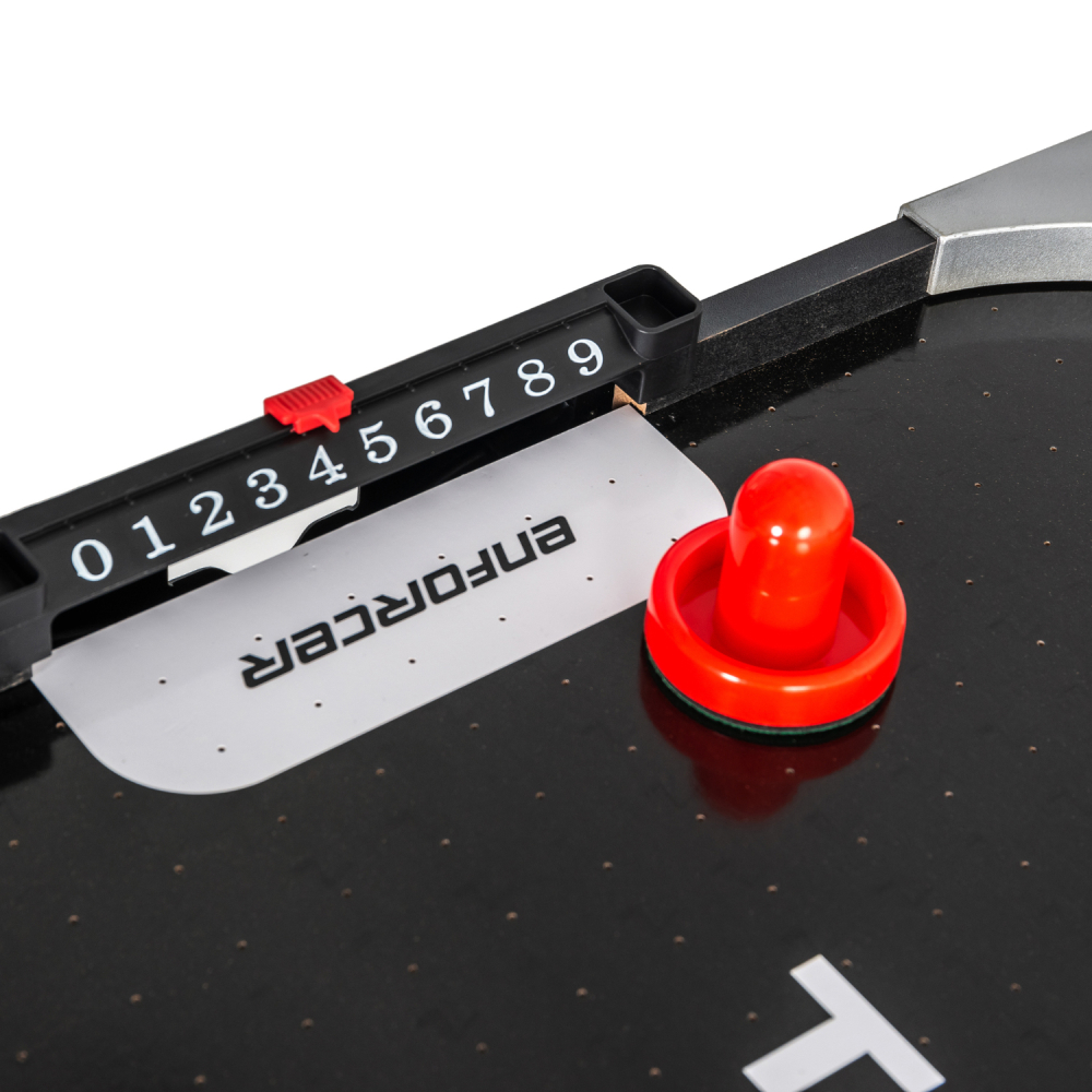 Игровой стол будет не только отличной покупкой для себя, но и прекрасным подарком. Игра в настольный хоккей очень эмоциональная, захватывающая и проходит на больших скоростях. Почувствуйте звуки и атмосферу знаменитой и популярной игры! Настольный хоккей является отличным развлечением дома или на даче. Игровой стол - аэрохоккей DFC ENFORCER оборудован электронным табло для подсчета забитых шайб во время игры. Корпус выполнен из специально обработанного МДФ, сверху покрытого прочным ламинатом. Вентилятор подает воздух через отверстия по всей поверхности стола. Напряжение: 220В (через адаптер). Стол комплектуется набором аксессуаров: 4 биты и 4 шайбы красного цвета.