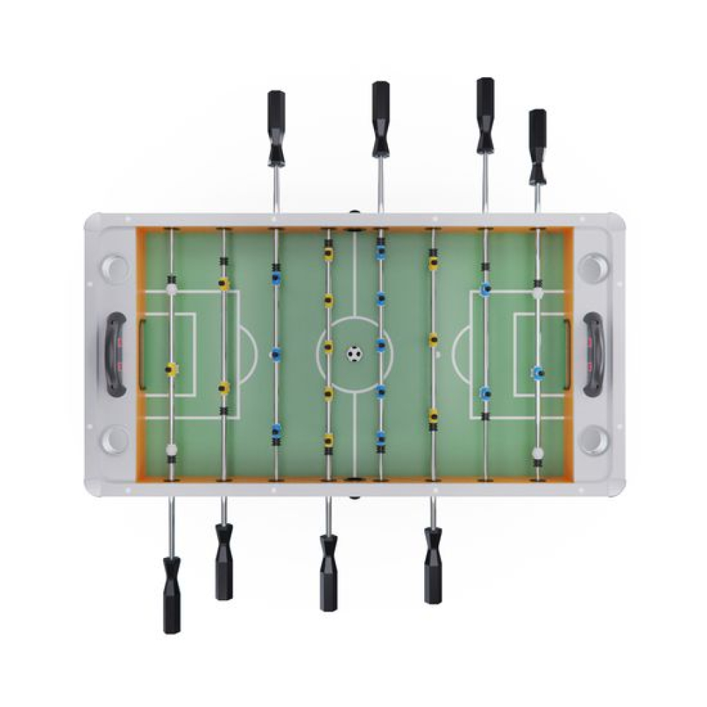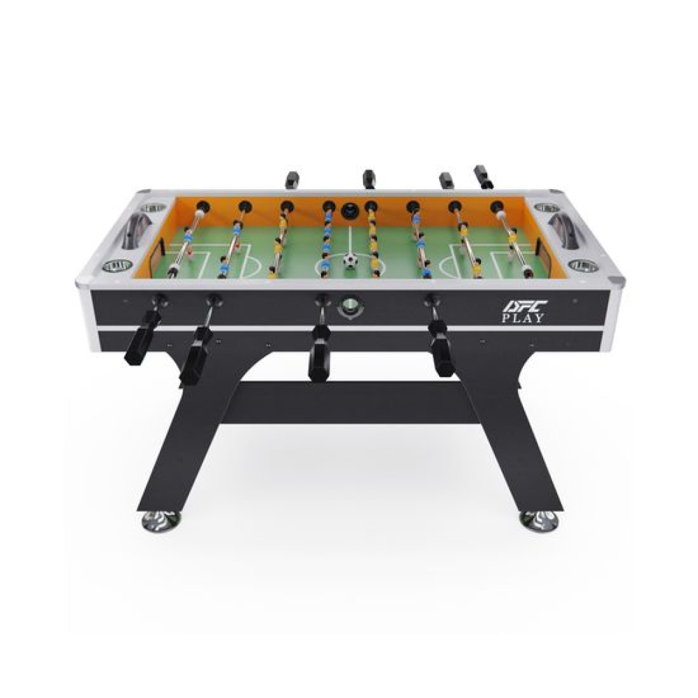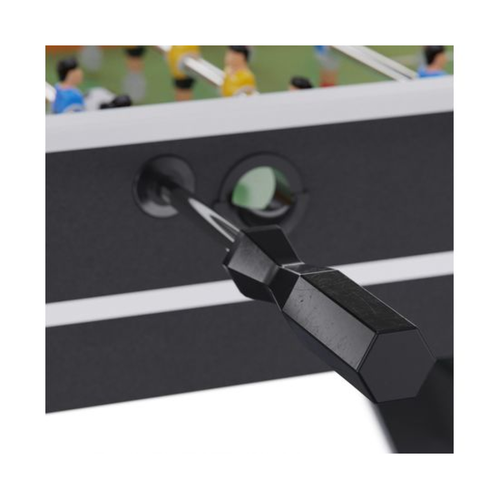 Откройте для себя мир захватывающих спортивных состязаний с игровым столом DFC COMMANDER! Этот настольный футбол подарит вам и вашим друзьям массу удовольствия и адреналина.Телескопические стержни с игроками выполнены полыми, благодаря чему не мешают игрокам при игре. Диаметр составляет 15 миллиметров, отделка — хром, ручки — из чёрного дерева.В комплекте с DFC COMMANDER идут два футбольных мяча и два электронных счётчика, работающих от трёх батареек типа ААА (батарейки не входят в комплект). Для вашего комфорта предусмотрены четыре удобных подстаканника.Ножки стола оснащены компенсаторами неровности пола, их диаметр составляет 12 сантиметров. Верхняя панель со стороны игроков покрыта МДФ, ламинированным серебристым ПВХ, её размеры — 10,8 на 1,6 сантиметра. Сама панель имеет высоту 19 сантиметров и толщину 1,3 сантиметра, изготовлена из МДФ с ПВХ-ламинированием. Боковые панели также изготовлены из МДФ, ламинированного чёрным ПВХ, их высота составляет 19 сантиметров, а толщина — 2,8 сантиметра (составная панель — 13 и 15 миллиметров). Игровое поле выполнено из МДФ толщиной 9 миллиметров и покрыто зелёным ПВХ.Перекладина между ножками имеет ширину 15 сантиметров и толщину 1,5 сантиметра, изготовлена из МДФ с ПВХ-покрытием. Ножки стола имеют ширину 25 сантиметров и толщину 1,5 сантиметра.