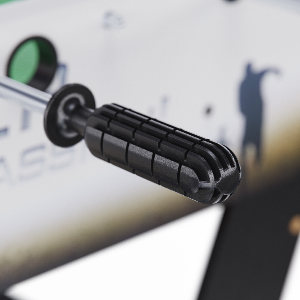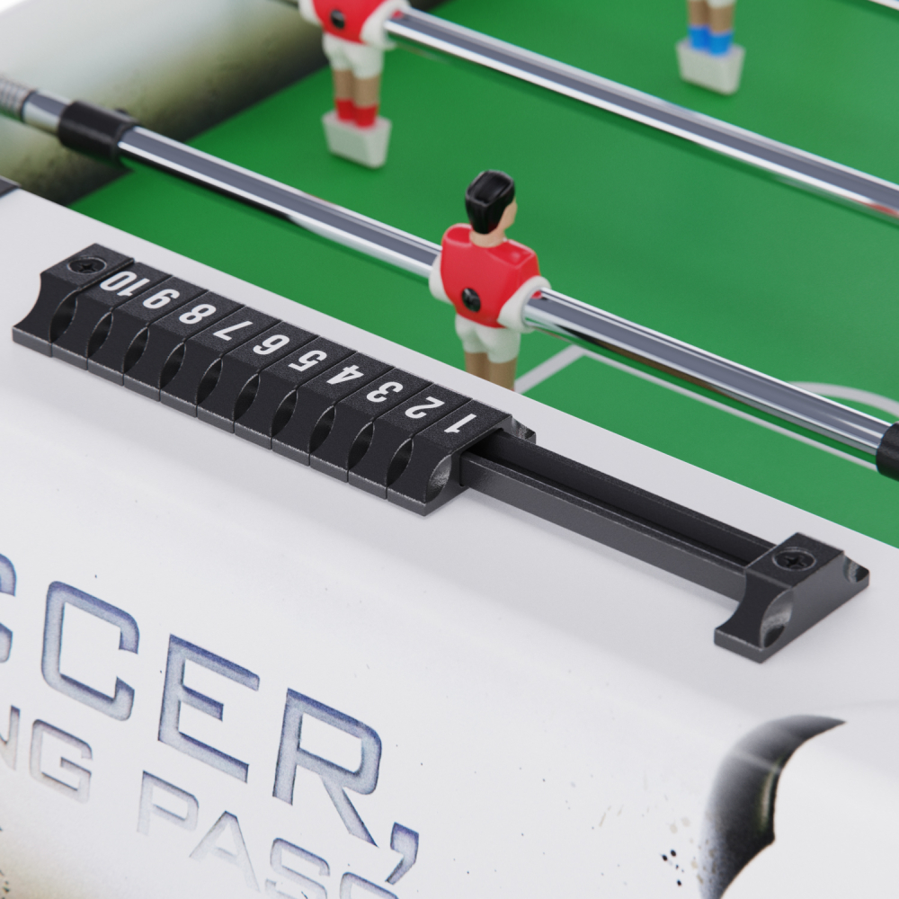 Игровой стол-футбол DFC SOCCER BP SB-ST-29398 для домашнего использования. Складная модель. Боковые стороны из МДФ ламинированным ПВХ высотой 19,5 см и толщиной 12 мм. Стороны со стороны игроков высотой 19,5 см и толщиной 9 мм. L-образная ножка из МДФ толщиной 15 мм, средняя – 12 мм. Телескопические стержни диаметром 13 мм с хромированным покрытием. В комплекте 2 футбольных мяча 31 мм диаметром.