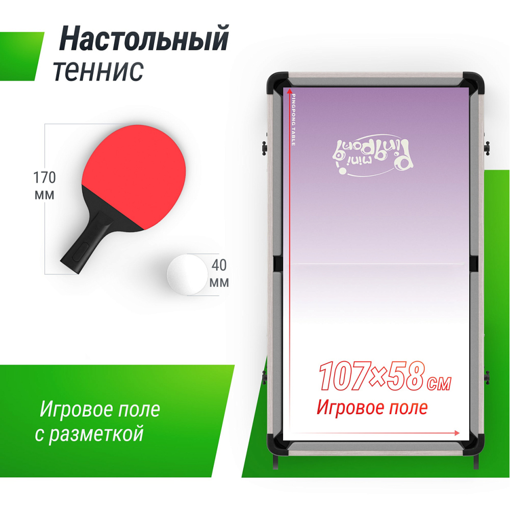 | Аксессуары в комплекте | 2 кия, шары, треугольник, мел, 22 игрока, 2 мяча Ø 35мм, 2 страйкера, 2 шайбы, 2 клюшки, 2 шайбы, 2 ракетки, 2 мячика, сетка |