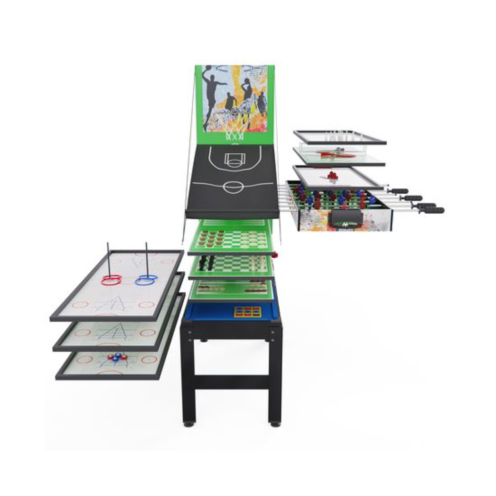 Игровой стол-трансформер 14 в 1 DFC 48".Универсальное развлечение для всей семьи.Многофункциональный игровой центр представляет собой уникальное решение для организации активного досуга в домашних условиях. Компактный стол-трансформер объединил в себе 15 различных игровых поверхностей, способных увлечь как детей, так и взрослых.Основные характеристики Размер стола: 122 x 61 см Количество игр: 15 различных игровых поверхностей Материал: Высококачественный износостойкий пластик Конструкция: Трансформируемая игровая поверхностьРазнообразие развлеченийВ одном устройстве собраны самые популярные настольные игры и спортивные симуляторы:Классические настольные игры: Шахматы Шашки Крестики-ноликиСпортивные симуляторы: Настольный теннис Мини-баскетбол Футбол Хоккей Бильярд БоулингУникальные игровые механики: Игра «Подкова» Магнитные шайбы «Кольцо»Преимущества моделиКомпактность: Не занимает много места при храненииУниверсальность: Подходит для игроков любого возрастаРазвивающий эффект: Способствует развитию логики, координации и стратегического мышленияДолговечность: Прочная конструкция рассчитана на длительное использованиеСемейный досуг: Идеальное решение для совместного времяпрепровожденияПодарите себе и своим близким незабываемые моменты радости и веселья с игровым столом-трансформером 15 в 1!Размер игрового поляФутбол: 104x58 смХоккей: 93x47 смПинг-понг: 96x50 смБильярд: 96x50 ммФутбол: Диам. 32 ммБильярд: Диам. 32 ммБаскетбол: Диам. 13 смРазмер коробки 112х66х14,5 смВес нетто: 21,50 кгВес брутто: 24,60 кг