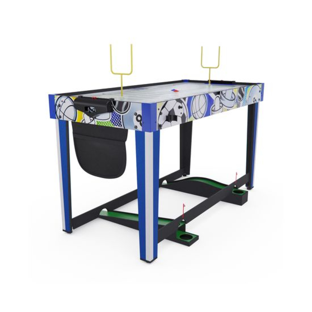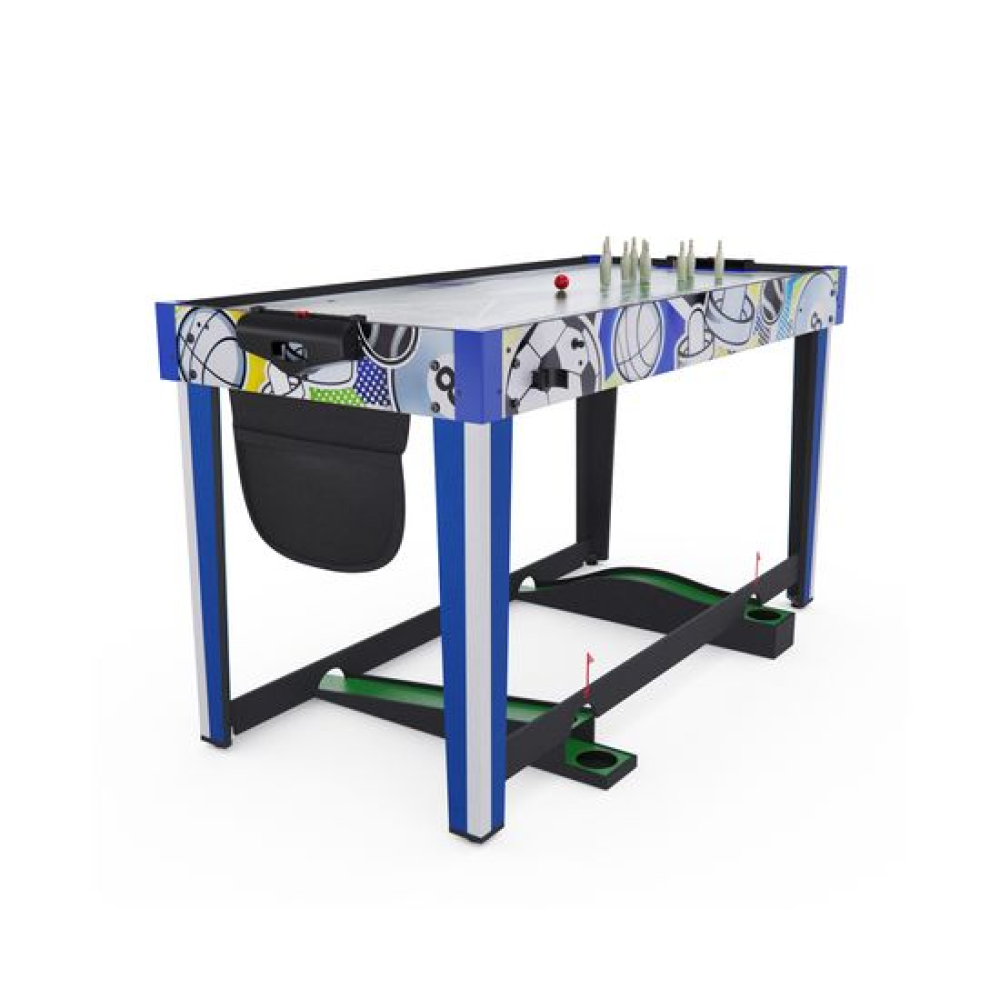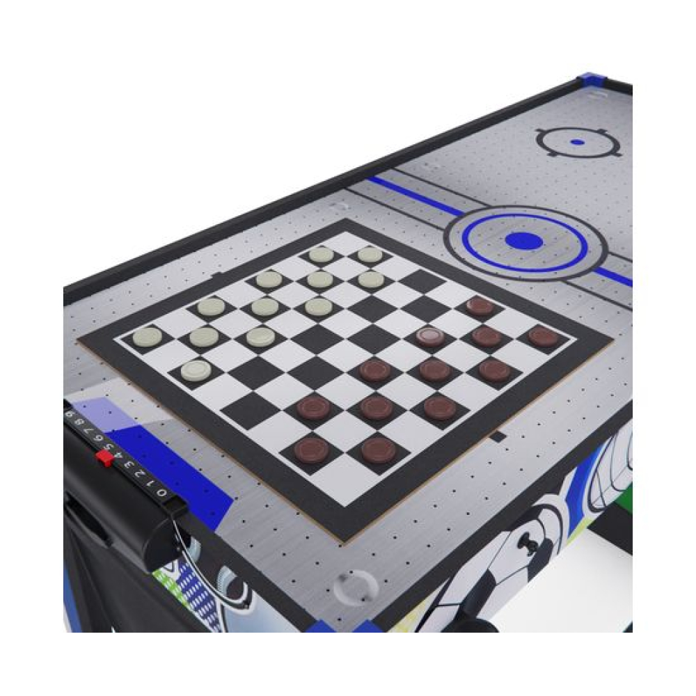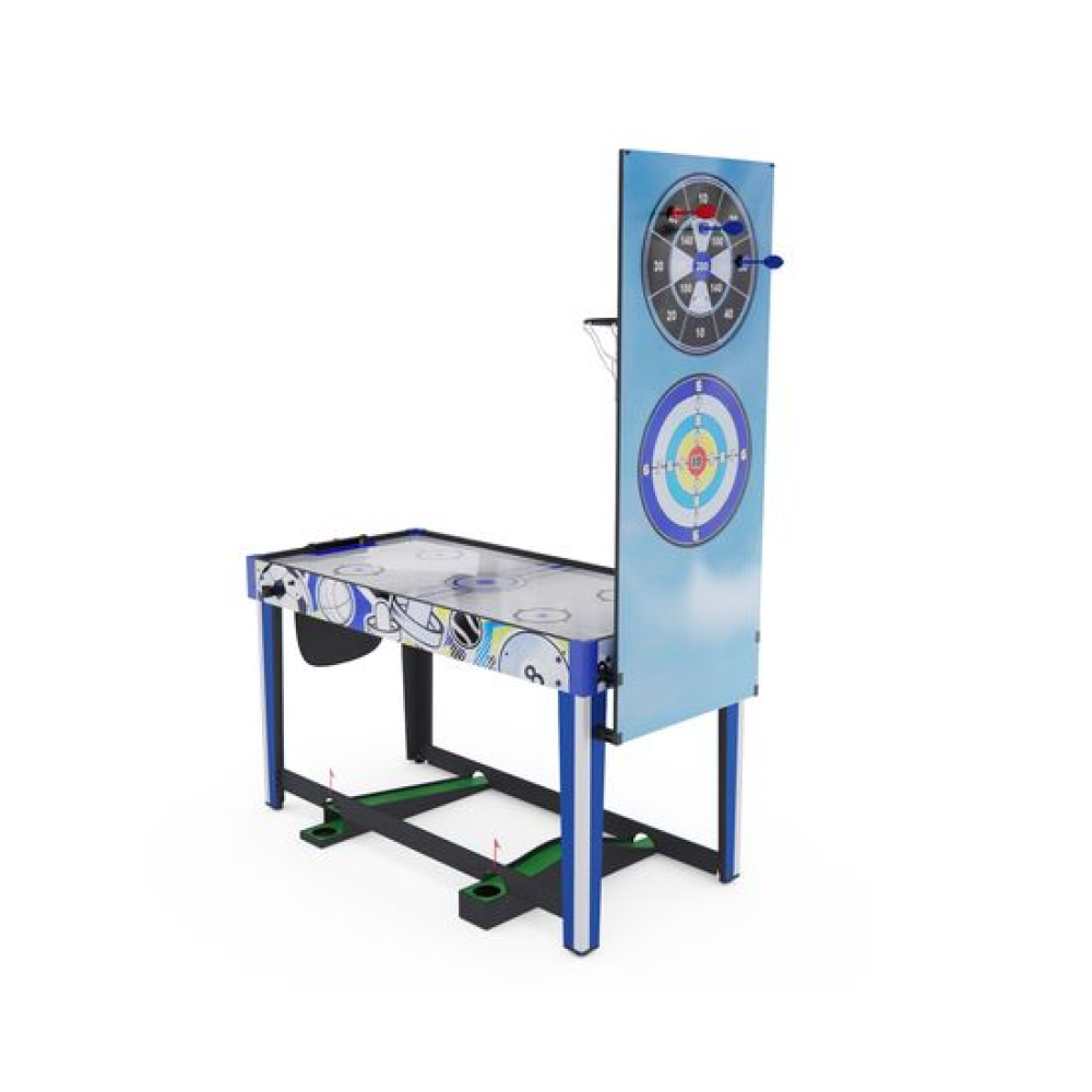 Игровой стол-трансформер DFC BERYL 13-in-1, размером 48" (дюймов), представляет собой домашний развлекательный центр, который превращается в 13 различных игр. Вентилятор, работающий от сети 220В, обеспечивает плавное скольжение шайбы аэрохоккея по игровому полю.Игровой стол предлагает следующие развлечения: Аэрохоккей (2 биты и 2 шайбы, механический счетчик) Стрельба по мишеням (5 мишеней, 1 бластер и 5 дротиков) Plink shot (4 мячика) Гольф (1 клюшка, 2 флажка, 2 мяча) Шахматы Шашки Нарды (шашки и 5 игральных костей) Баскетбол (кольцо с сеткой, мяч с насосом, сетка для возврата мяча) Bean bag (метание мешков) (3 мешка для игры и 1 сетчатый мешок) Стрельба из лука (лук и колчан, 3 стрелы) Дартс (6 дротиков с присосками) Боулинг (1 шар, набор кеглей) Настольный пальчиковый футбол (2 треугольника, 2 пары ворот)
