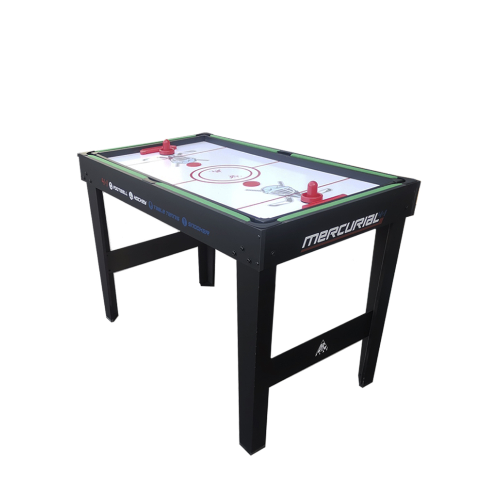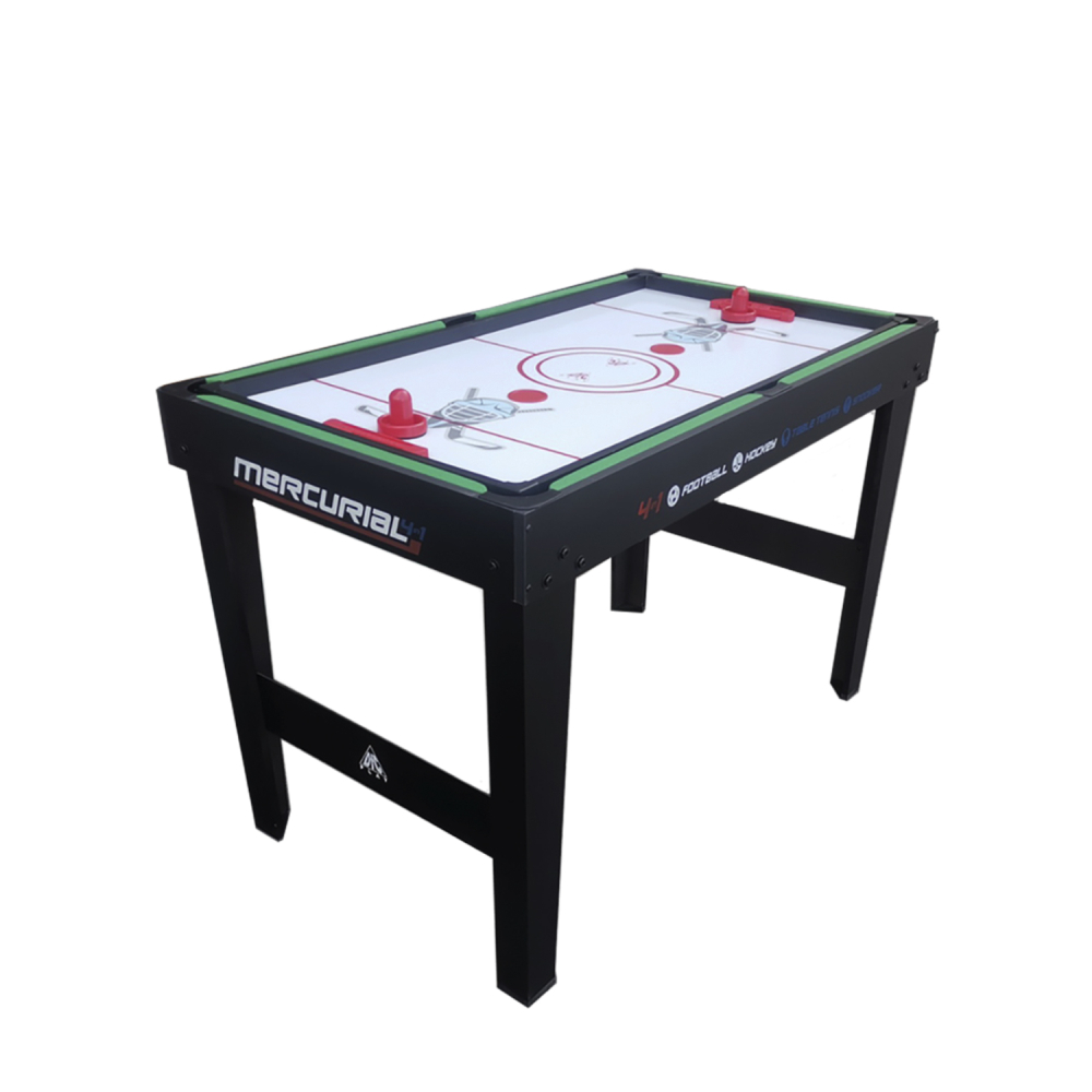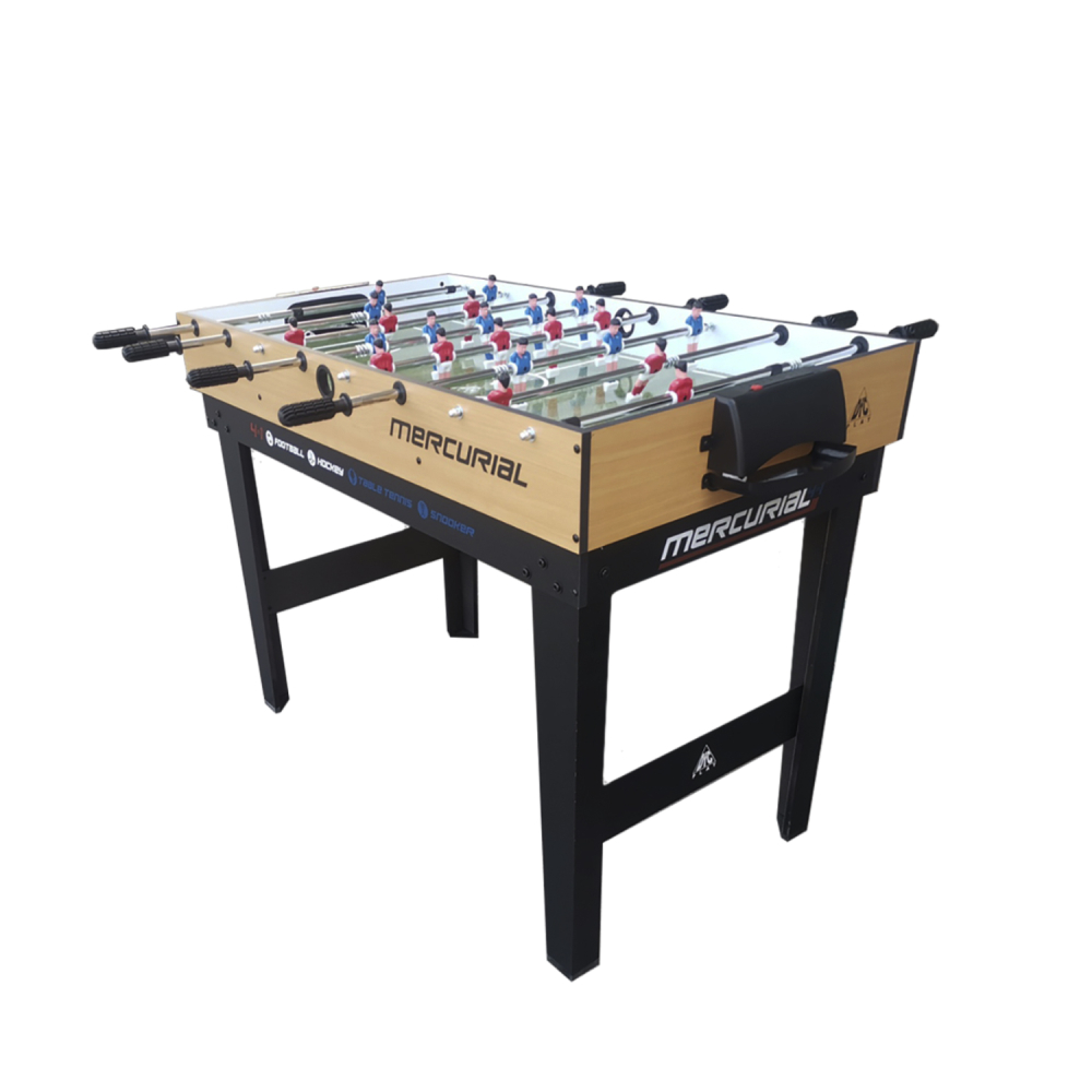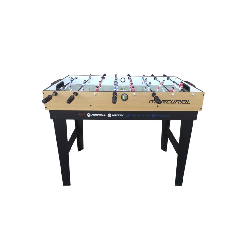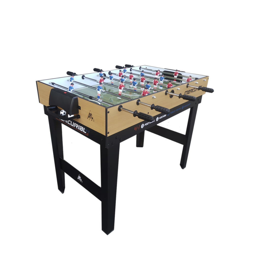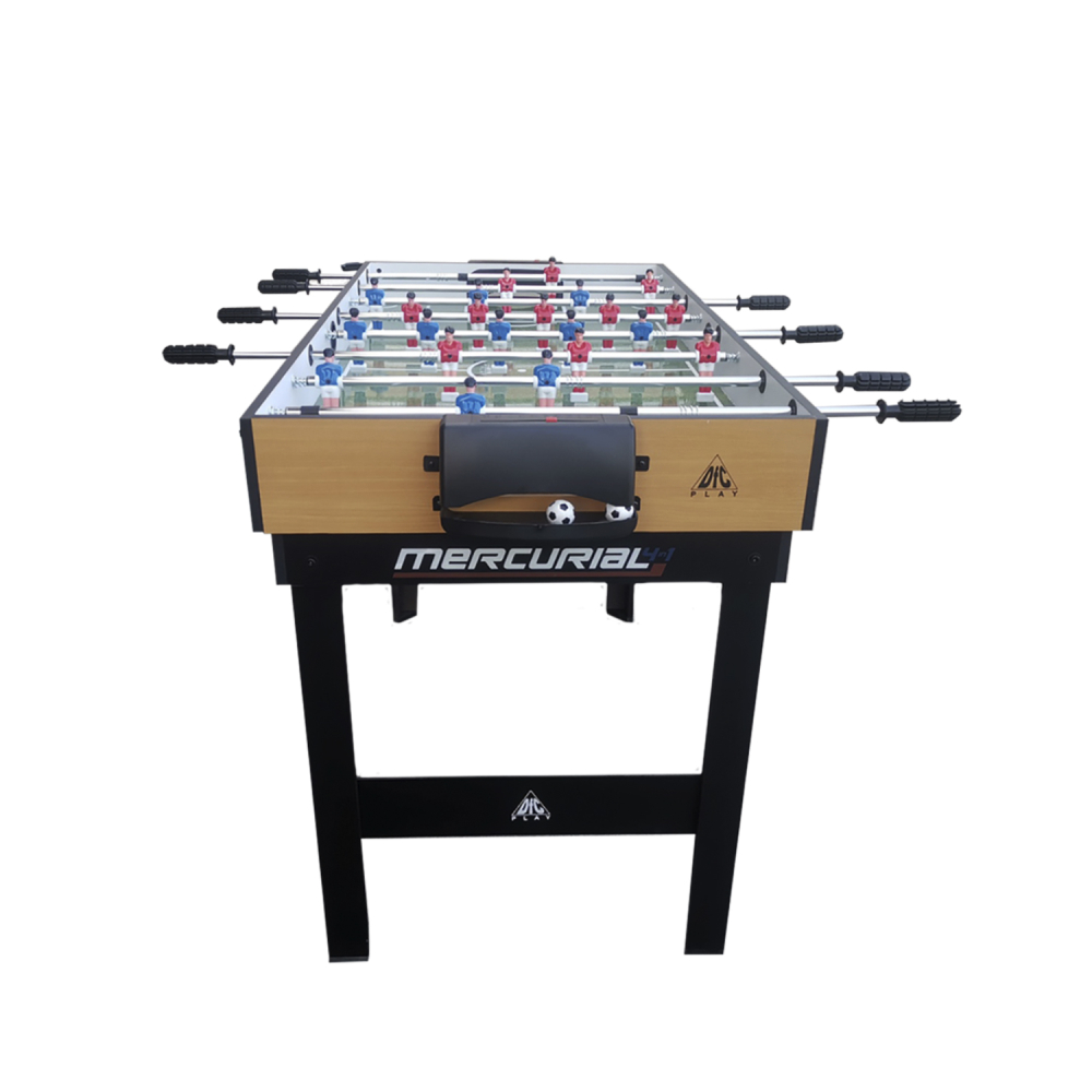 Многофункциональный игровой стол MERCURIAL 4ft — то, что нужно для большой компании! Играйте в футбол, бильярд, настольный теннис и аэрохоккей на одном столе, легко меняя игровые поля. Яркое оформление и стильный дизайн сделают игру ещё более увлекательной. Особенности стола Игровое поле Игровые поля легко менять, они изготовлены из МДФ, ламинированного ПВХ с ярким принтом игровой разметки. Сам стол компактный, не занимает много места, а игрового пространства достаточно, чтобы получить настоящее удовольствие во время игры в домашней обстановке с друзьями или семьёй. Толщина бортиков стола 30 мм, а высота - 12 мм. Размеры и оформление игрового поля Футбольное поле: 104 х 58 см, толщина 3 мм, с зелёной поверхностью и разметкой, установлены телескопические хромированные стержни 13 см в диаметре с футбольными игроками. Хоккейное поле: размер 93 х 47,5 см, толщина 4,75 см, покрытие бело-красное, с разметкой. Теннисный стол: классическое синее поле с разметкой для сетки 96 х 50 см, толщина 4,75 мм. Бильярдное поле: стол с мягким зелёным покрытием размером 97 х 51 см, толщиной 4,75 мм; ширина лузы 6,7 см. Ножки стола Конструкция стола устойчива, что актуально для азартных и эмоциональных игроков, особенно при игре в футбол. Прочность и устойчивость ему придают ножки шириной 80 мм и толщиной 13 мм из МДФ с ПВХ покрытием и перекладины толщиной 9 мм. Комплектация Стол для домашних игр 4 в 1 поставляется со всеми комплектующими: 2 мяча для футбола; 2 шайбы и 2 биты (6 см в диаметре) для хоккея; 2 ракетки, 2 теннисных мяча и сетка; 2 кия (91 см), шары (37 мм в диаметре), треугольник и щётка для бильярда. Не нужно ничего приобретать отдельно: играть можно сразу после покупки. А механический счётчик голов на полях для футбола и хоккея сделают игру ещё увлекательнее.
