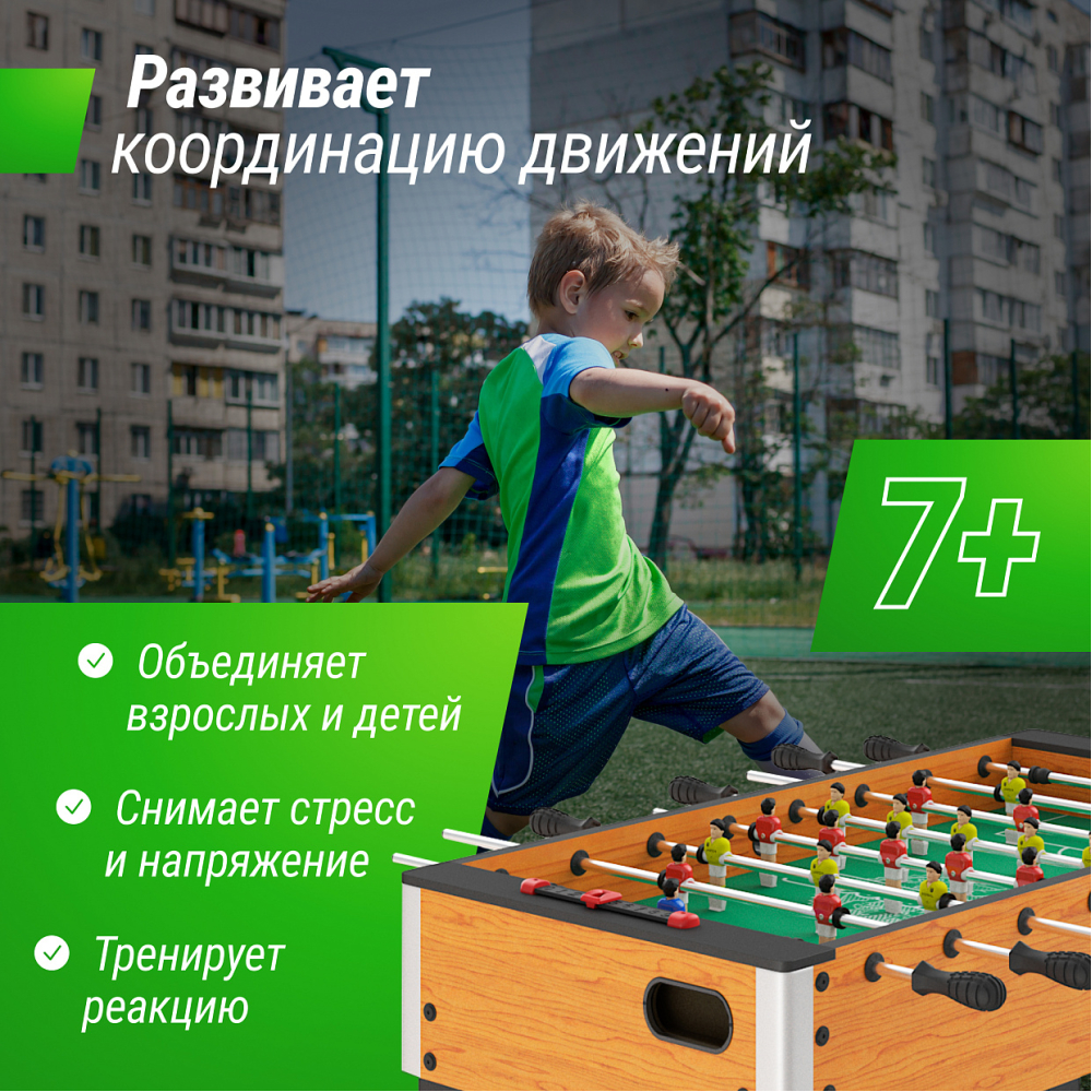 Игровой стол UNIX Line Футбол – Кикер Wood 122х64 cм - игра, которая принесет вам часы веселья, конкуренции и незабываемых моментов с друзьями и семьей! Игровой стол предлагает вам возможность окунуться в мир футбольных сражений, не выходя из дома. Наш настольный футбол обладает рядом преимуществ, которые сделают его вашим идеальным развлечением: 1. Превосходное качество: Мы предлагаем игровой стол, изготовленный из высококачественных материалов, что обеспечивает его прочность и долговечность. Вы можете наслаждаться игрой без беспокойства о поломках или износе. Вес стола 23 кг. 2. Реалистичный геймплей: Наш настольный футбол оснащен плавными и точными игровыми фигурками, которые позволяют вам контролировать мяч и создавать захватывающие комбинации. Вы почувствуете себя настоящим футбольным героем! Высота игроков 11 см, мяч 3,5 см. Все фигурки изготовлены из пластика. Стол оснащен механическим счетчиком забитых голов. 3. Веселое и соревновательное времяпрепровождение: Настольная игра, которая способна объединить людей. Вы сможете провести время весело и активно, соревнуясь с друзьями или семьей. Создайте свою собственную лигу или проведите турнир и ощутите азарт победы! 4. Подходит для всех возрастов: Напольный кикер подходит для игры как детям, так и взрослым. Это идеальное развлечение для вечеринок, семейных сборов или просто для проведения свободного времени. Не упустите возможность добавить в свою жизнь порцию веселья и азарта с нашим настольным футболом. Подарите себе и своим близким незабываемые моменты и станьте настоящими звездами футбольной арены! Преимущества - Механический счетчик возле каждого игрока - Набор аксессуаров в комплекте - Безопасные накладки - Встроенная ловушка для мячей - Нескользящие обрезиненные ручки - Скругленные углы - Безопасные материалы - Усиленная конструкцияРегулируемые по высоте ножки