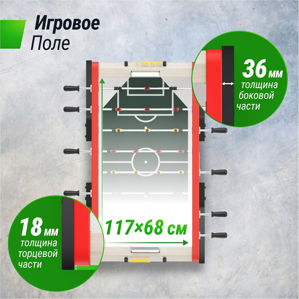 Игровой стол UNIX Line Футбол Кикер 140х70 см— это не просто игра, а целый мир захватывающих эмоций, командного духа и незабываемых моментов! Настольный футбол станет настоящим центром притяжения для ваших друзей, семьи и коллег, превращая каждую встречу в увлекательное соревнование. . Игровой стол изготовлен из МДФ повышенной прочности, что обеспечивает его долговечность и устойчивость к интенсивным играм. Сквозная штанга из хромированного железа обеспечивает максимальную маневренность и легкость. Прочные и надежные элементы гарантируют, что настольный футбол прослужит долгие годы, сохраняя при этом отличные игровые характеристики . Компактный стол имеет продуманную конструкцию, которая обеспечивает комфортную игру для пользователей любого роста. Удобные ручки и оптимальное расположение фигурок позволяют легко управлять игрой и делать точные передачи, создавая атмосферу настоящего футбольного матча. Настольная игра футбол оборудована механическим счетчиком очков. . Напольный игровой стол выполнен в современном и привлекательном дизайне под натуральное дерево, который отлично впишется в любой интерьер — от домашнего до офисного. . Стол легко чистится и не требует особого ухода. Просто протрите поверхность влажной тканью после игры, чтобы он всегда выглядел как новый. . . Футбол кикер — это игра, которая объединяет людей всех возрастов. Он станет отличным развлечением как для детей, так и для взрослых. Проведите время с семьей, организуйте турнир с друзьями или просто расслабьтесь после тяжелого рабочего дня — этот стол подарит вам массу положительных эмоций! . . Преимущества . - Механический счетчик возле каждого игрока . - Набор аксессуаров в комплекте. - Встроенная ловушка для мячей . - Нескользящие обрезиненные ручки. - Безопасные материалы . - Ножки толщиной 33 мм. - Хромированные штанги Ø 15,8 мм. - Легкий монтаж. - Удобные скаты с обоих сторон для доставания забитых мячей. - Прочные опоры для устойчивости. - Вся продукция сертифицирована. - Скругленные углы. - Мощный каркас. - Игровое поле с разметкой. - Металлические ворота. .