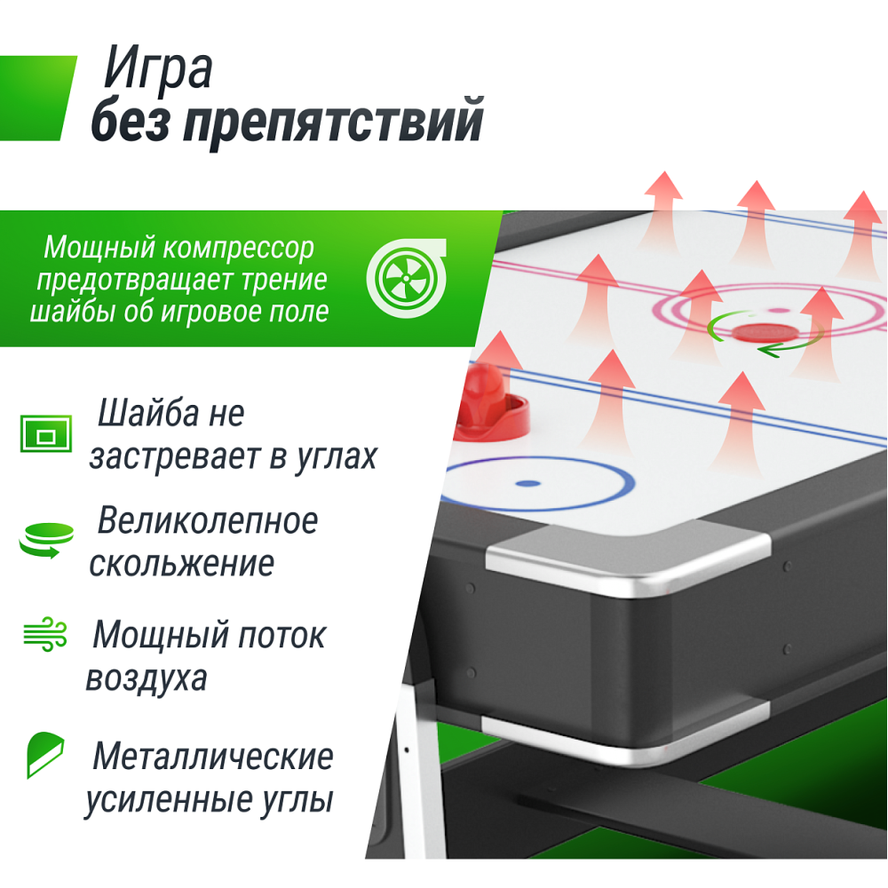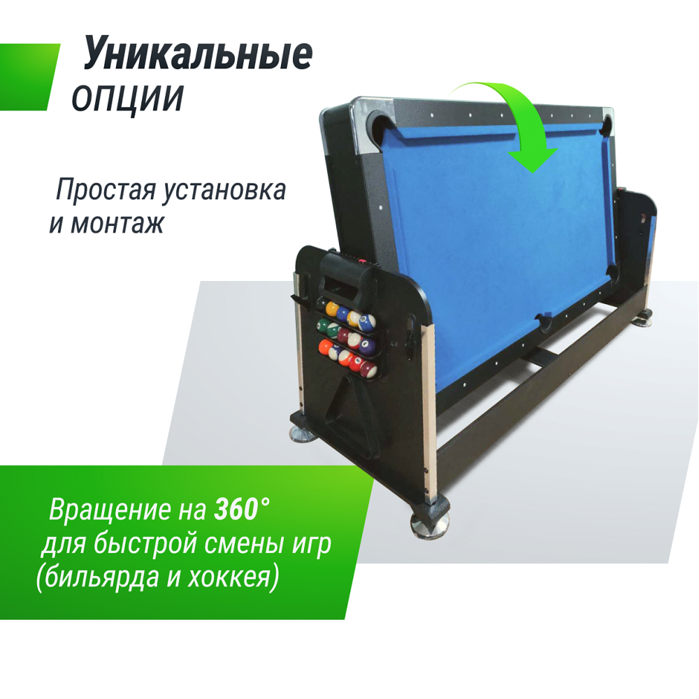 | Размер игрового поля (см) | бильярд: 179,2 х 87,7 см; аэрохоккей: 184,9 х 94,4 см; теннисный стол: 179,2 х 87,7 см |